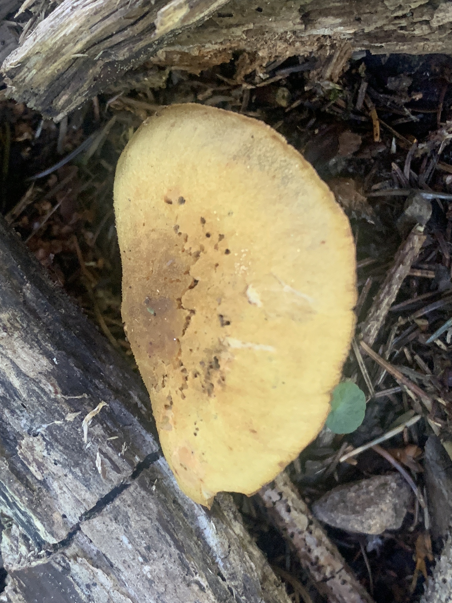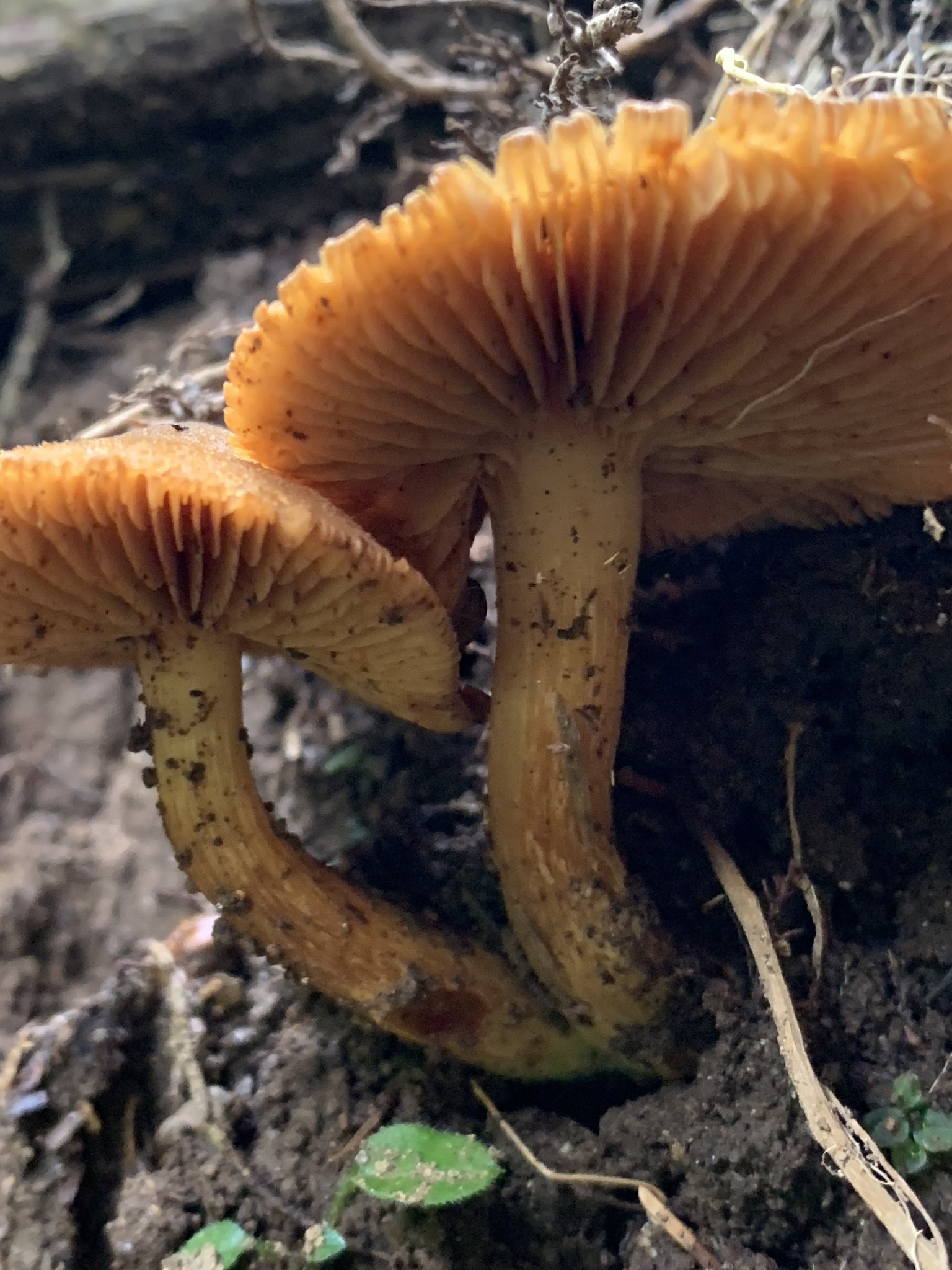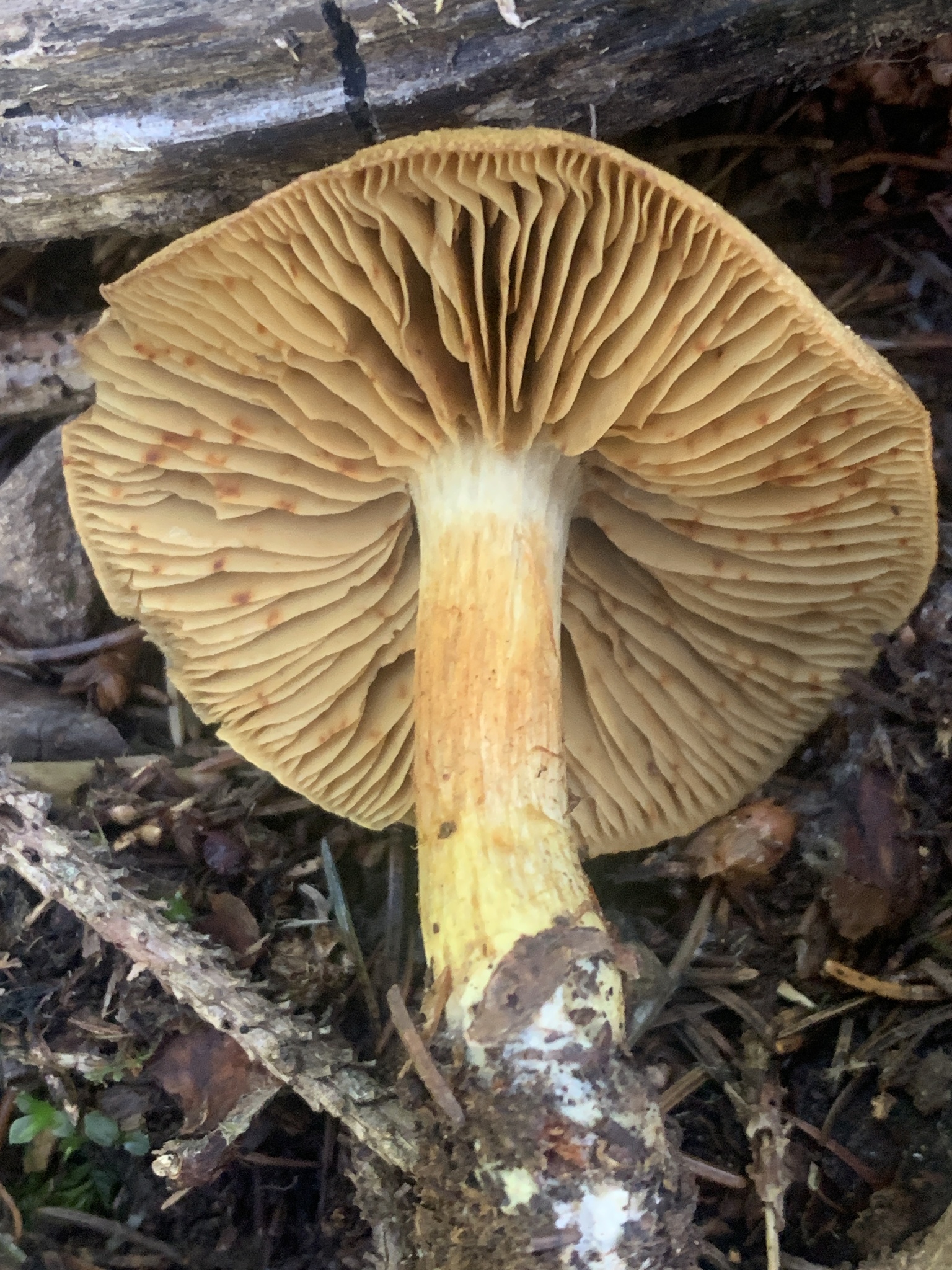 Stiel: wie der Hut gefärbt, Velum olivgelb, Basis oft etwas keulig verdickt, alt rotbräunlich ausser in der Spitze, Ring flüchtig
