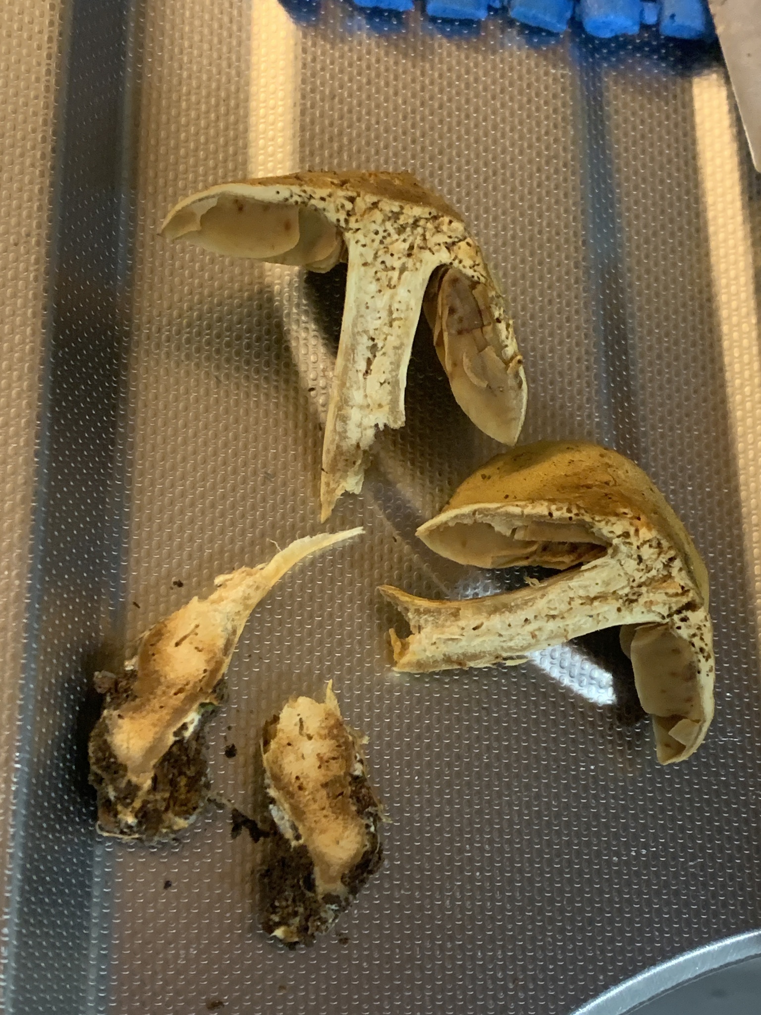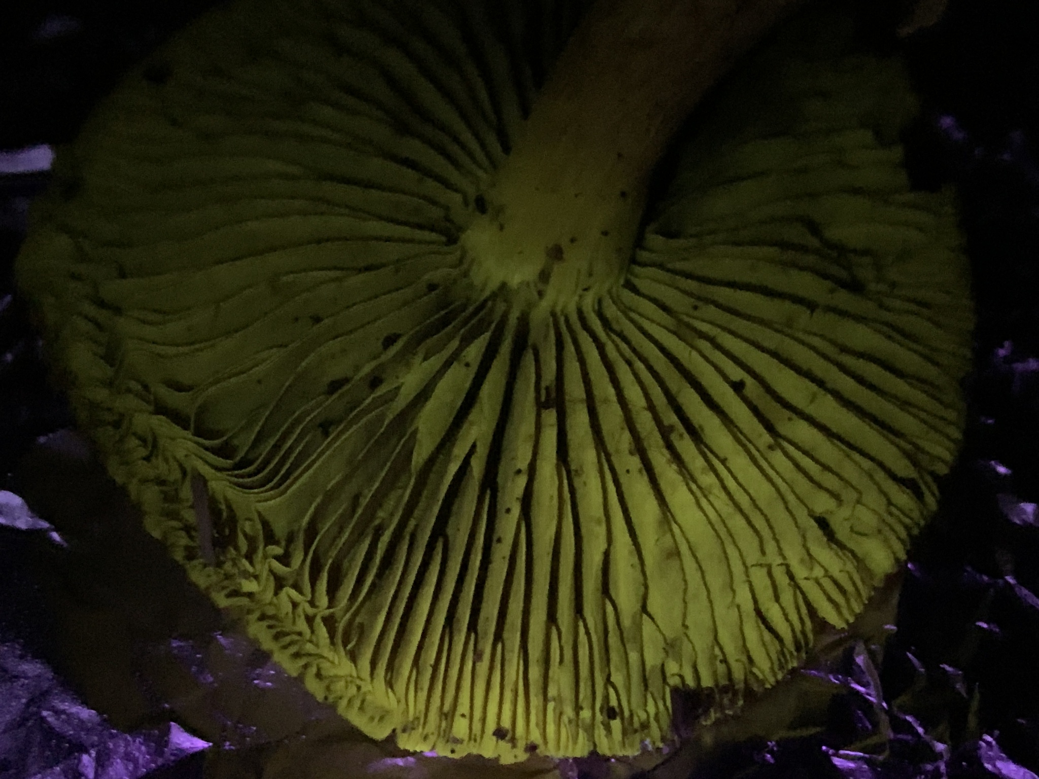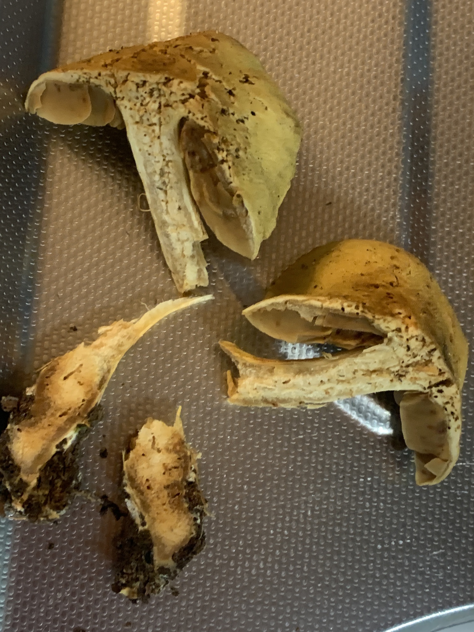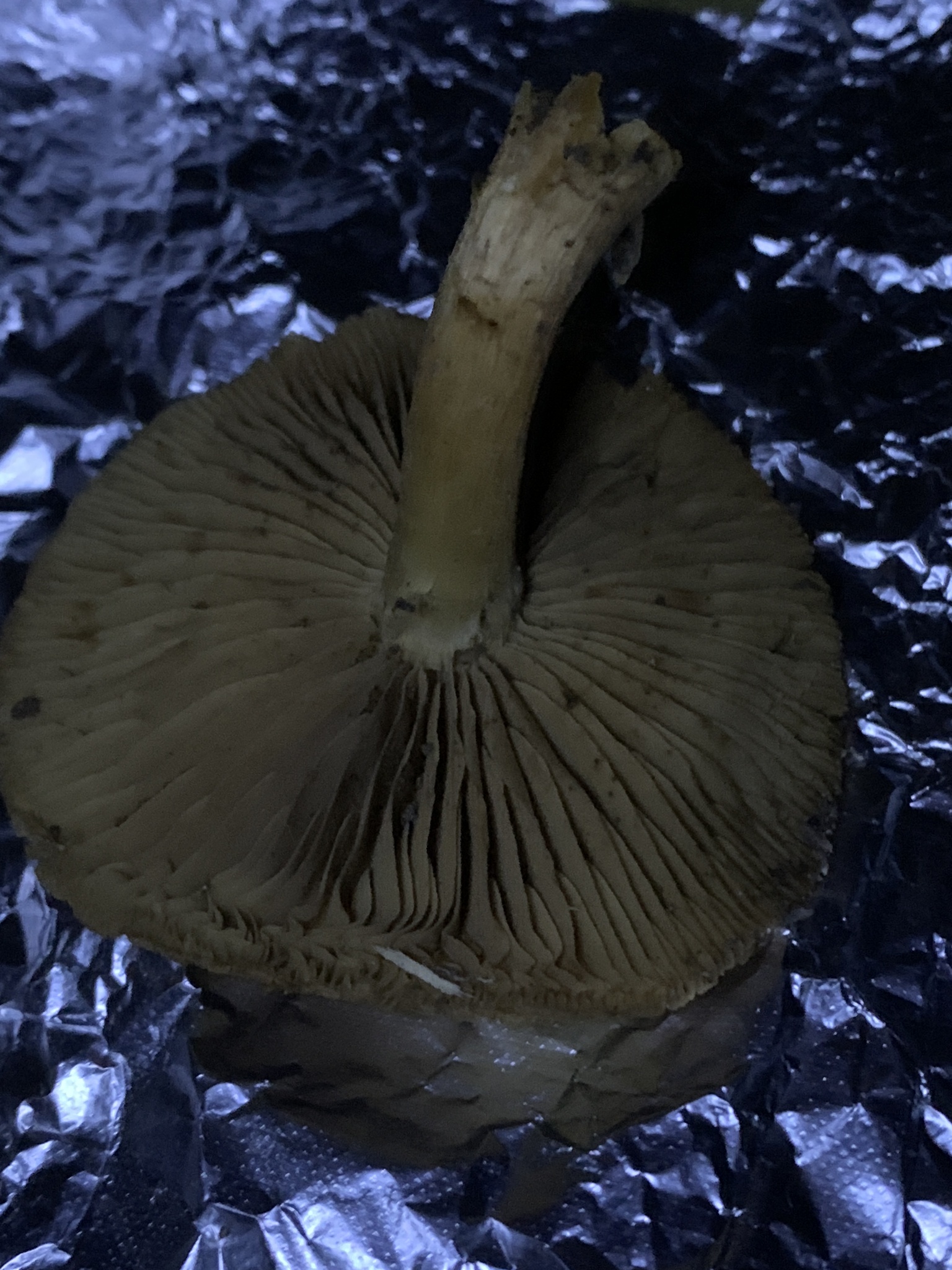 Lamellen: ausgebuchtet angewachsen, olivgrün, später bräunlich, Schneiden heller.