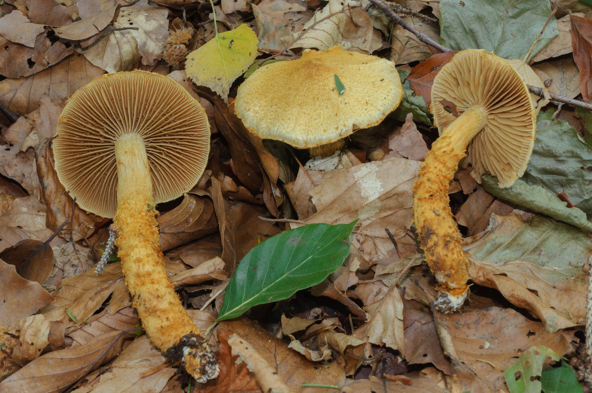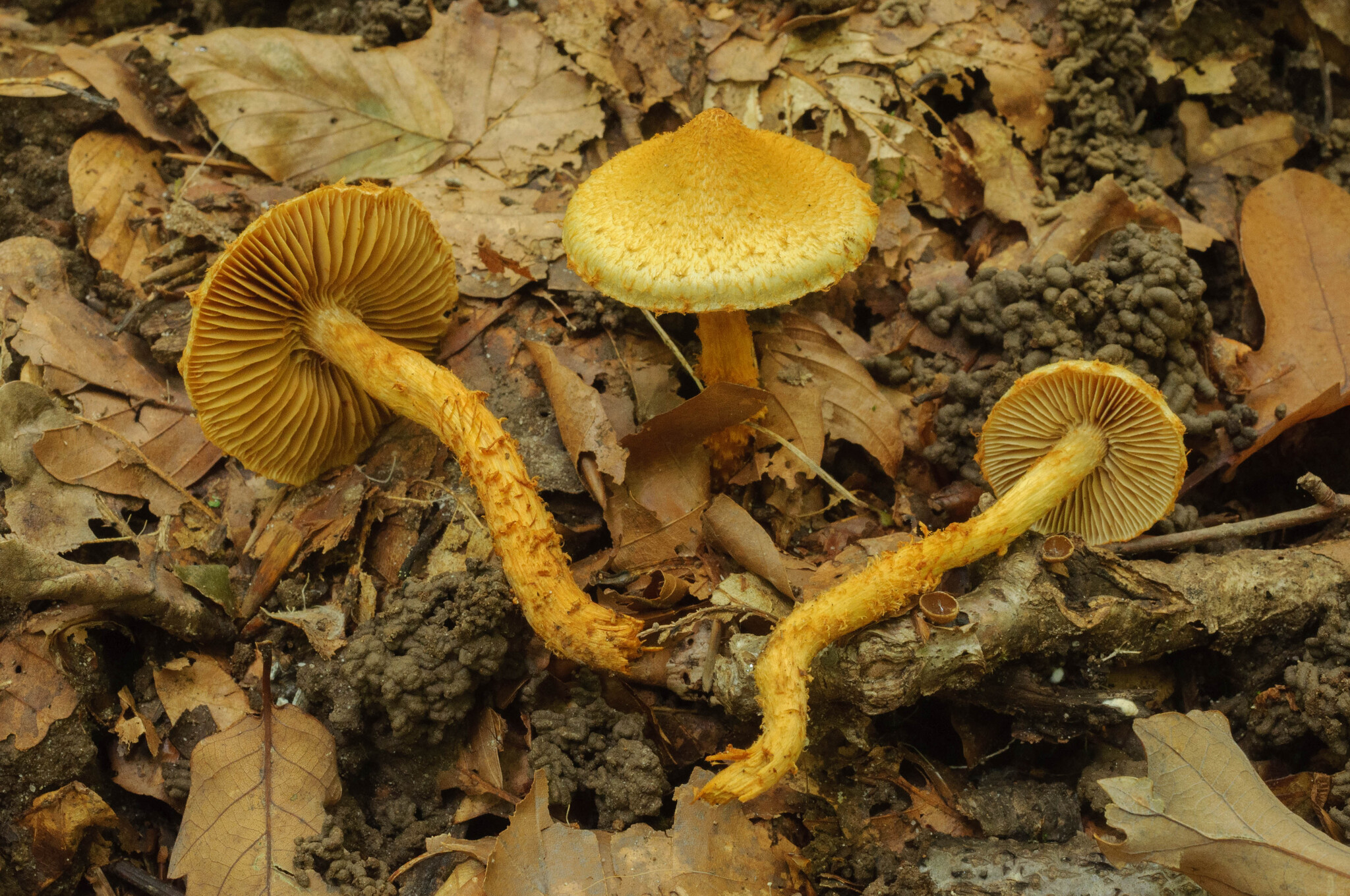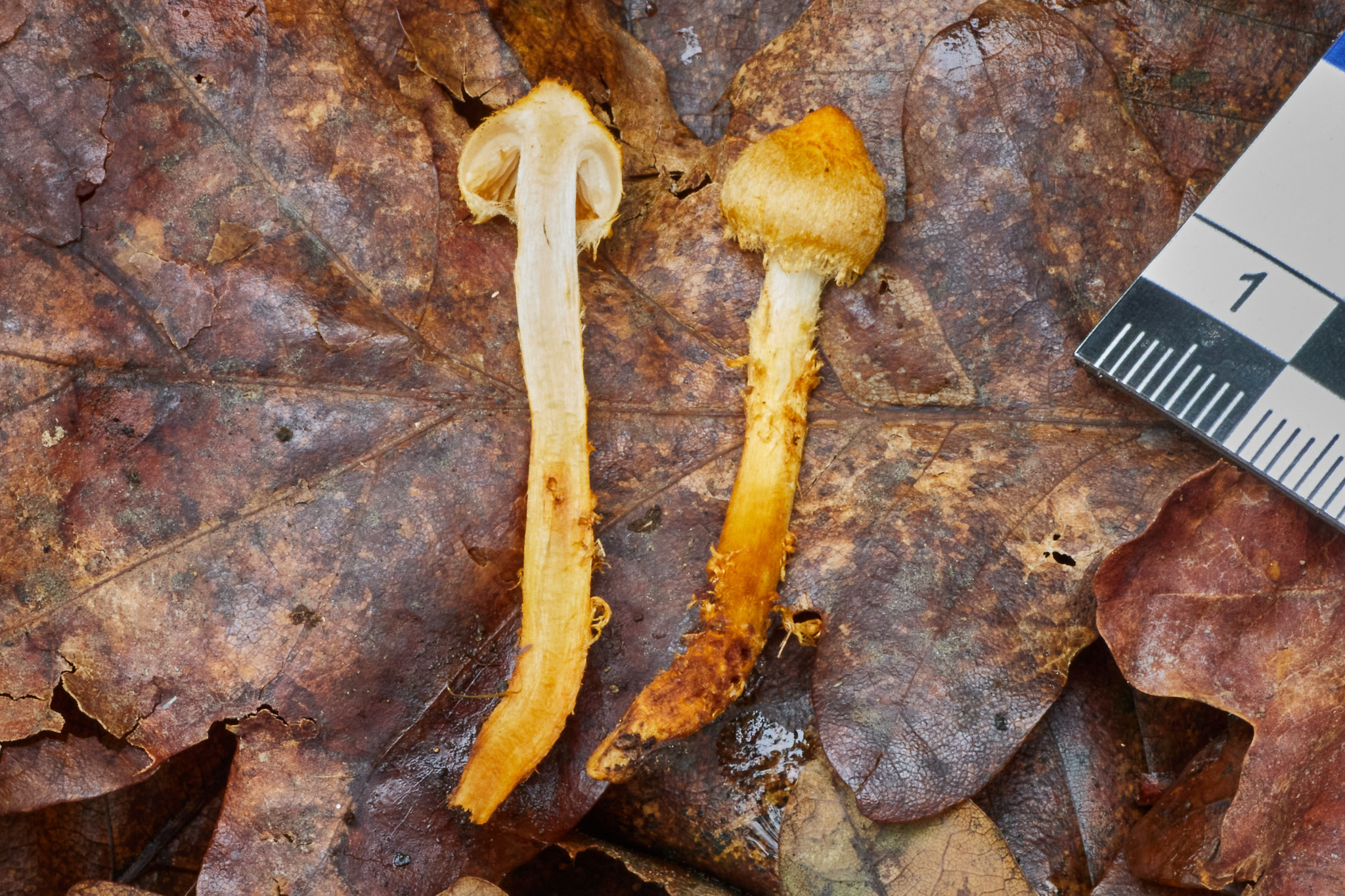 Stiel: spindelförmig, verdreht, Spitze heller, faserig, gelb bis gelbbraun, abwärts mit gelbbräunlichen bis ockerbräunlichen Schuppen bedeckt, Stielbasis verjüngt.