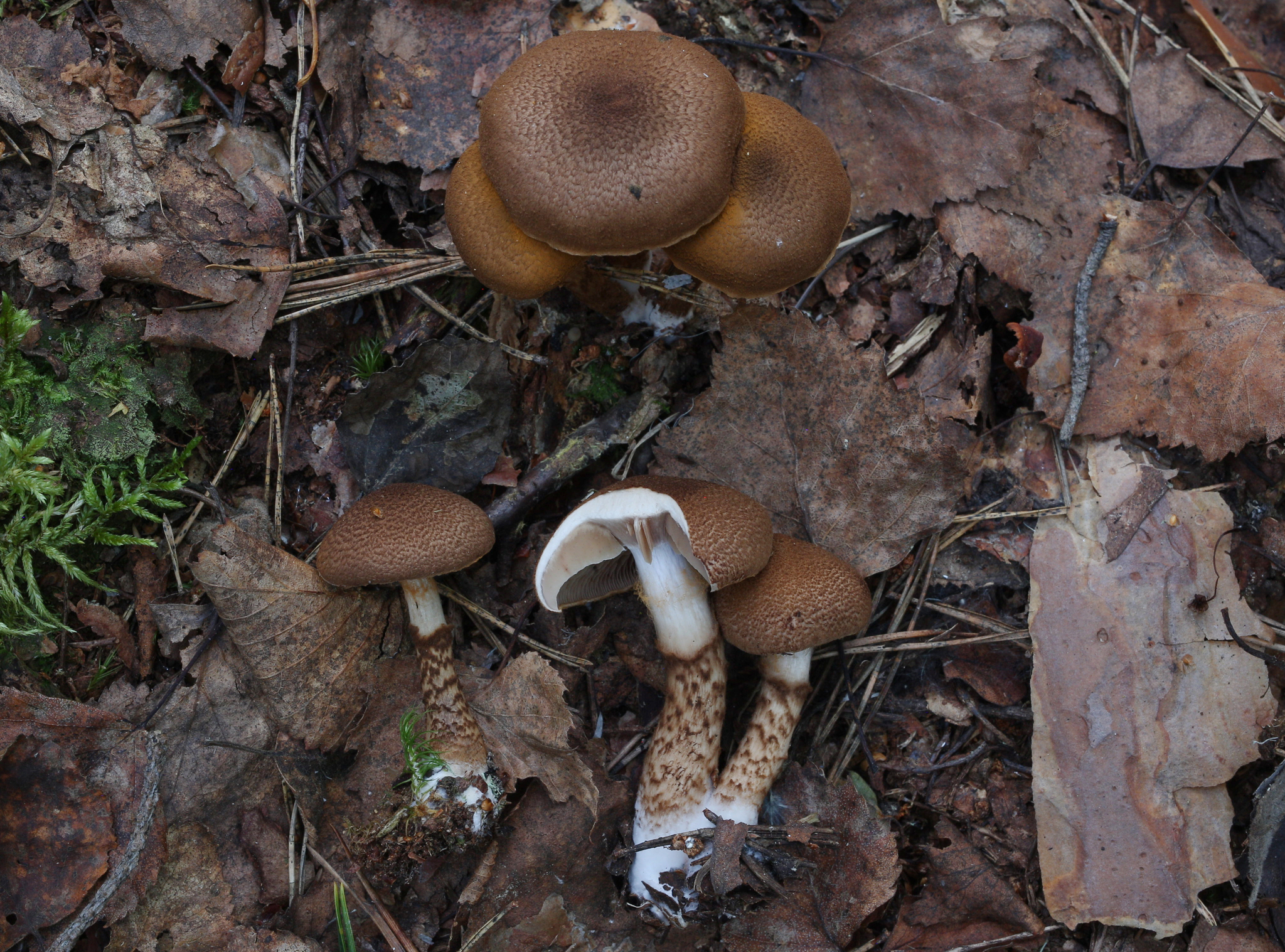 Stiel: Spitze glatt, jung blass violett später weiss, unter Ringzone braun genattert bis sparrig geschuppt