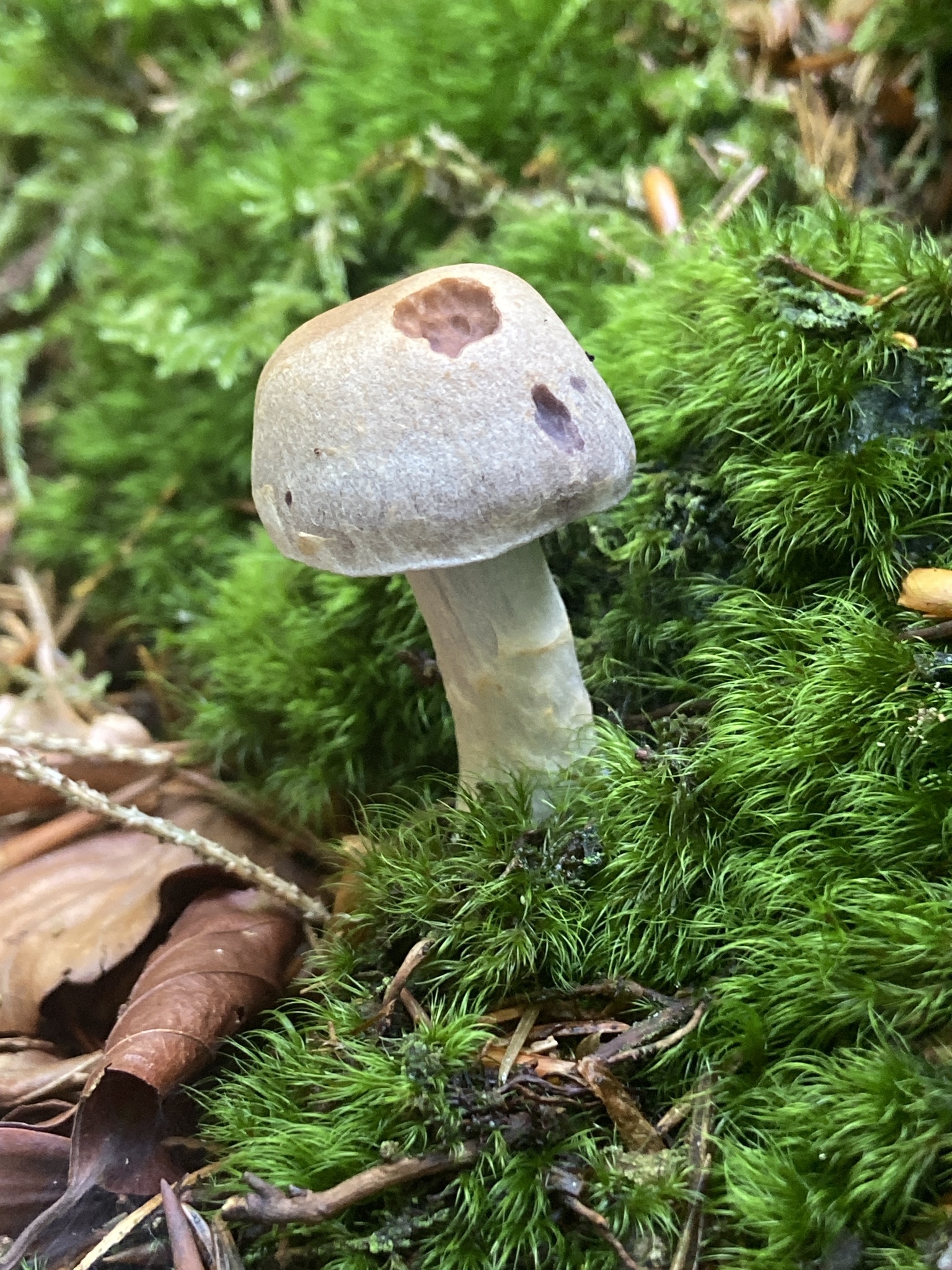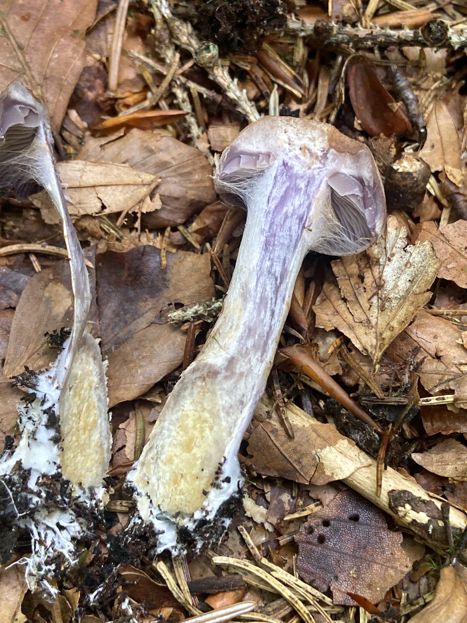 Lamellen: gedrängt, schwach ausgebuchtet, mit Zahn herablaufend, jung blau-purpur, später zimtbraun