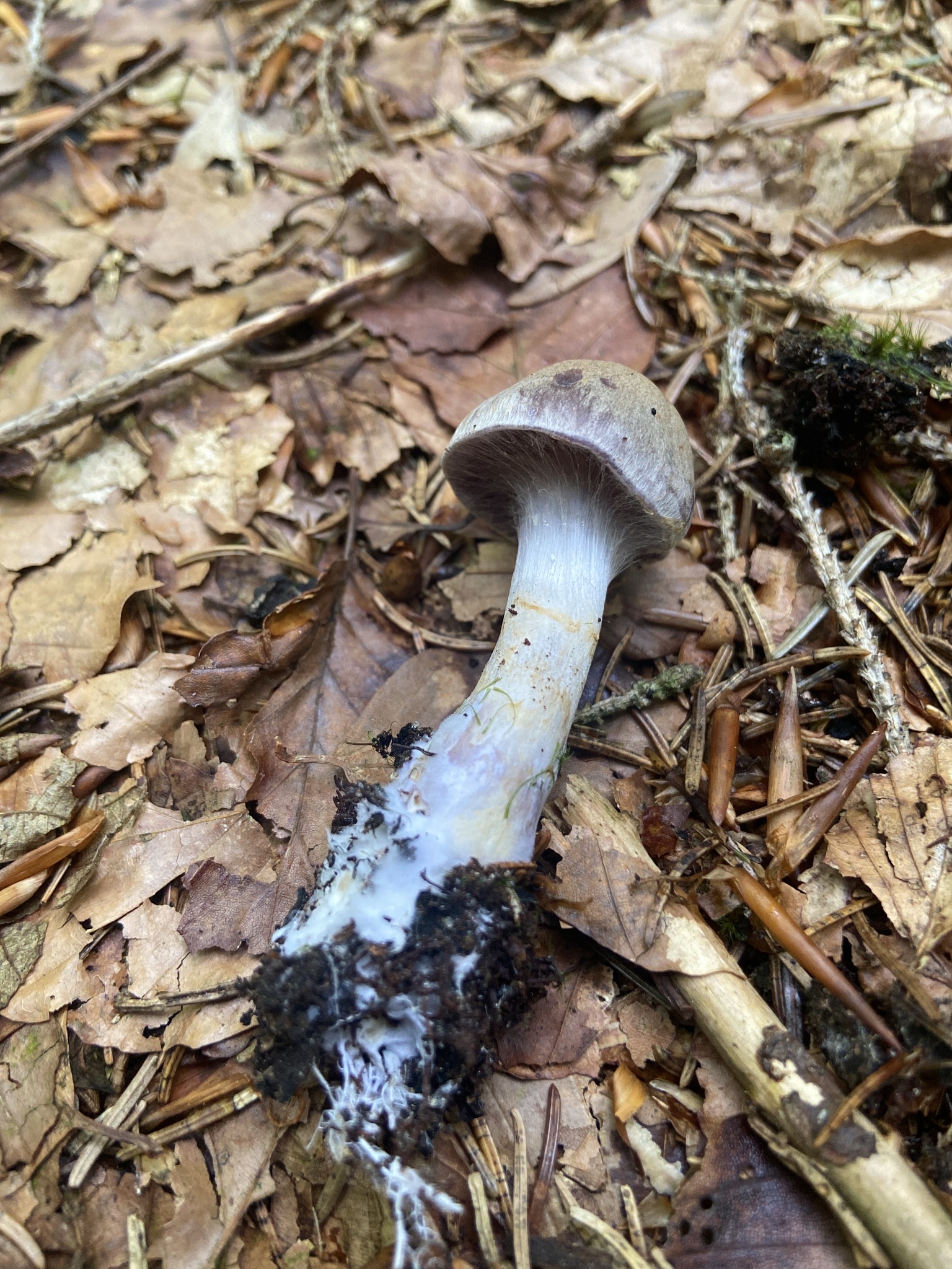 Stiel: ziemlich voll, schlank, faserig, schwach schuppig, weisslich, unterhalb rötlichgelben Ringzone leicht gelblich gegürtelt, Spitze violett verblassend, Basis u.U. keulig verdickt.