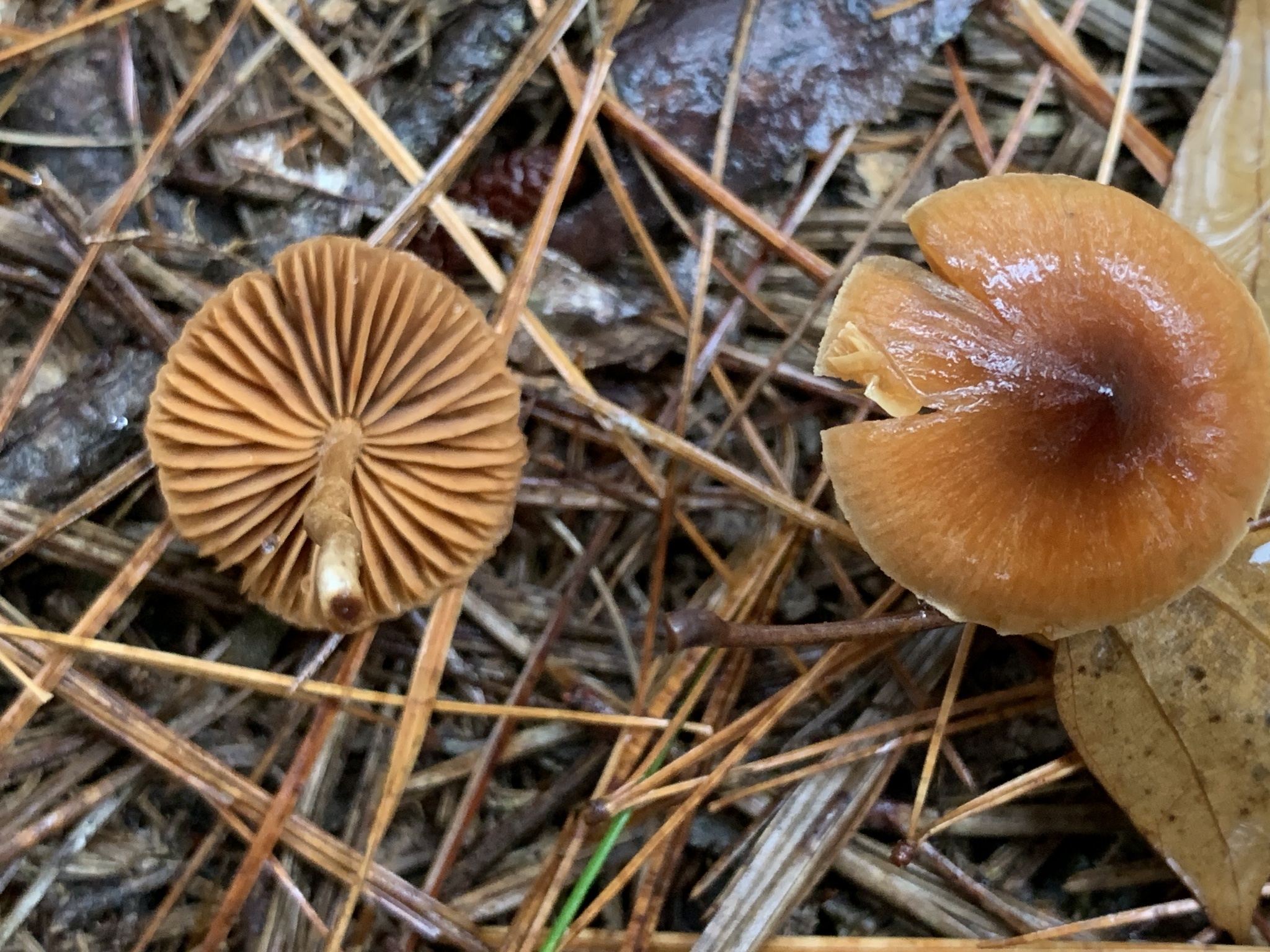 Hut: gewölbt bis ausgebreitet, gebuckelt tz), lebhaft rötlichbraun, Rand rötlichgelb.