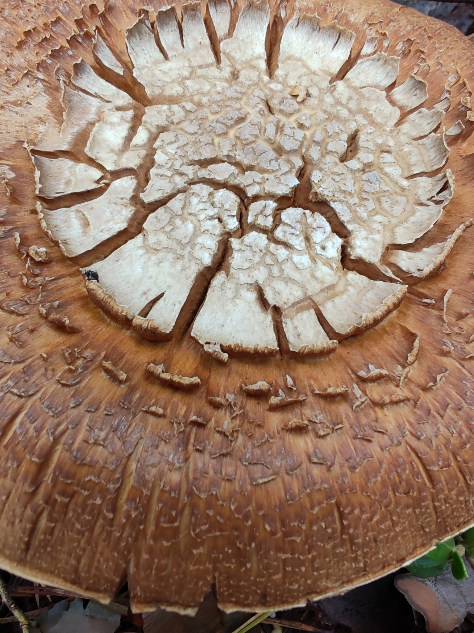 Hut: jung glockenförmig gewölbt, dann flacher gewölbt, gebuckelt, matt bis fein faserig filzig, orangebraun bis rötlichbraun, später graubraun, Randbereich mit weissen Velumresten.