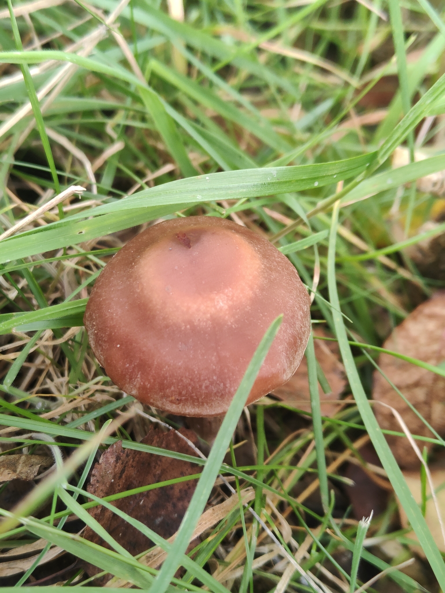 Hut: jung gewölbt, dann flach, schwach gebuckelt oder auch etwas eingedellt, alt wellig verbogen, glatt, hygrophan, feucht glänzend, satt rotbraun bis rötlich orangebraun, Rand meist riefig und mit weissen Velumresten behangen.