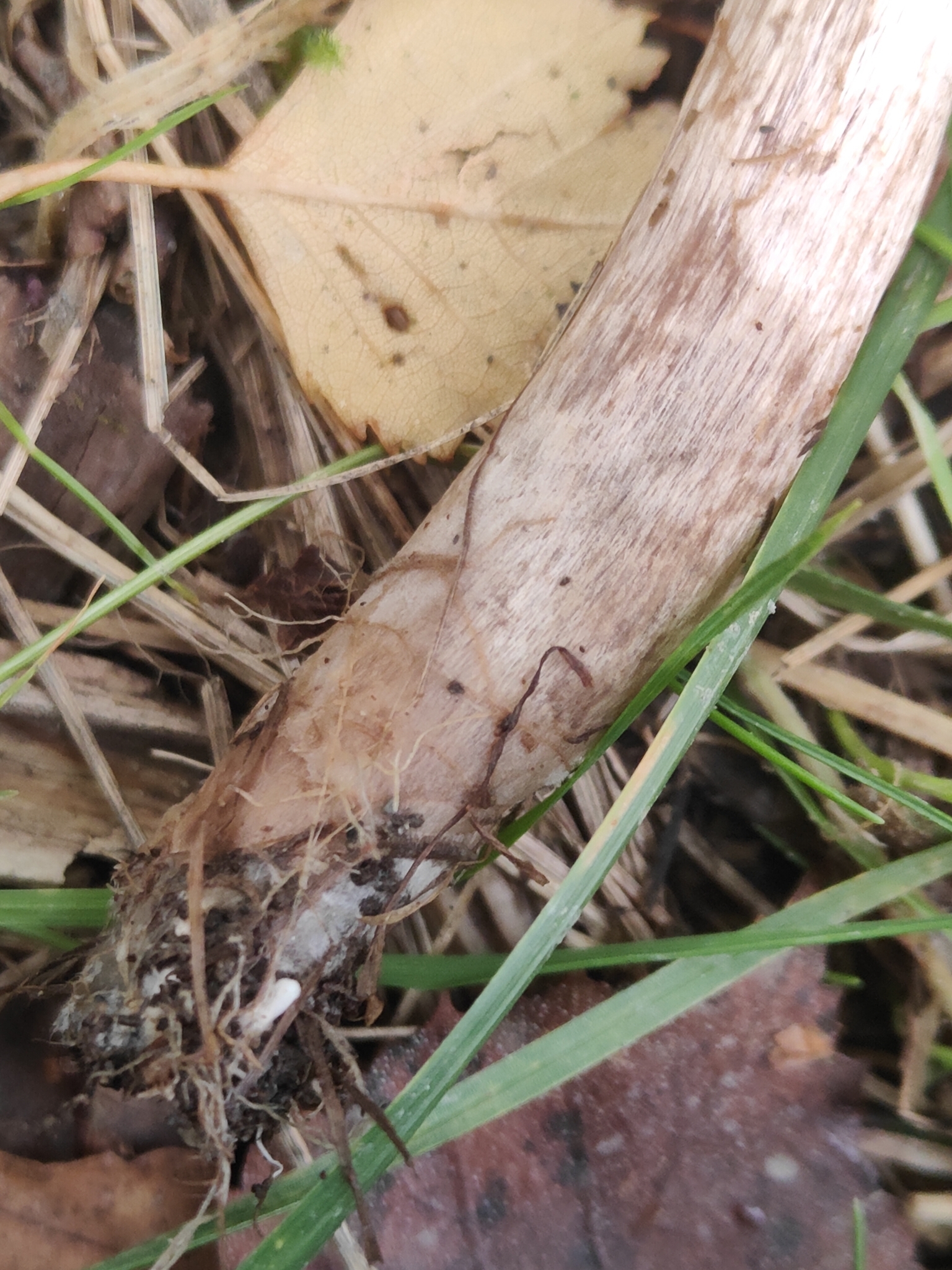 Stiel: erst weiss, später rotbräunlich bis orangebraun, zur Basis zunehmend weisslich faserig, Basis mit kugelförmig verdickter Basis.
