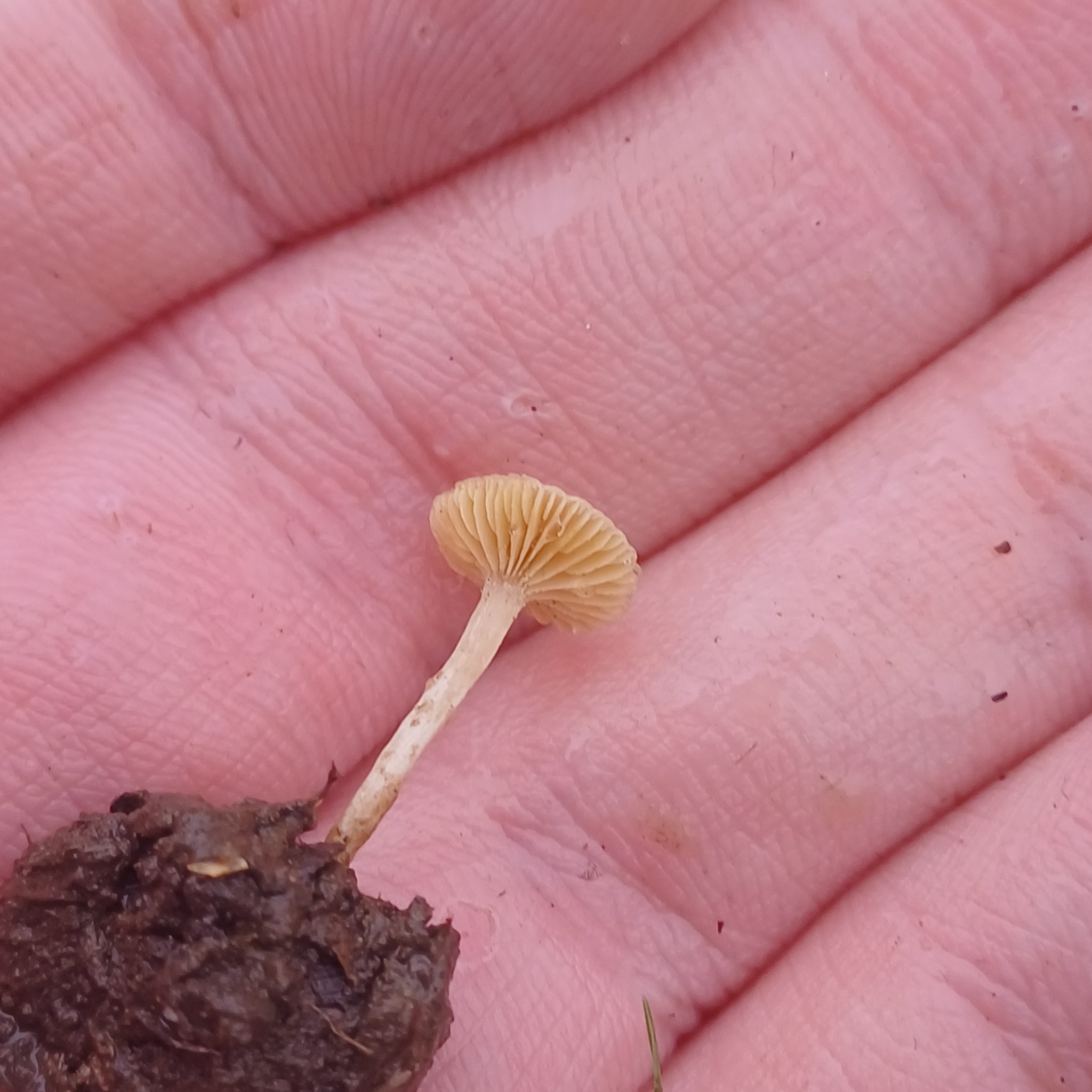 Hut: 0.5–2 cm im Durchmesser, konvex, dann flach, später zentral eingedrückt; ocker-beige, Rand gerieft; sehr fein filzig.Stiel: 15–30x1–2 mm, nach oben verdickt und oft gewellt; weißlich.Fleisch: Weißlich; Geschmack und Geruch unauffällig.Lamellen: Blass zitronengelb, später mit ockerfarbenem Schimmer.Sporen: 4.5–7.5x2.5–5 µ, elliptisch, sehr fein rau.Sporenabdruck: Ockerfarben