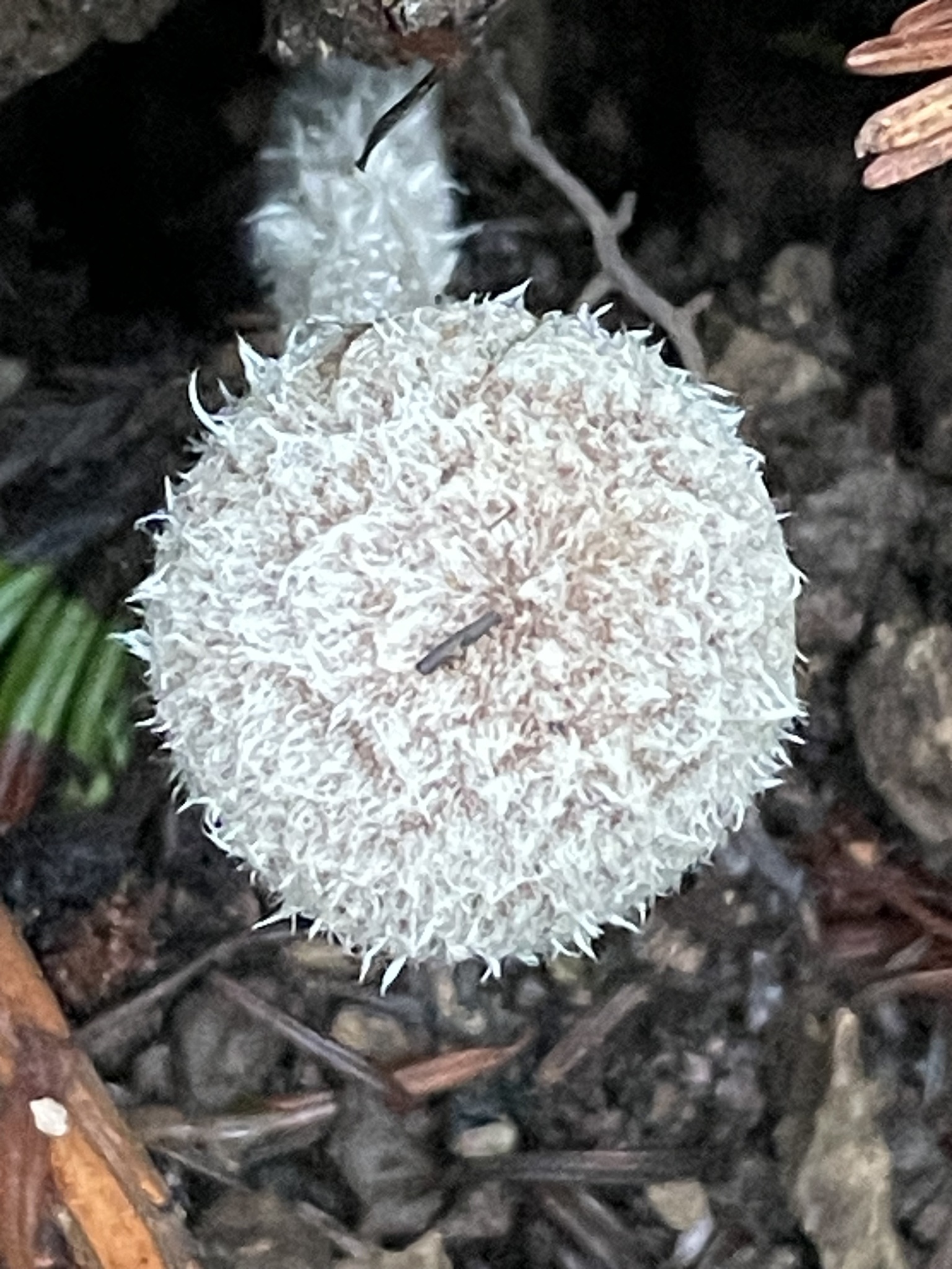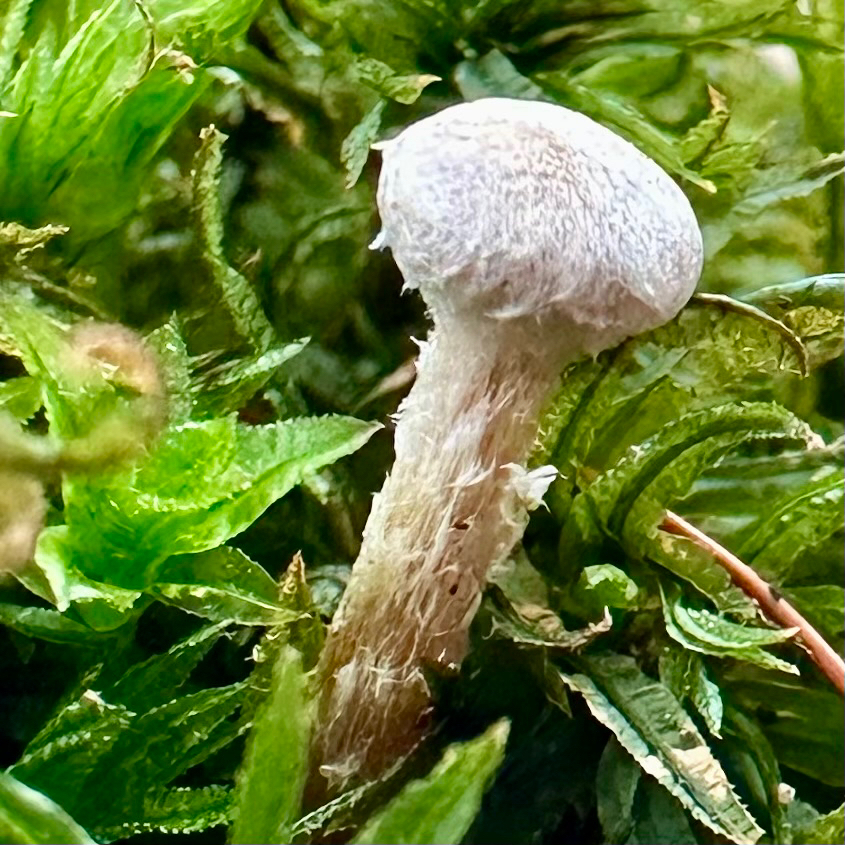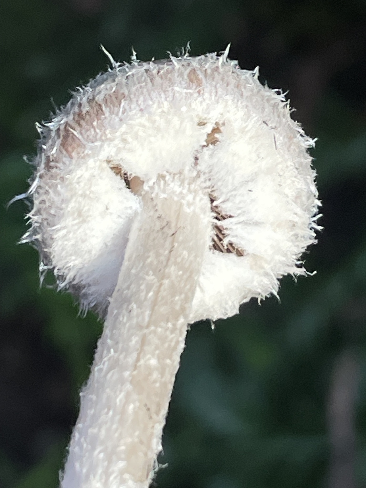Stiel: fein weisslich flockig faserig, wie der Hut gefärbt, Basis weiss filzig.
