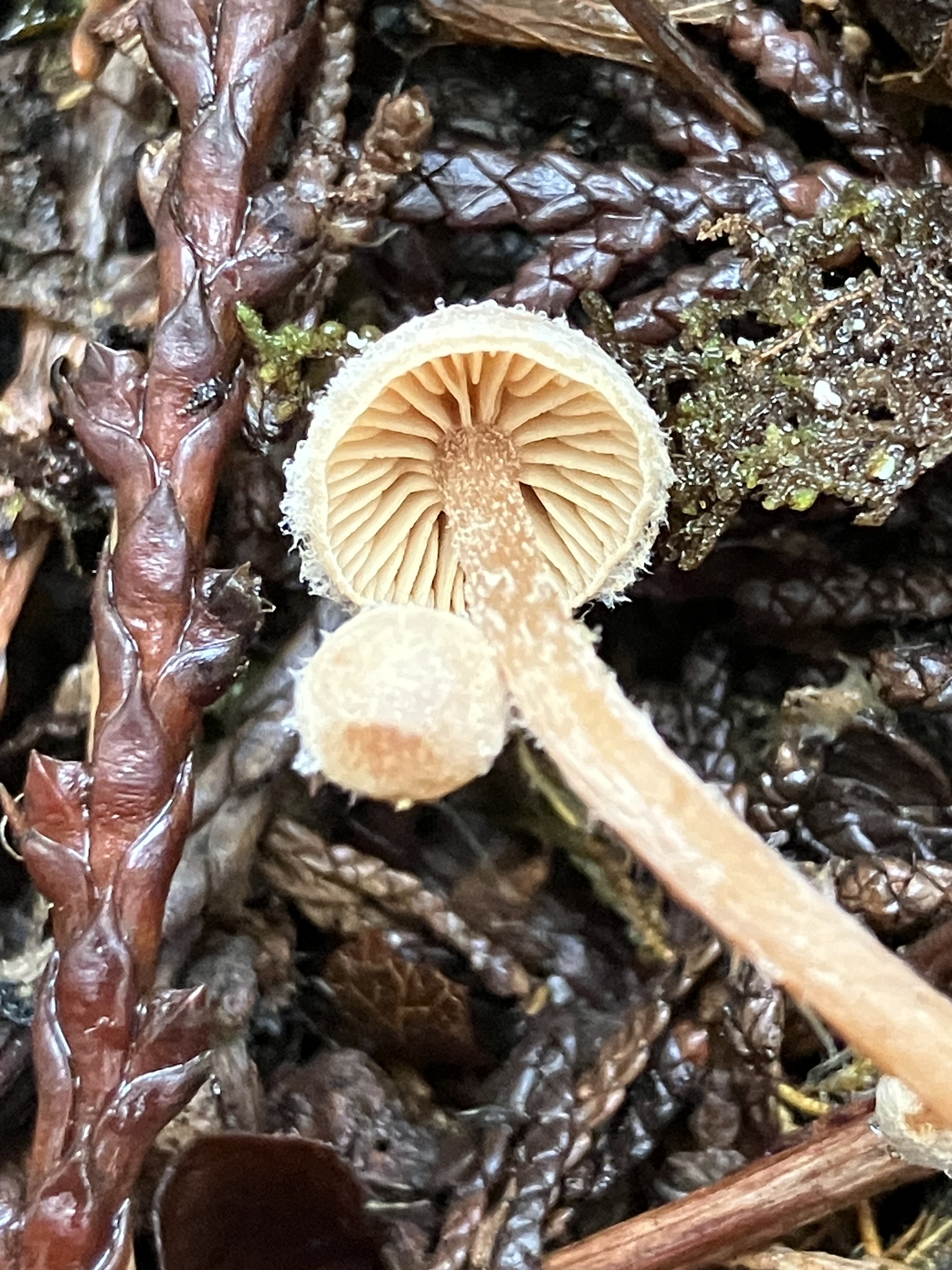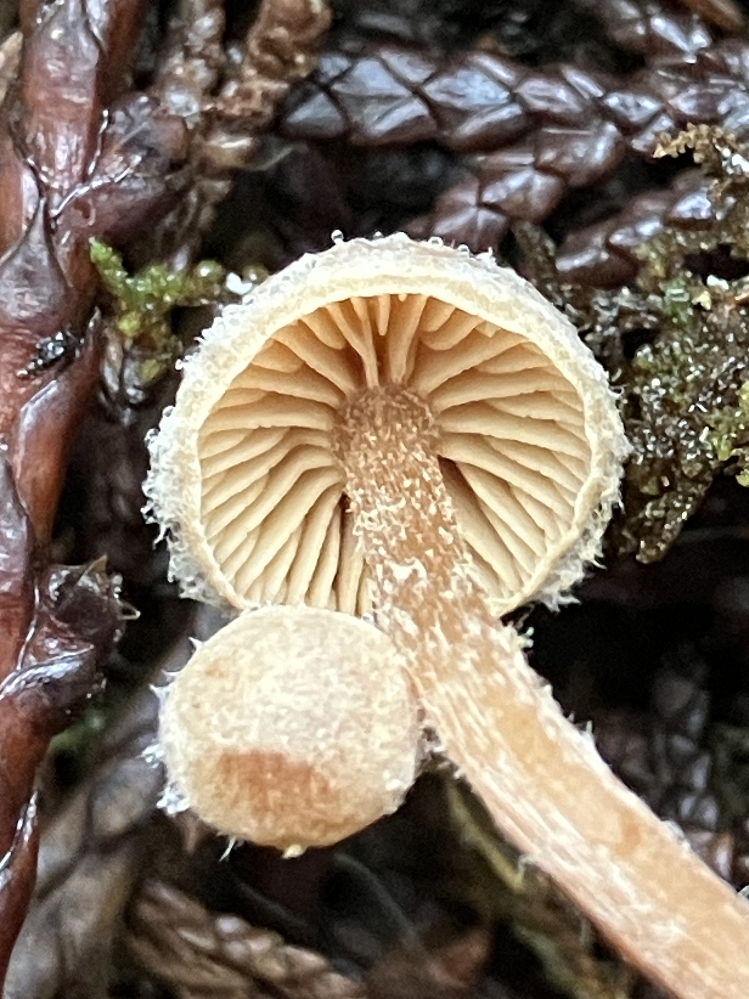 Hut: flach gewölbt, stumpf, glatt, gelbbraun bis rötlichbraun, fein weiss langfaserig-schuppig, besonders im Randbereich, kaum gerieft.
