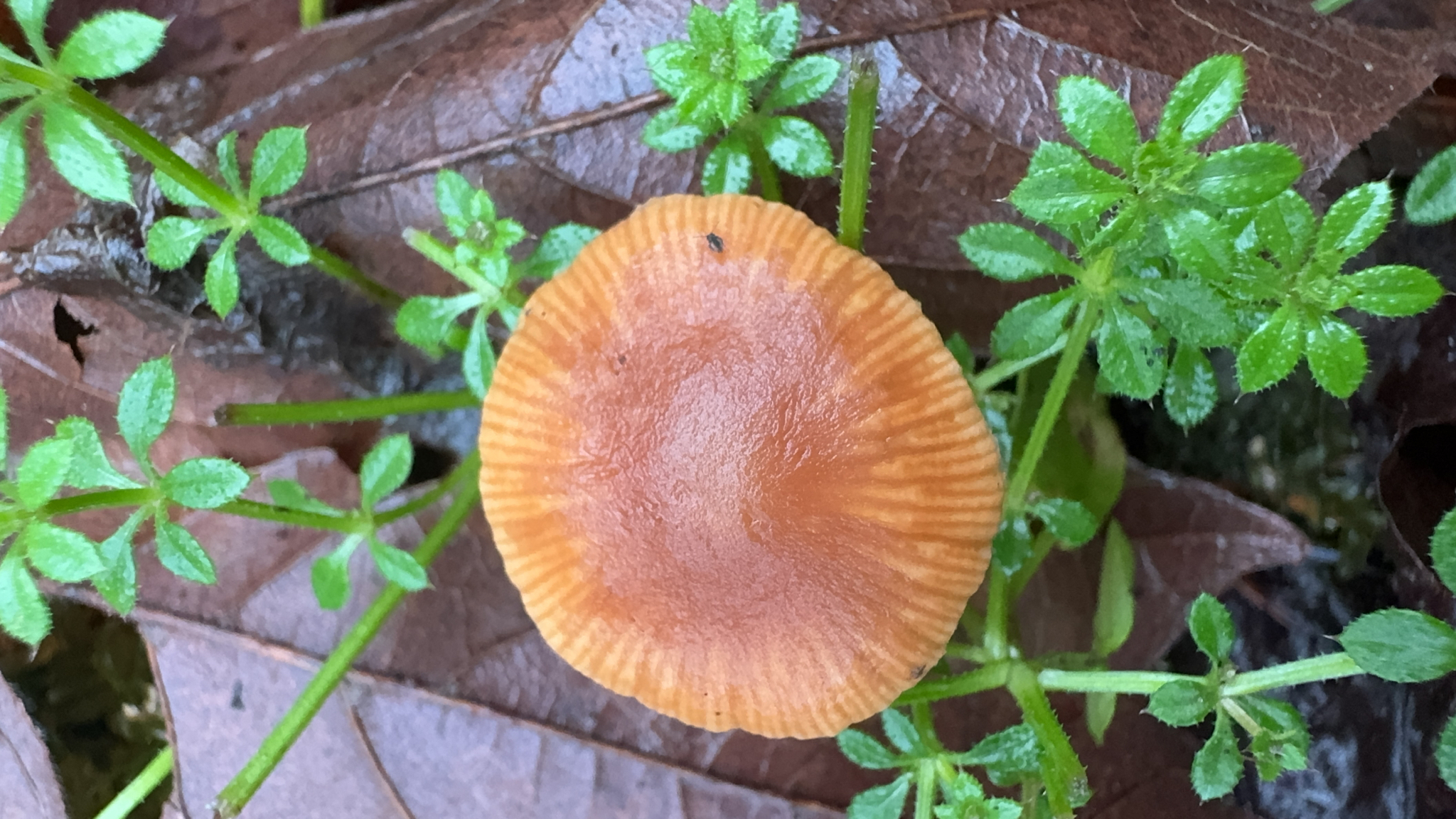 Hut: konvex gewölbt bis mehr oder weniger flach, auch leicht depressiv, hygrophan, feucht: rotbraun mit gerieftem Rand, trocken: blassbraun, glatt bis fein samtig, nicht schmierig, Rand bisweilen mit weisslichen Velumflöckchen besetzt, Rand bei Nässe durchscheinend