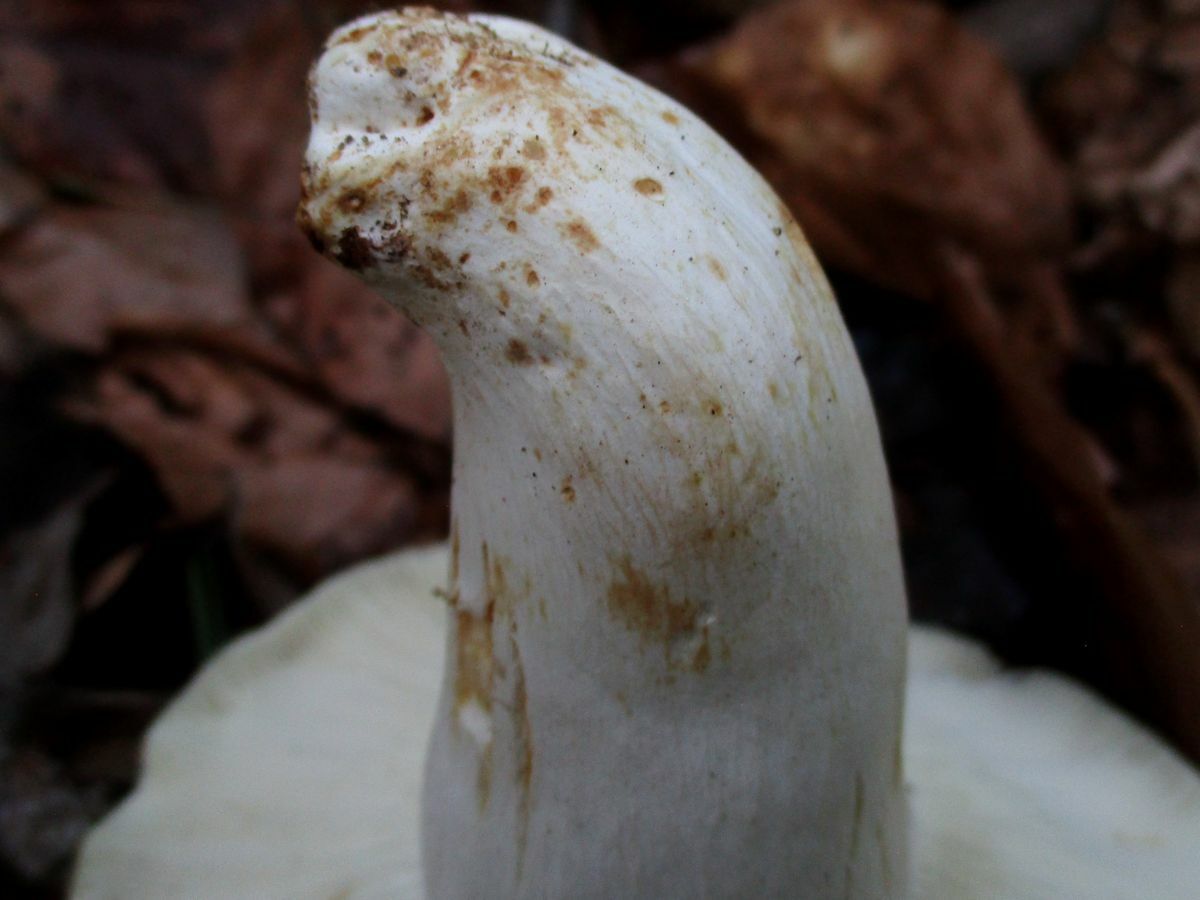Stiel: zylindrisch, voll, fest, weiss, Basis meist zugespitzt und gelbbraun fleckend.