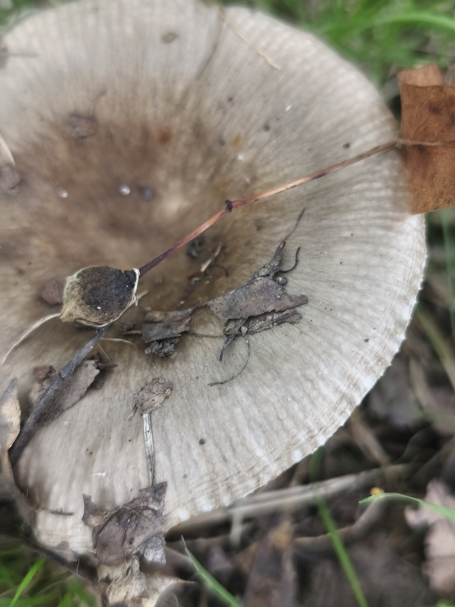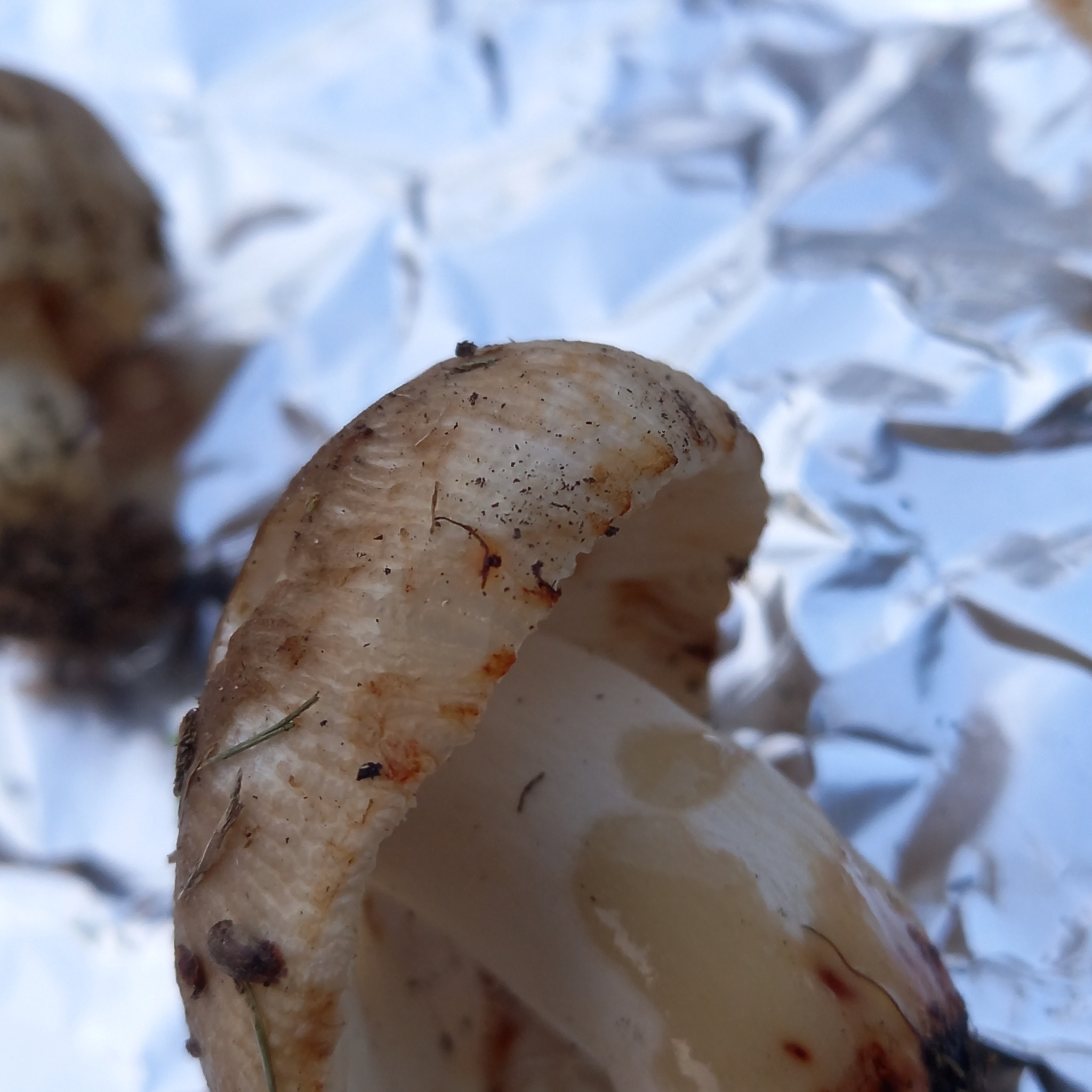 Lamellen: jung blass weisslich bis creme, alt schmutzig und fleckig, tränend, entfernt, frei.