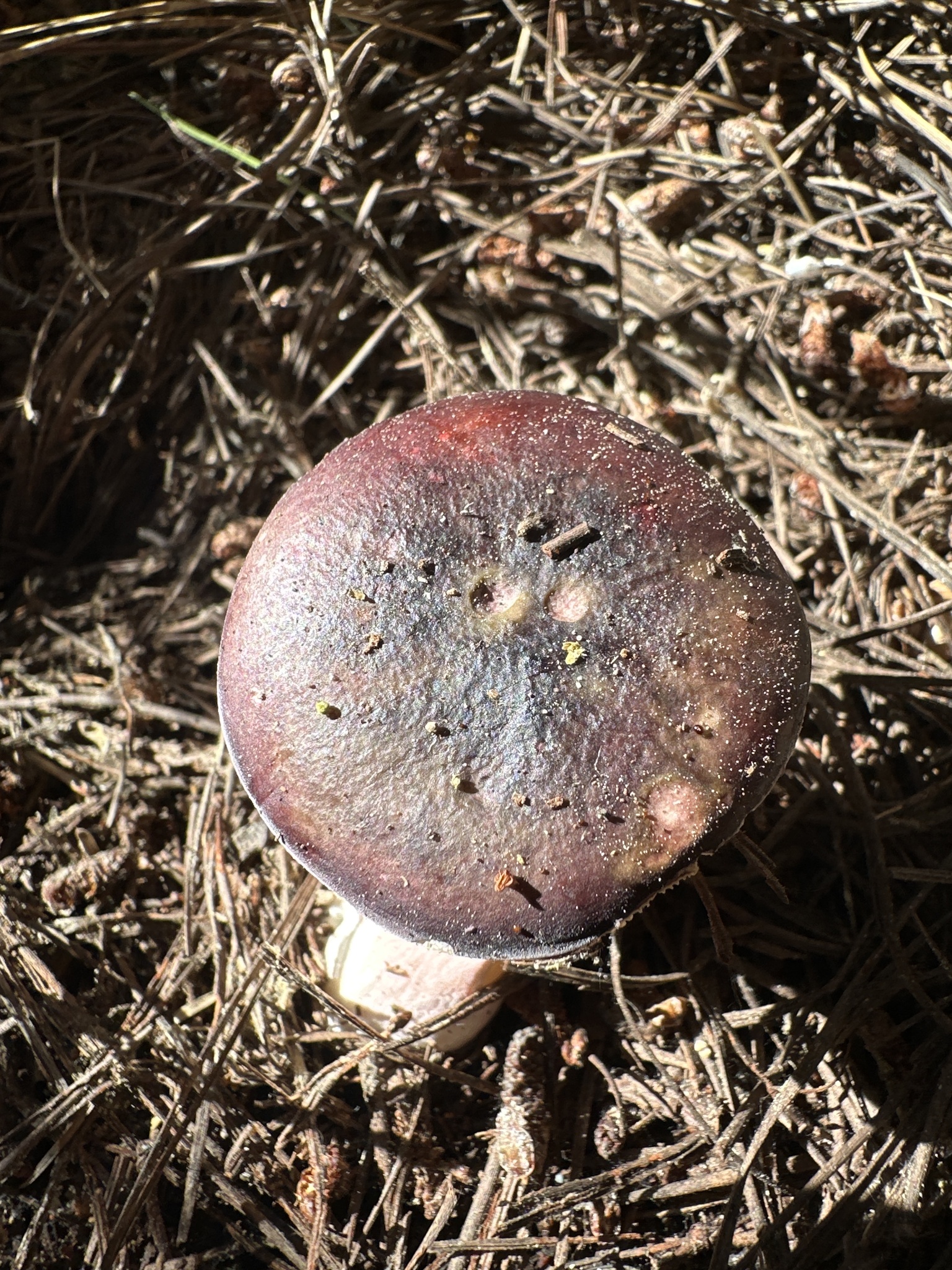 Hut: jung halbkugelig, dann konvex bis flach, manchmal schwach gebuckelt, trüb weinrot, dunkelweinrot, später ausbleichend, auch etwas oliv gescheckt, Rand leicht gerieft, Huthaut mehr als zur Hälfte abziehbar