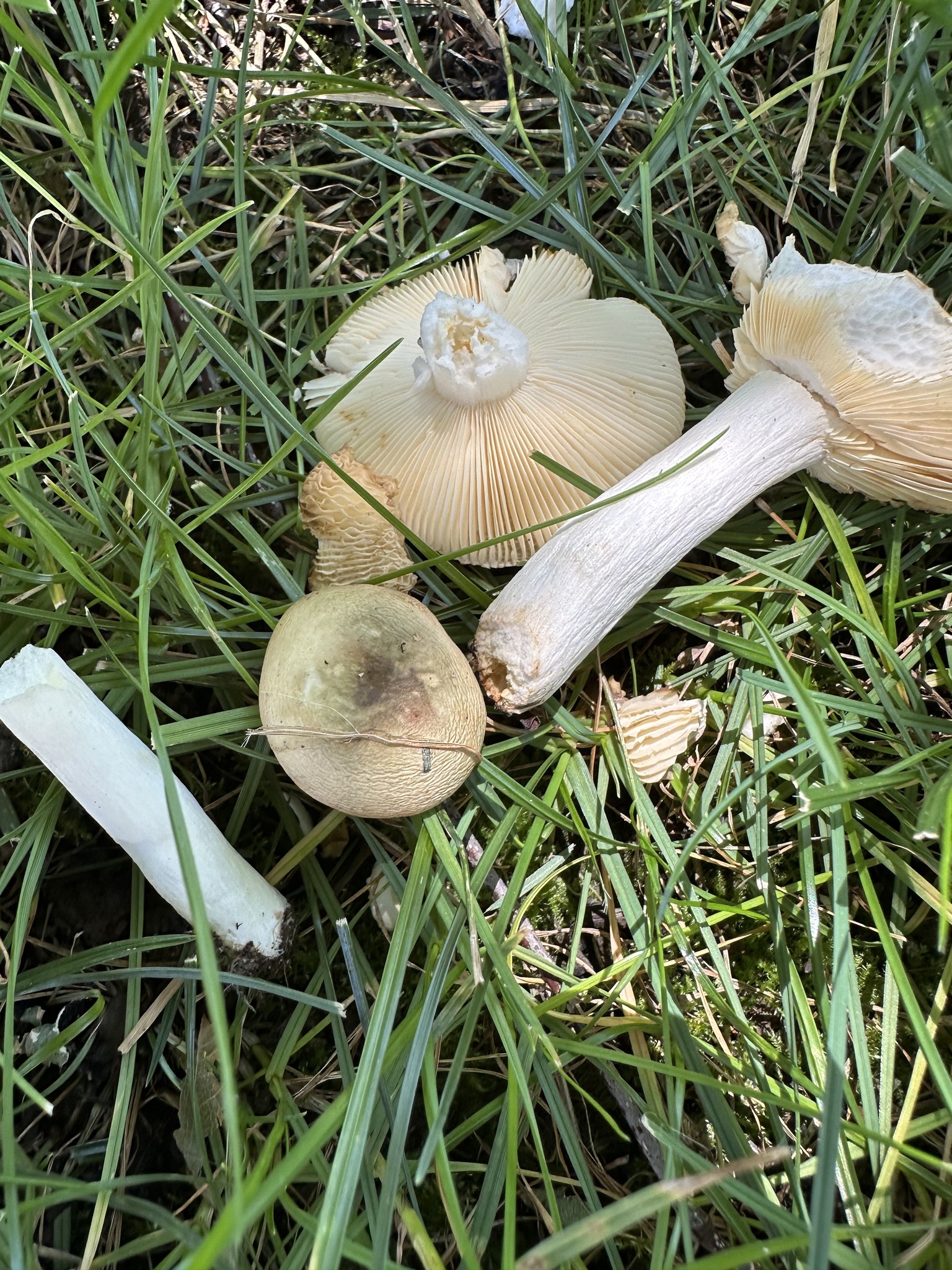 Kappe 1,5–6 cm im Durchmesser, bald abgeflacht, Rand normalerweise gefurcht, klebrig bei Feuchtigkeit; normalerweise blass, eine Mischung aus Farben einschließlich buff, grünlich-gelb, rosa oder vinotrot.Stiel 20–50 x 10–30 mm; matt weiß, gelblich-ocker verfärbend; zerbrechlich; fast vollständig abziehbar.Fleisch weiß; weich; Geruch angenehm, Geschmack mild bis ziemlich scharf.Lamellen blass ockerfarben.Sporen 6–8 x 4–6 µm, subglobos; Warzen bis zu 0,6 µm hoch, isoliert oder mit wenigen Verbindungen, manchmal sogar netzartig.Sporenabdruck mittelgelb