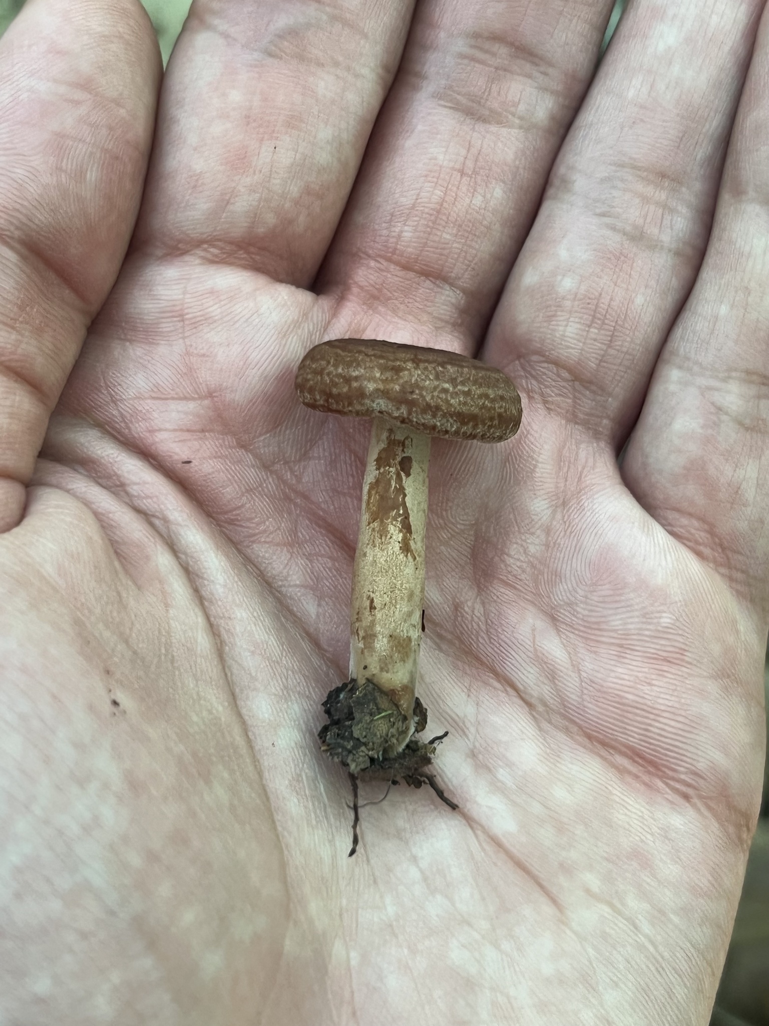 Hut: ausgebreitet niedergedrückt, stumpf, jung klebrig, trüb rotbraun mit helleren, bereiften Zonen