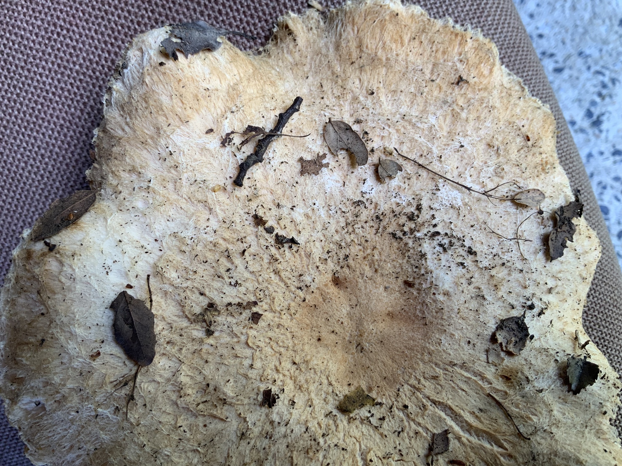 Hut: stark konvex bis sphärisch, bald mittig eingedellt, alt trichterig bis Untertassenform mit Nabel, cremeweiss bis lila-lederfarben, filzig-zottig und unregelmässig verbogen, besonders am Rand.
