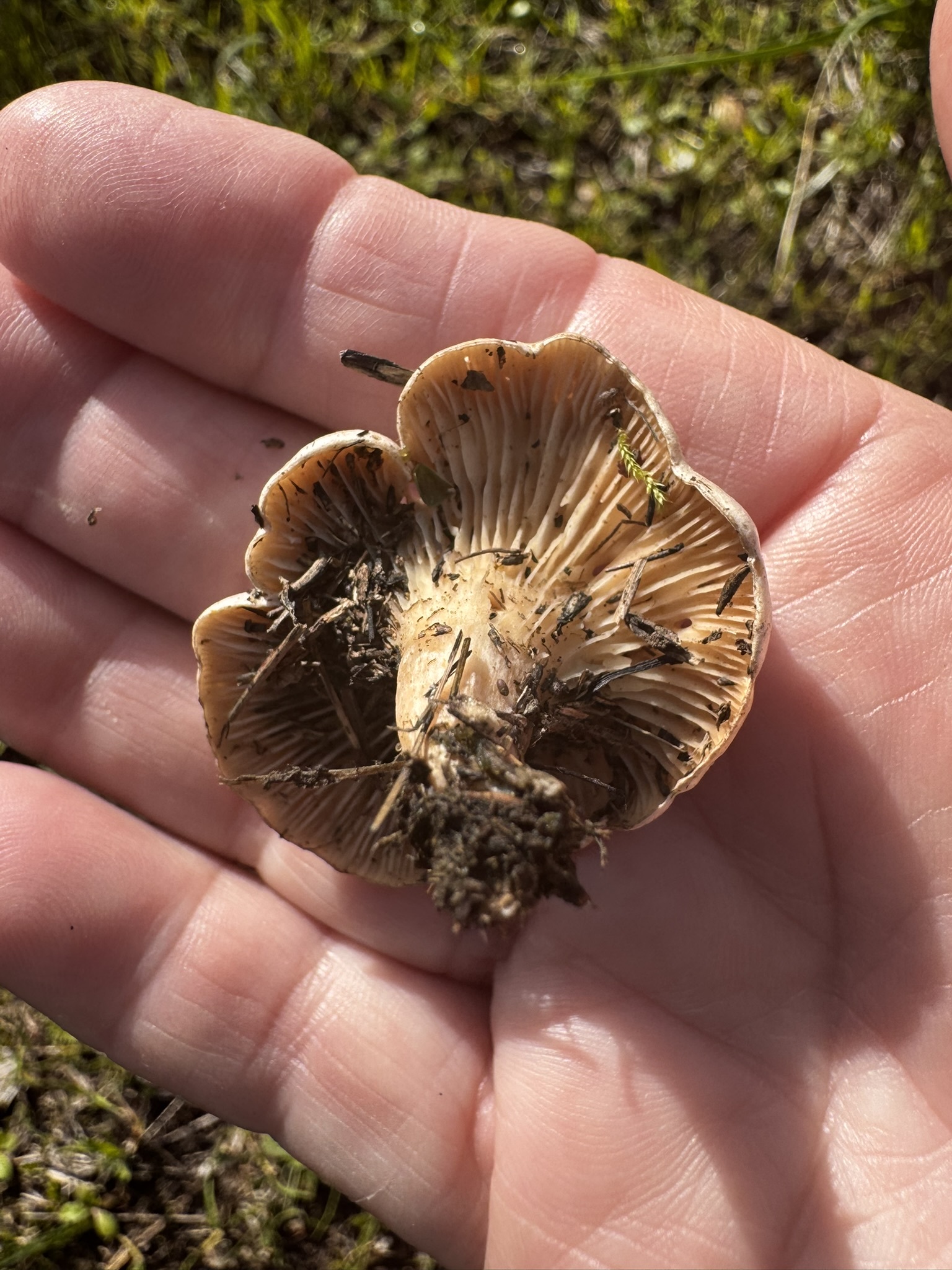 Lamellen: stark herablaufend, weisslich, später graugelblich, weich, entfernt stehend, am Stiel mit Querverbindungen