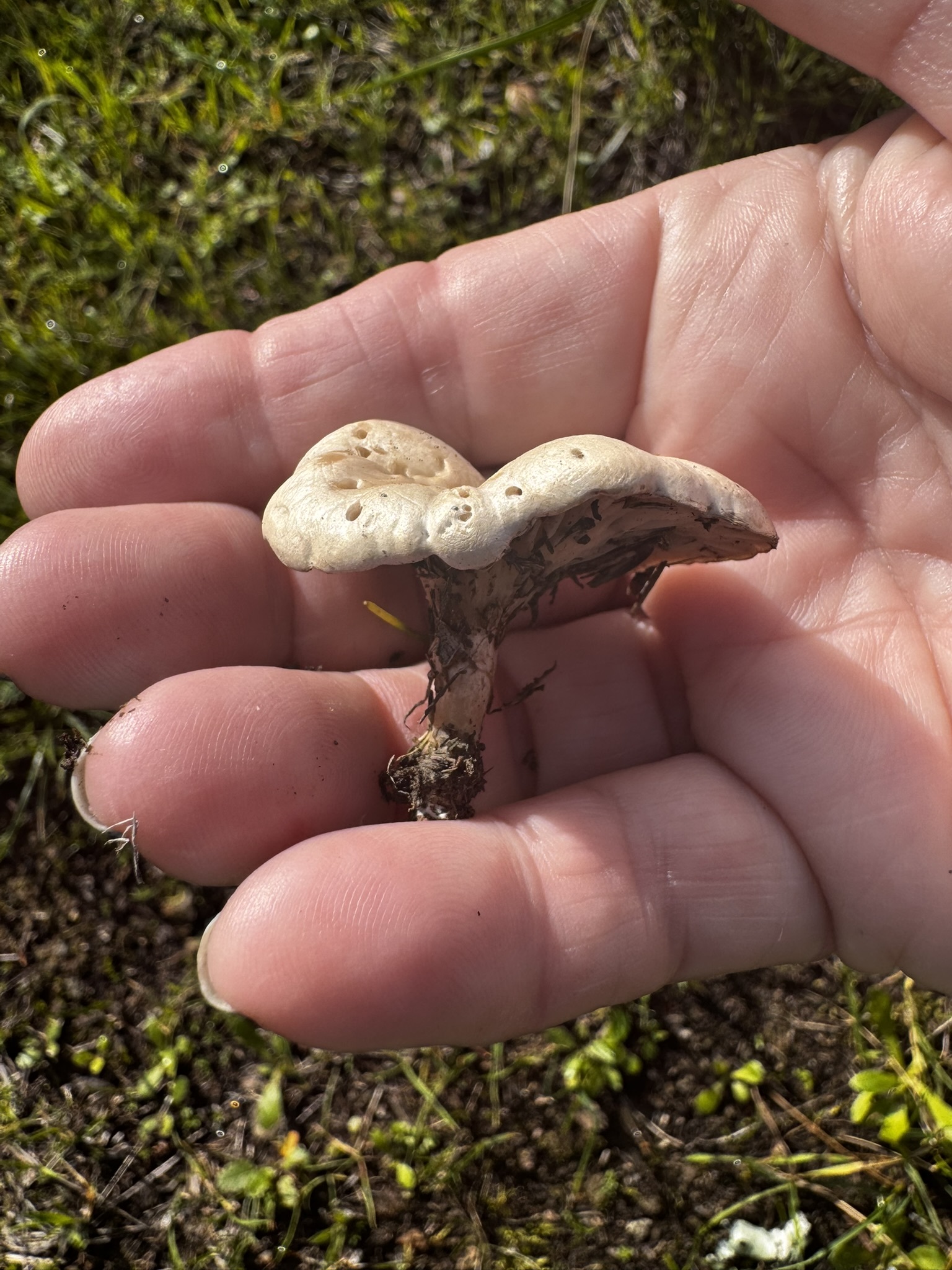 Stiel: zentral, oft exzentrisch oder auch seitlich, blassbeige.