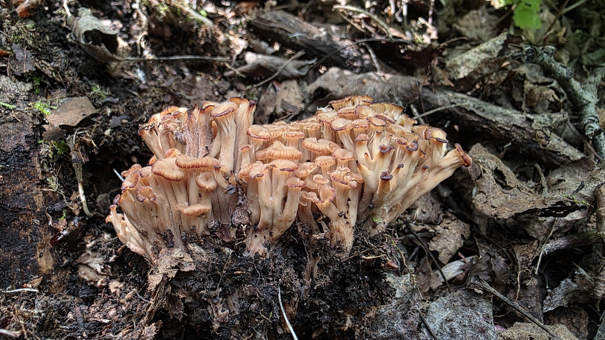 Stiel: Stiel 3-10 cm, dünn, zäh, langsrillig, gegen die Basis dunkler werdend, büschelig miteinander verwachsen. Oft exzentrisch, auch muschelförmig bist trichterig.
