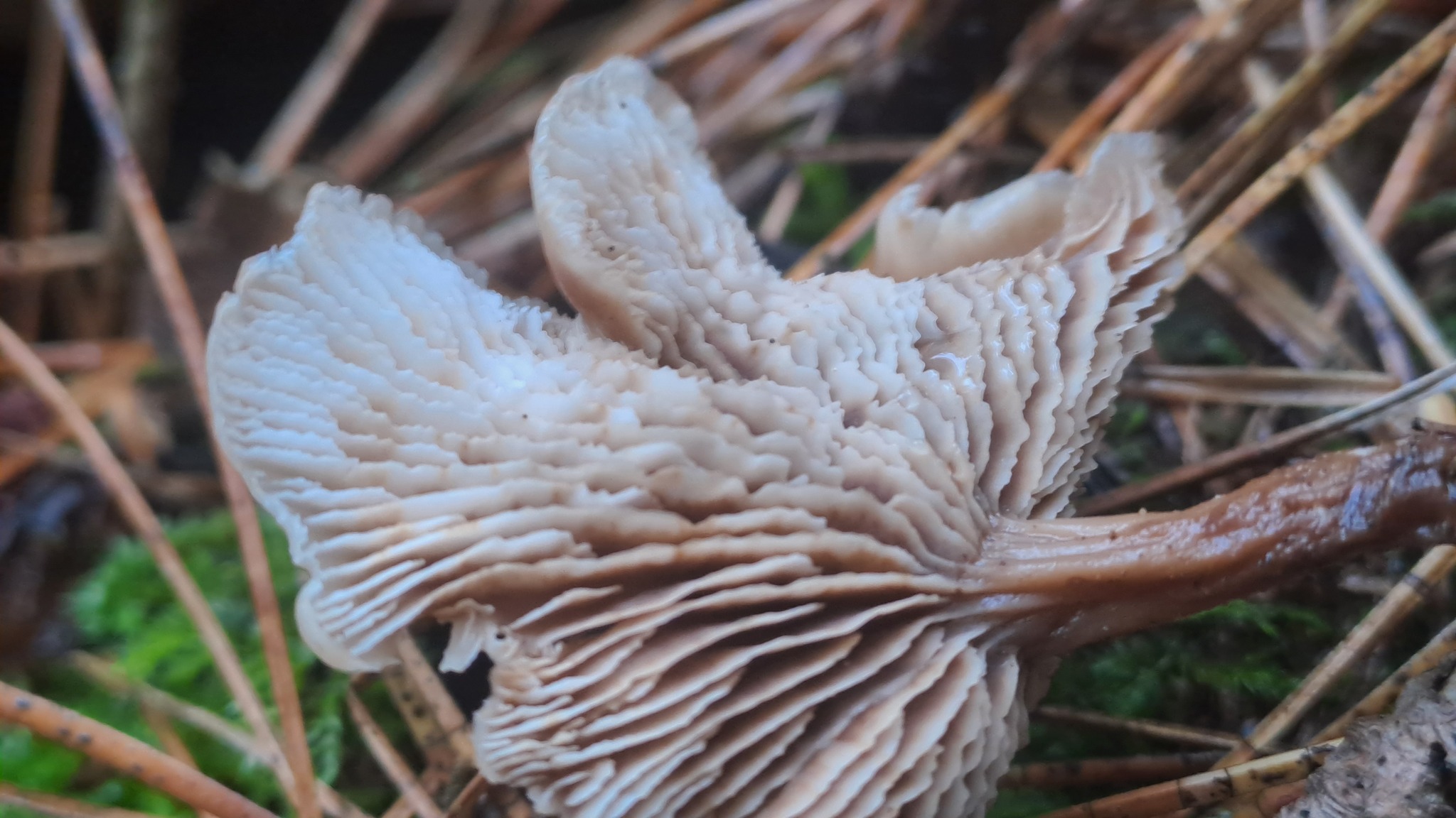 Lamellen: blass hellbeige, stark untermischt, Schneiden auffallend gekerbt, herablaufend.