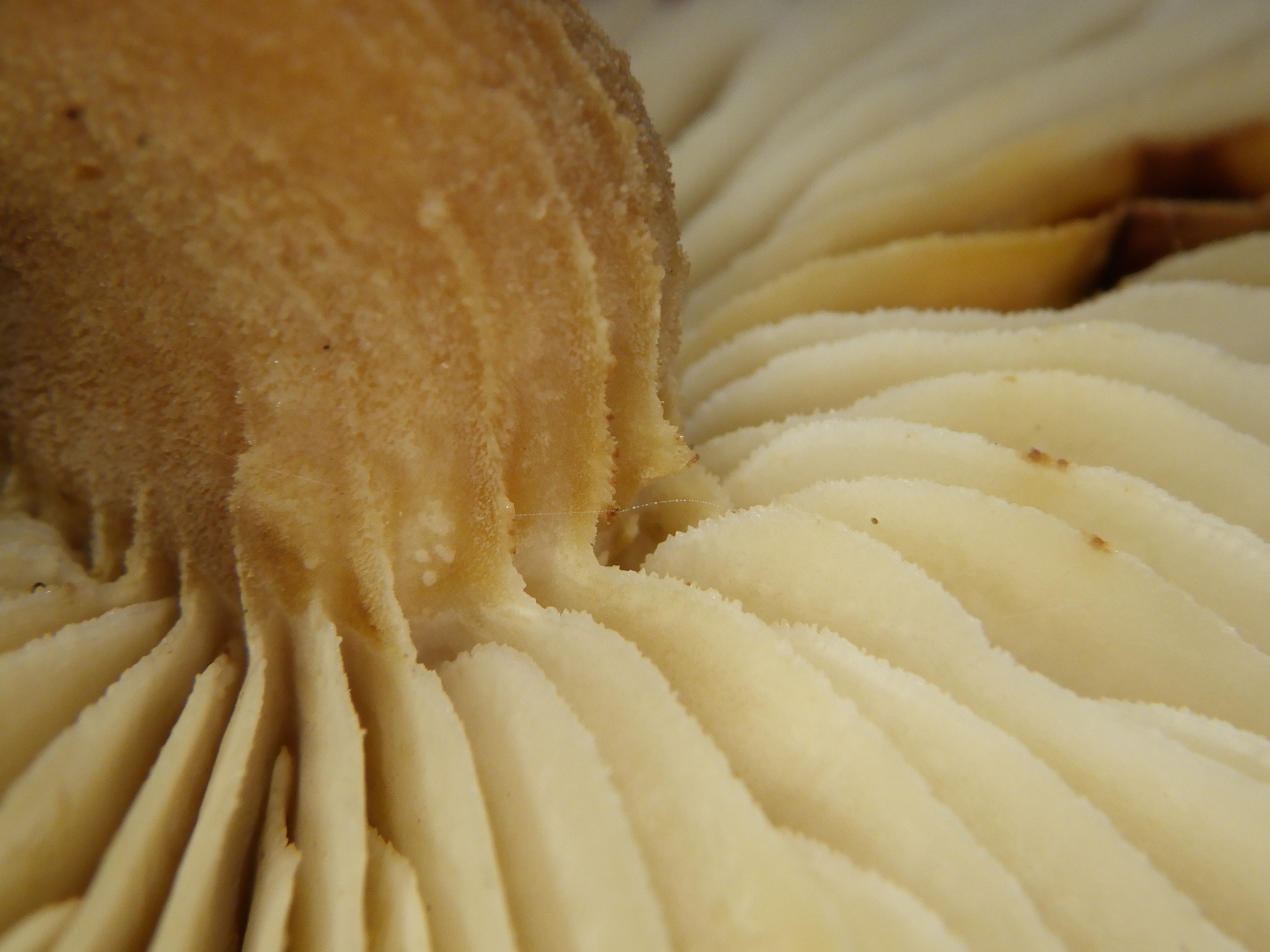Lamellen: creme, später ocker, fast gerade angewachsen, mit Strich herablaufend, Schneiden gesägt.