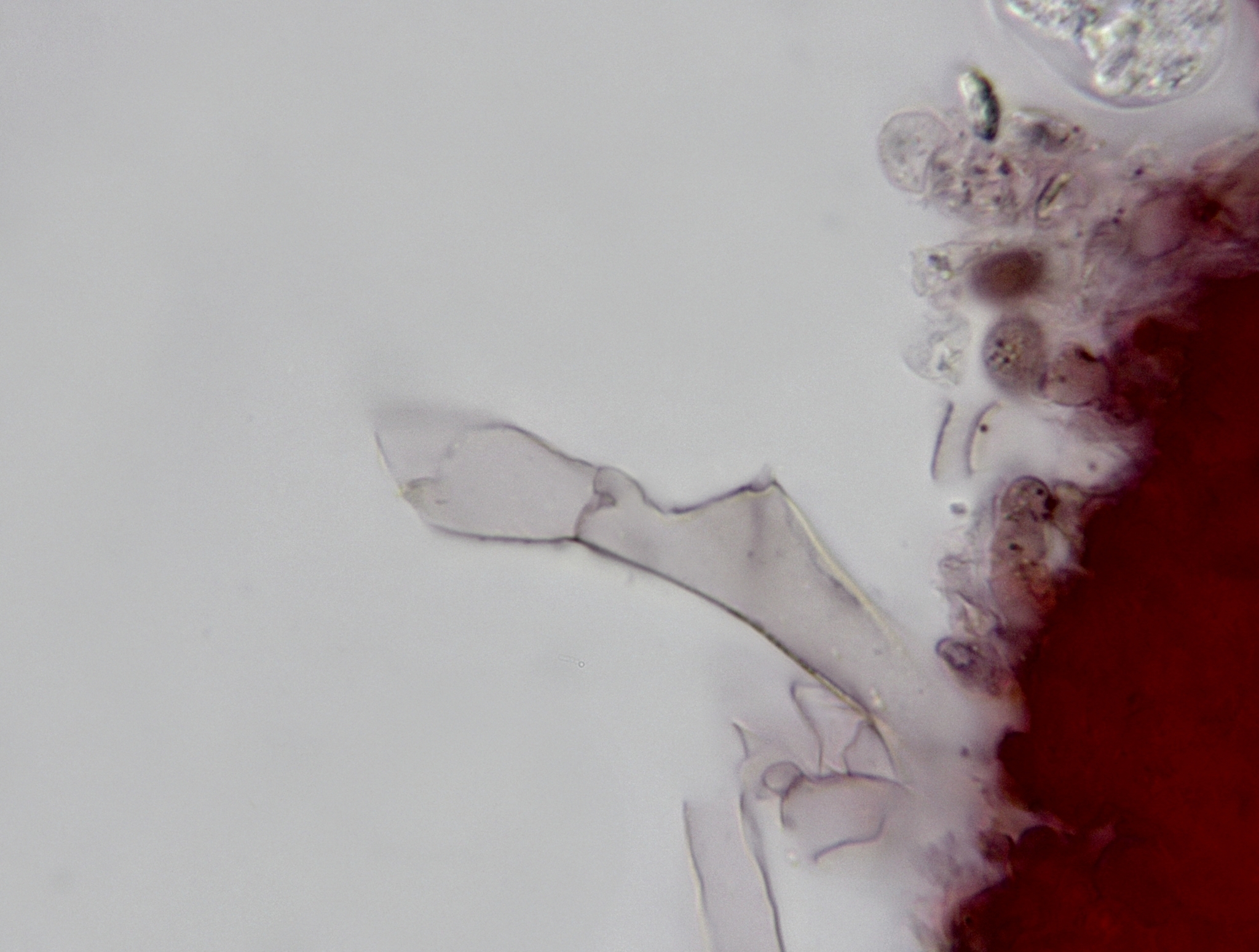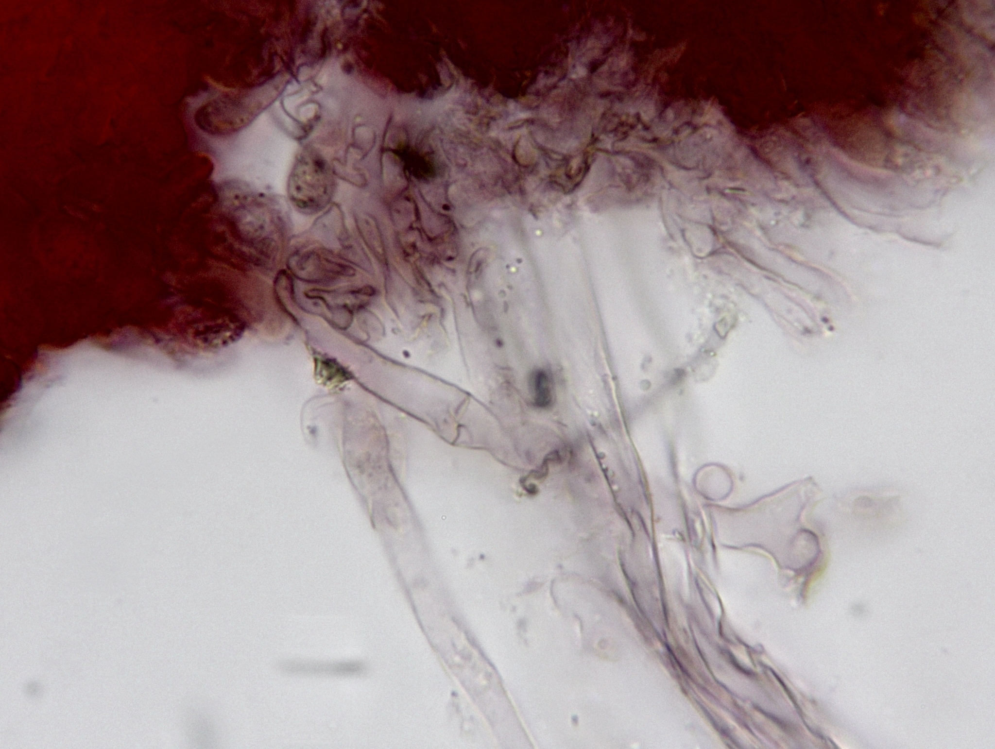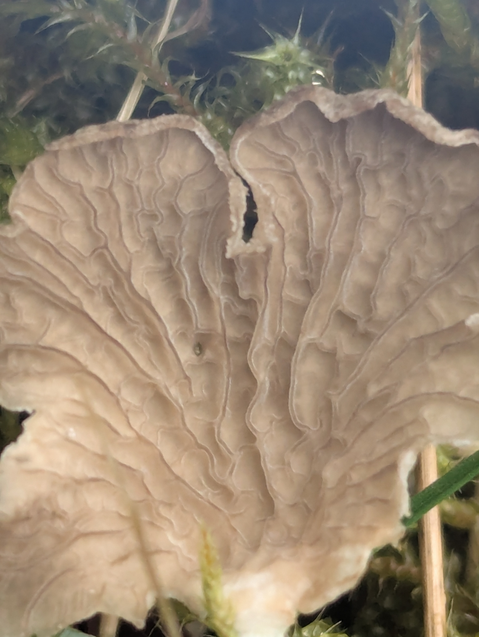 Lamellen: sehr schmal, faltenförmig, verästelt, mit divergierenden oft anastomosierenden Ästen, gleichfarbig wie der Hut.
