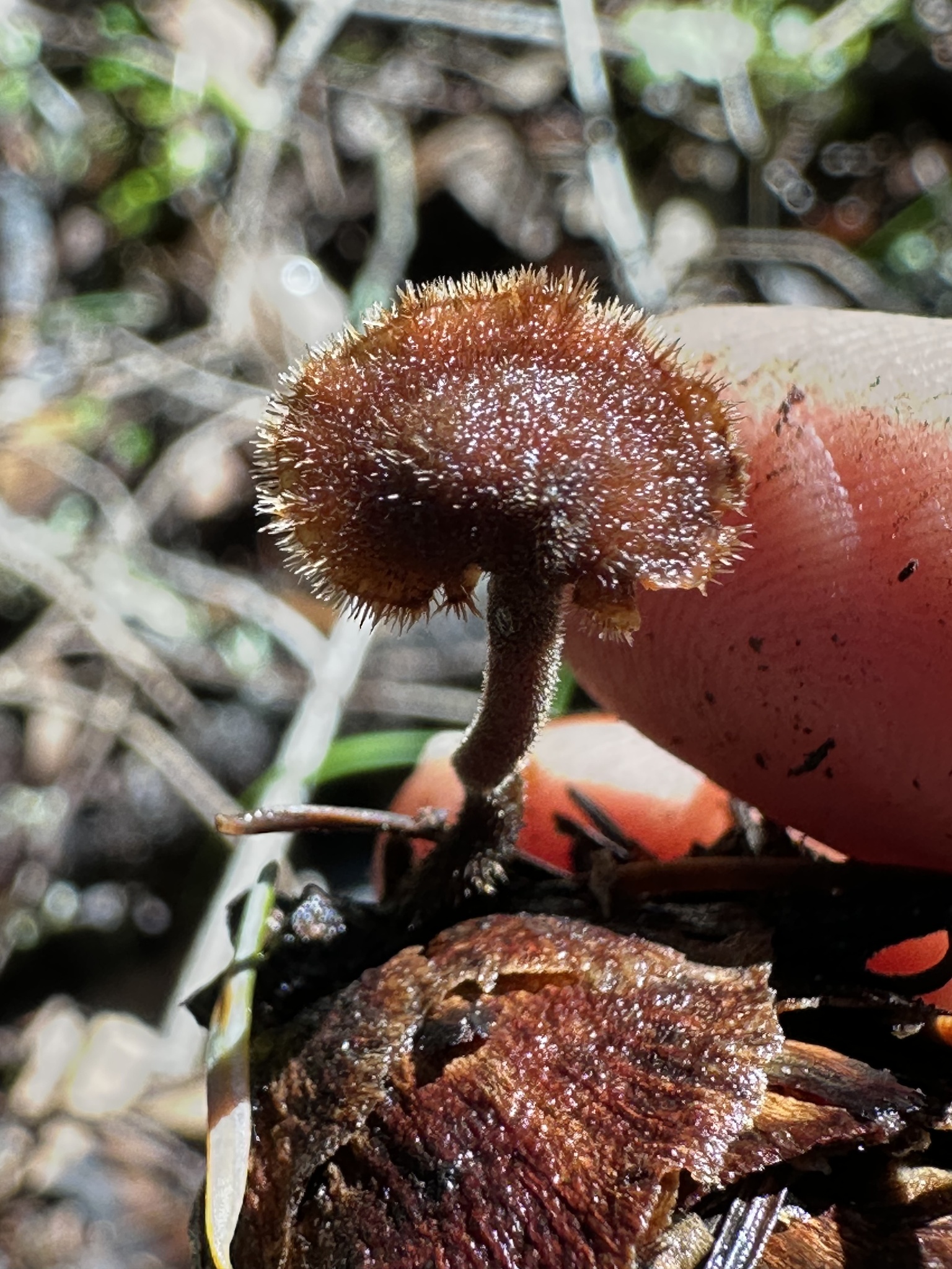 Stiel: überwiegend zylindrisch, trocken, manchmal dezentral bzw. exzentrisch, filzig bis haarig-borstig, dunkelbraun bis rötlichbraun,