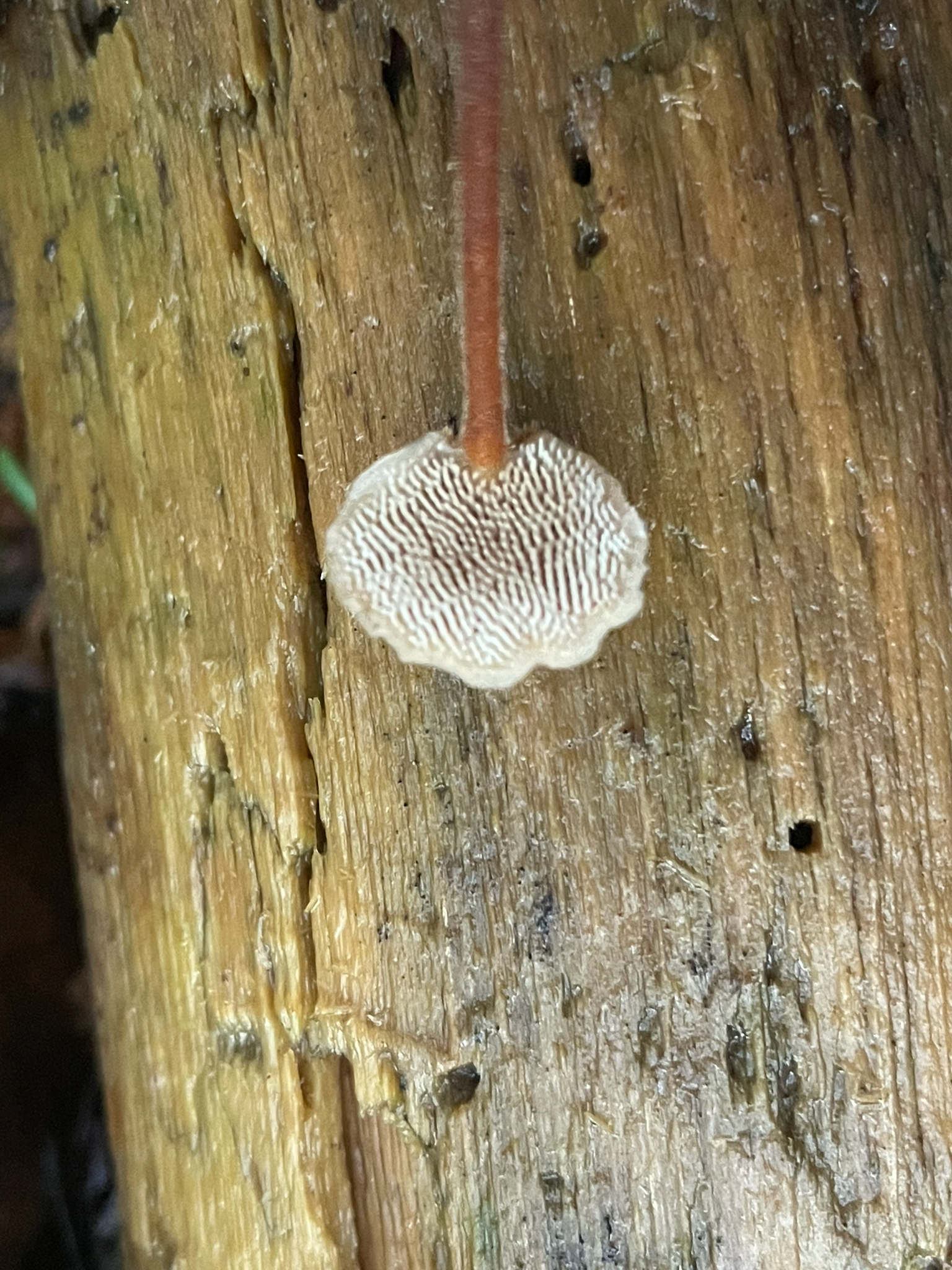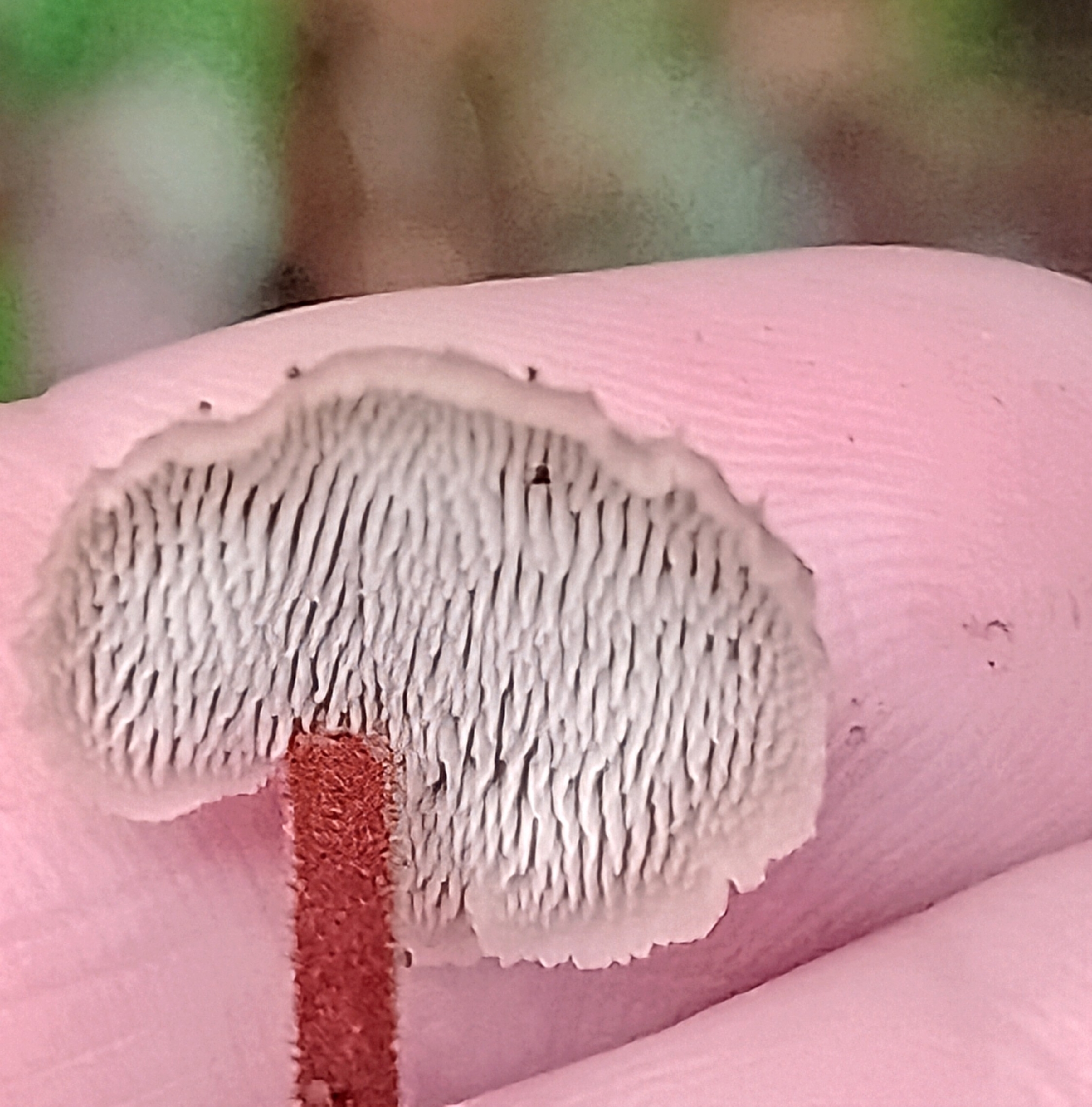 Lamellen: konische und spitze Stacheln von ca. 2-3 mm länge, rosabraun bis graubraun, am Stiel angewachsen bis leicht herablaufend