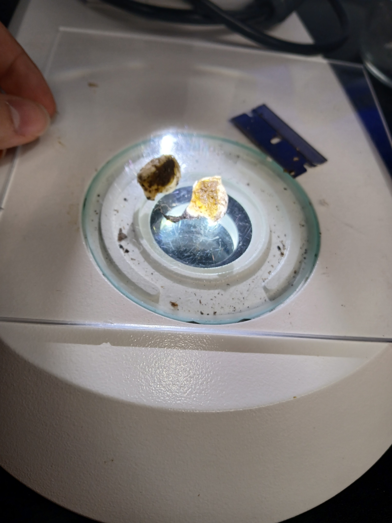 Oberfläche, Hülle: Zart körnig. Die äußere Hülle ist nicht abblätternd