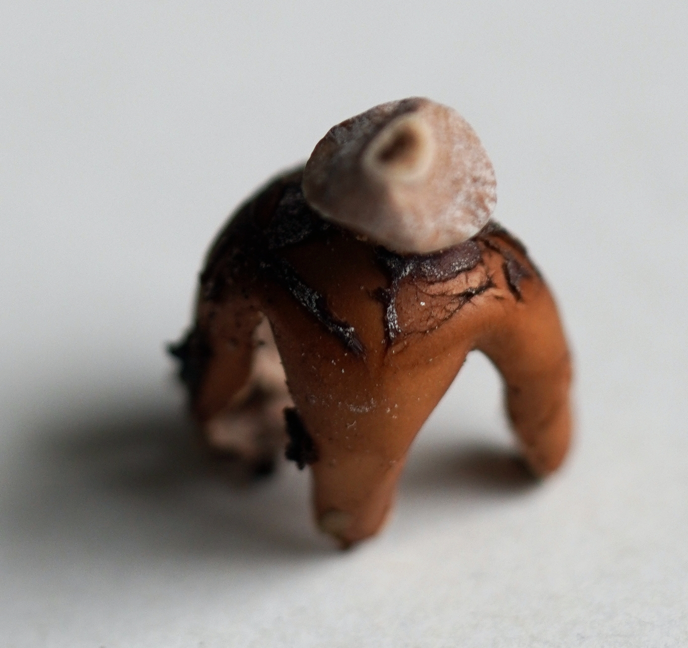 Vier Lappen stehen stelzenartig auf diesem Basisnest. Die Mündung der Staubkugel ist dunkel, gegelig, gefranst.