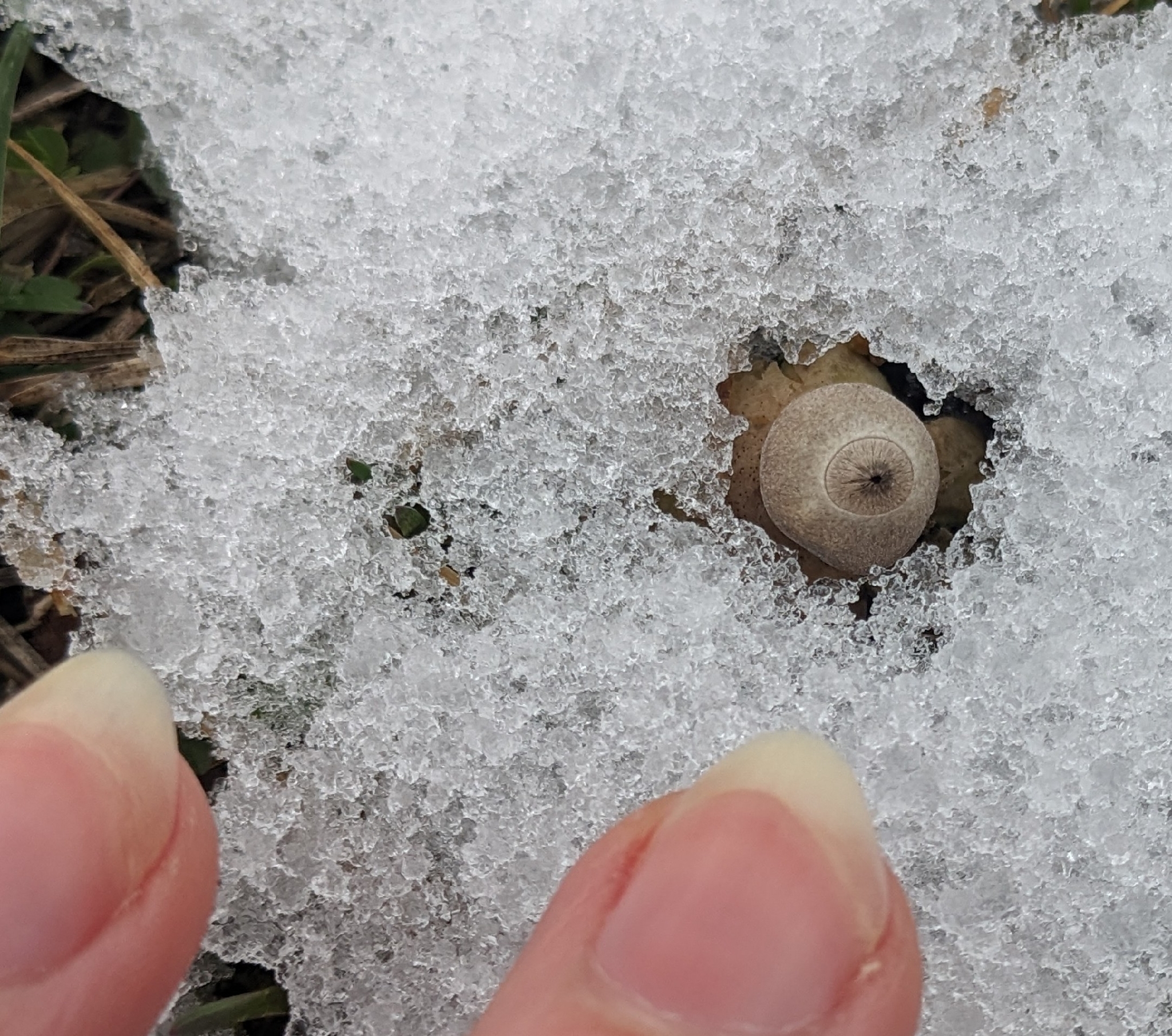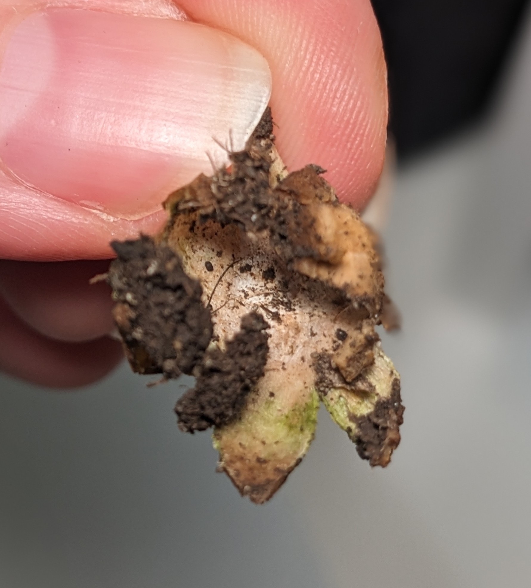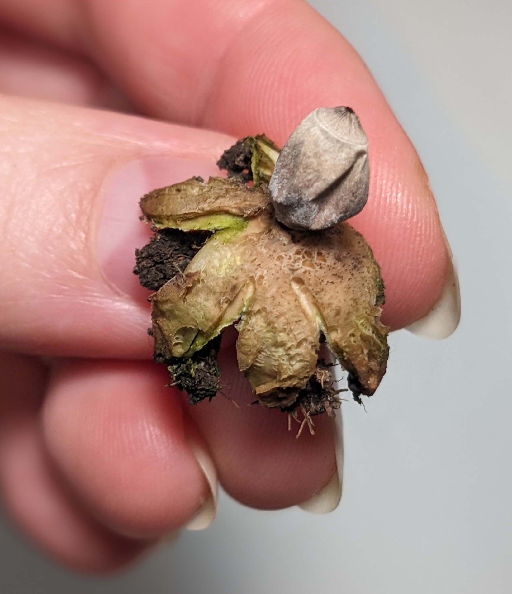 Oberfläche, Hülle: Die Staubkugel liegt in den vir Lappen wie in einem Nest. Farbe der Lappen ist weisslich/gräulich, die Staubkugel ist grau. Die Staubkugelöffnung ist klar abgegrenzt bzw. abgesetzt.