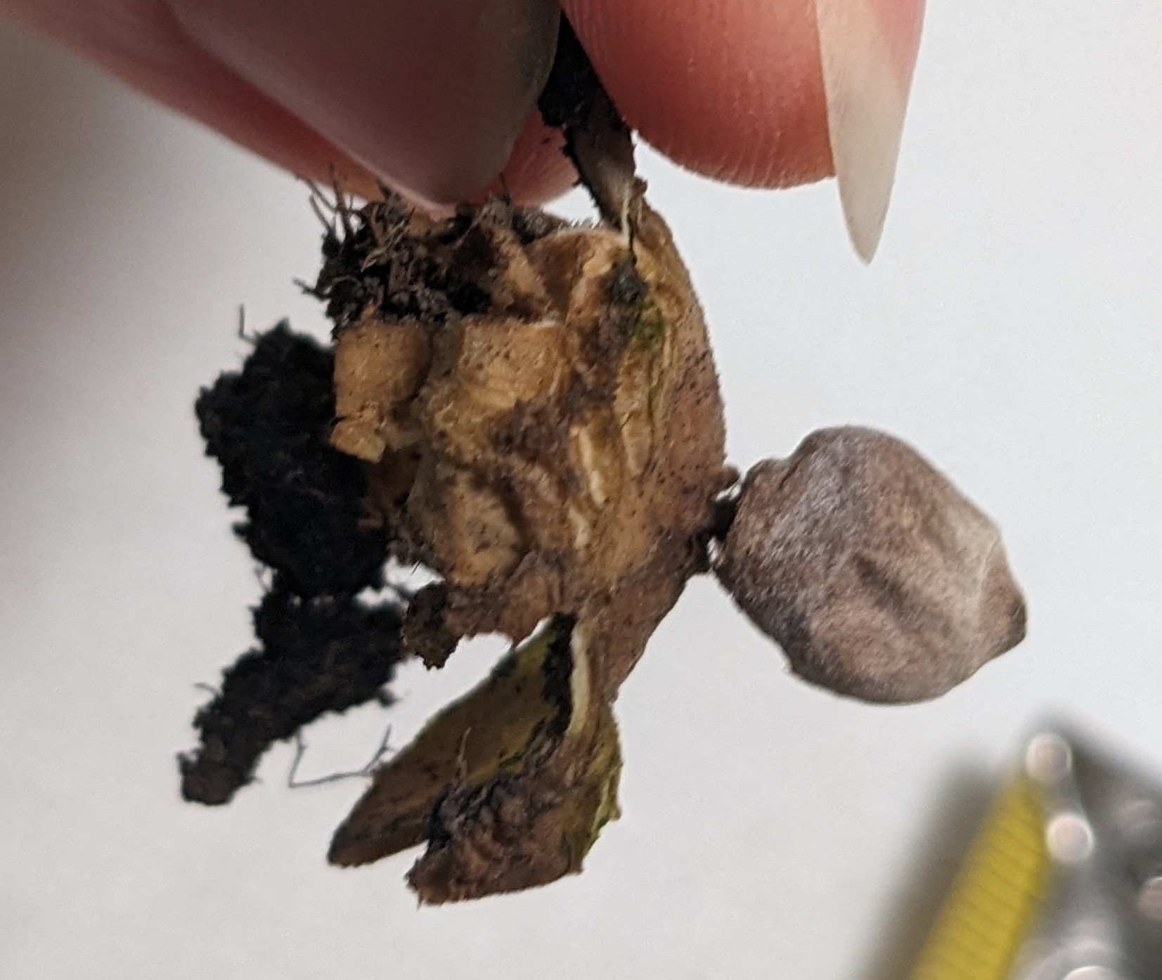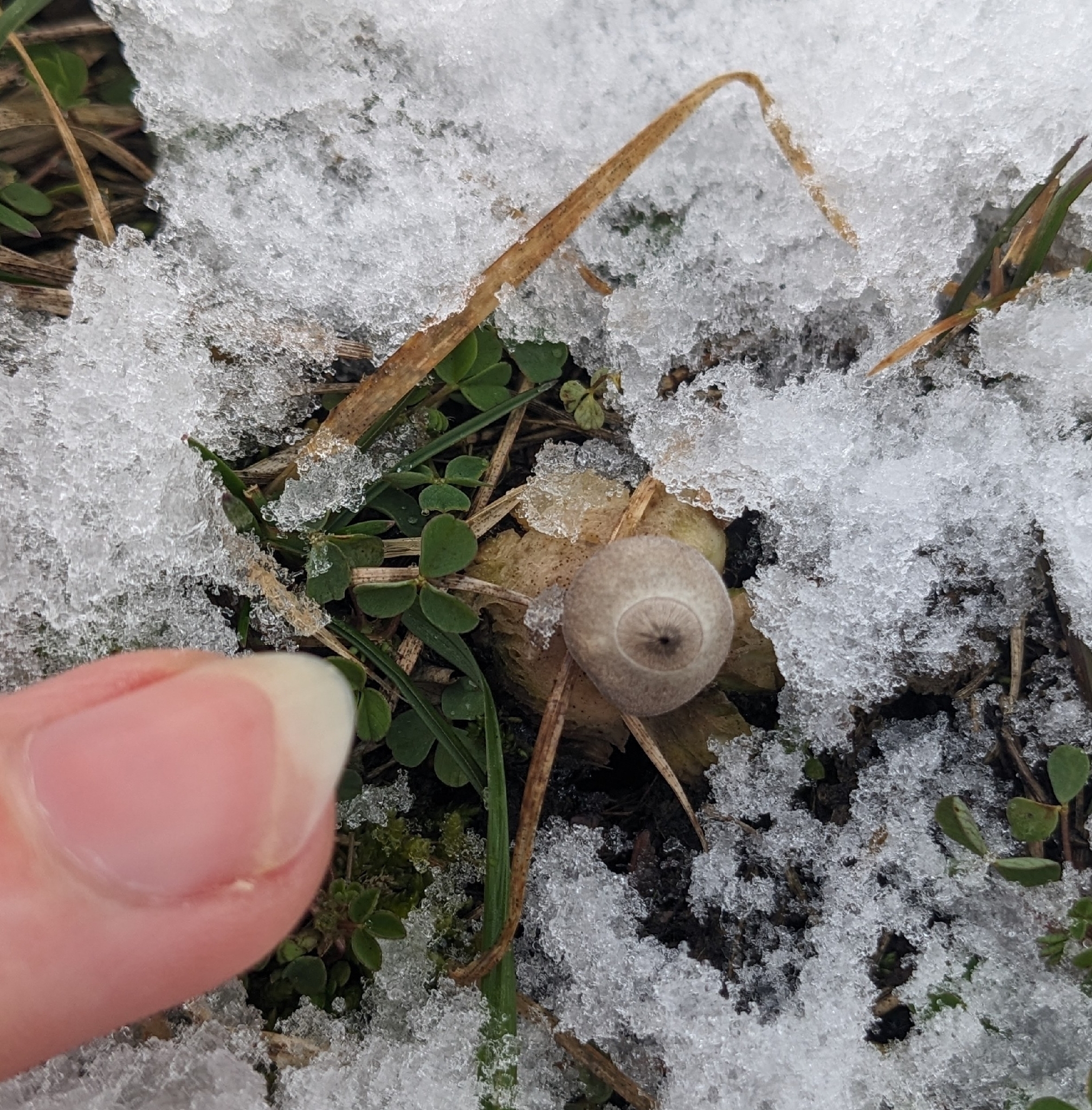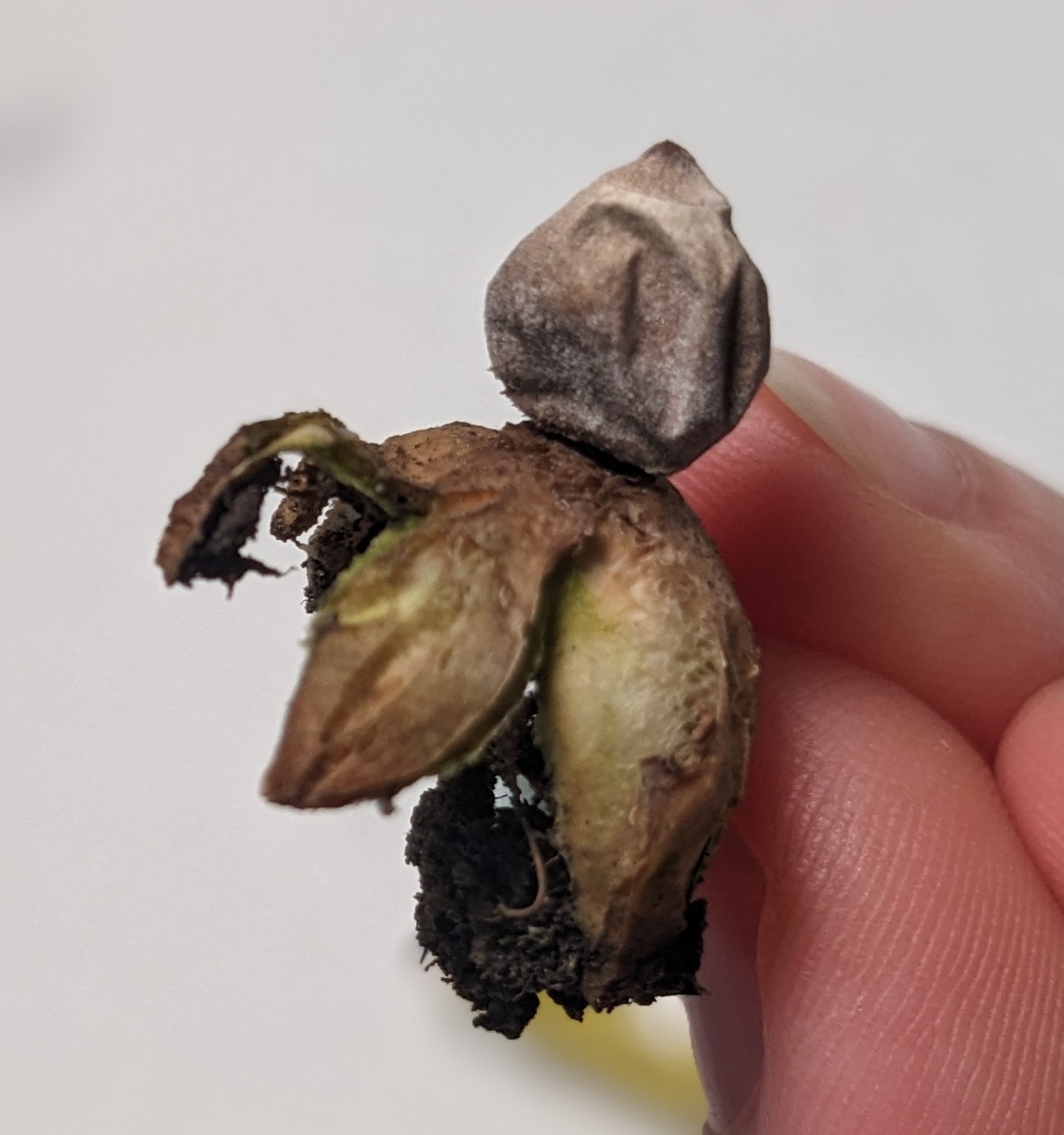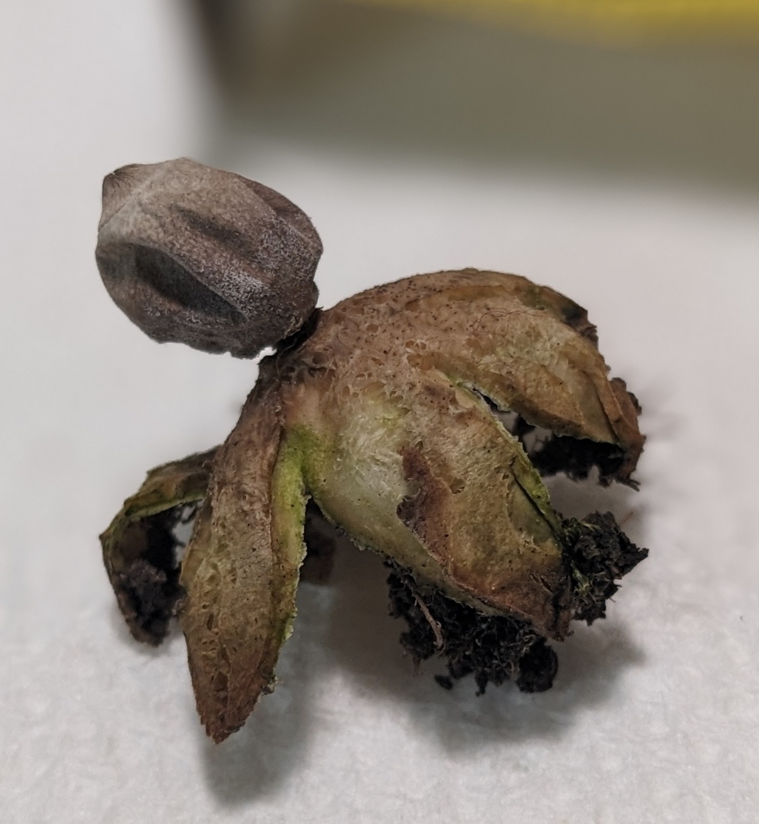 Oberfläche, Hülle: Die Staubkugel liegt in den vir Lappen wie in einem Nest. Farbe der Lappen ist weisslich/gräulich, die Staubkugel ist grau. Die Staubkugelöffnung ist klar abgegrenzt bzw. abgesetzt.