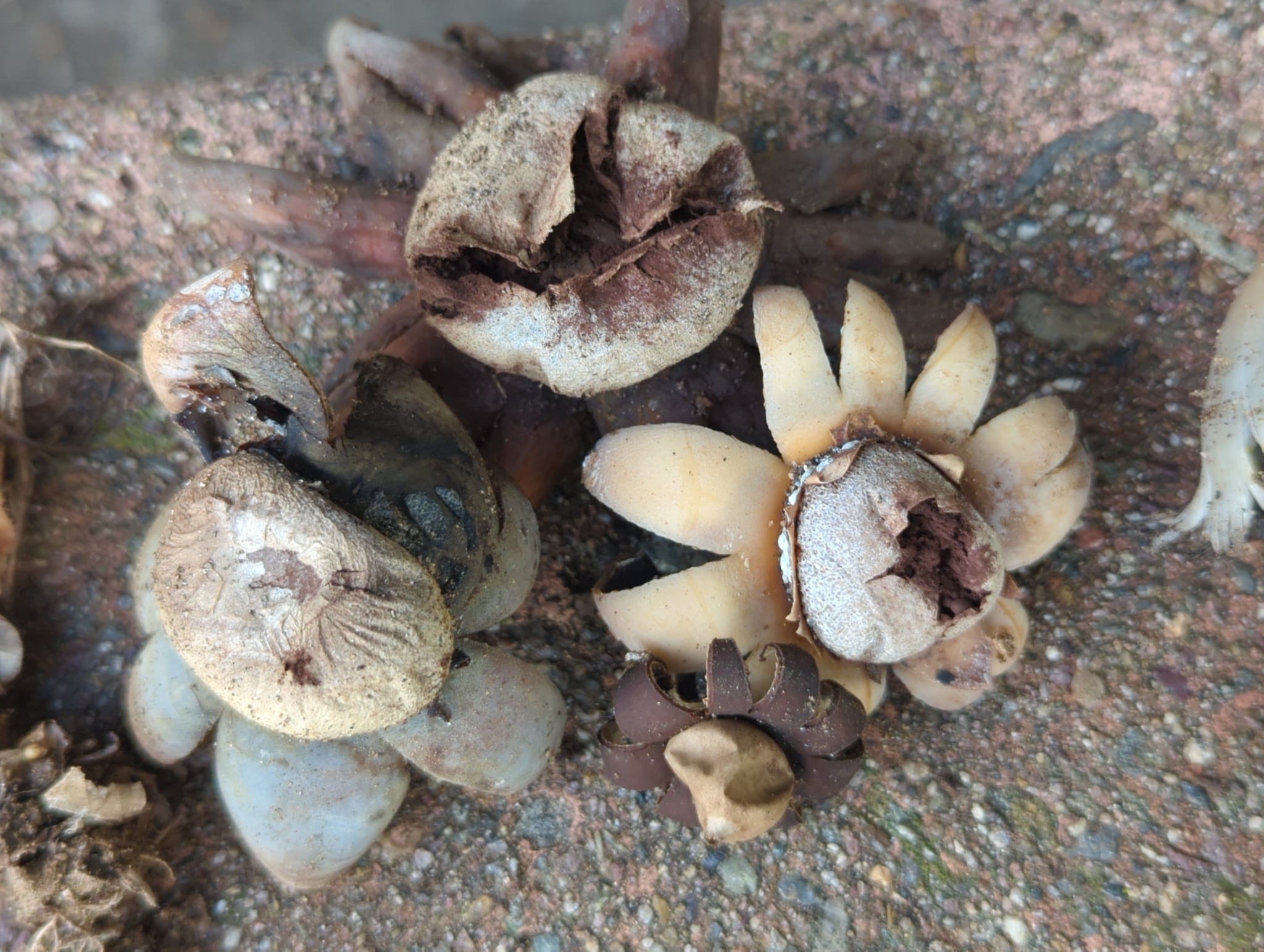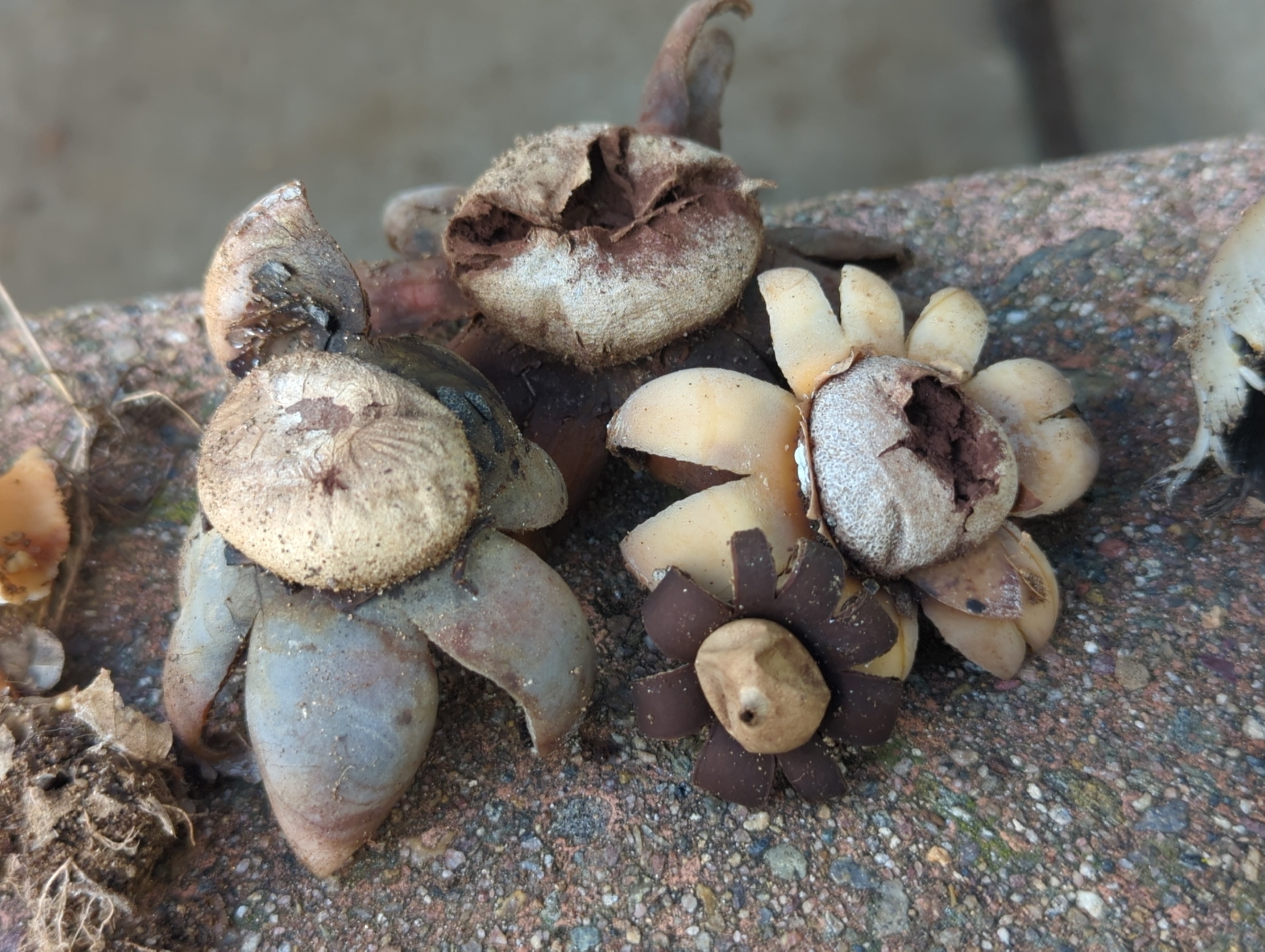 Fruchtkörper: Äußere Hülle reißt in 7-20 Lappen, die in trockenem Umfeld sich um die Staubkugel schließen. Unter feuchten Bedingungen rollen diese sich nach außen.