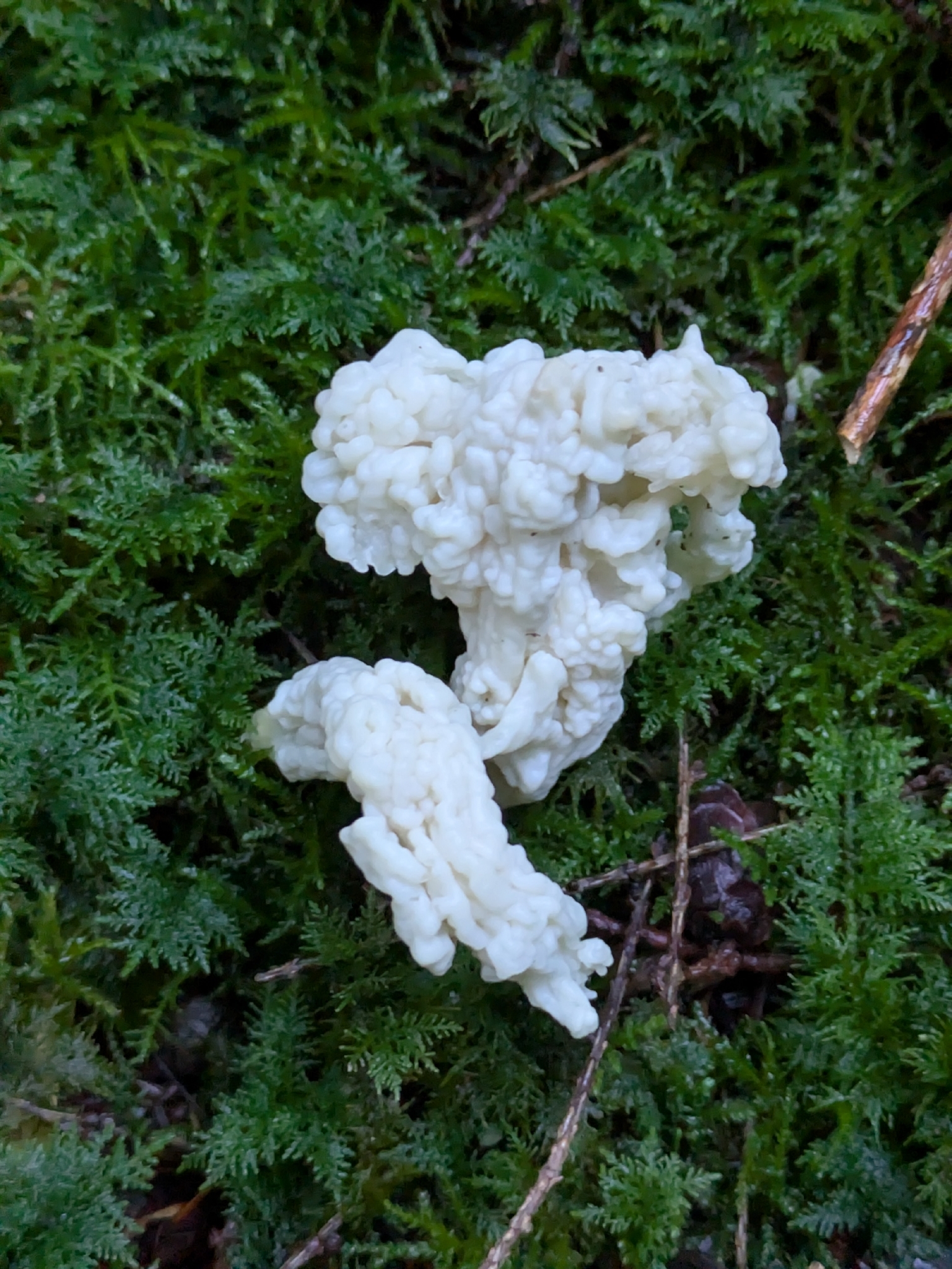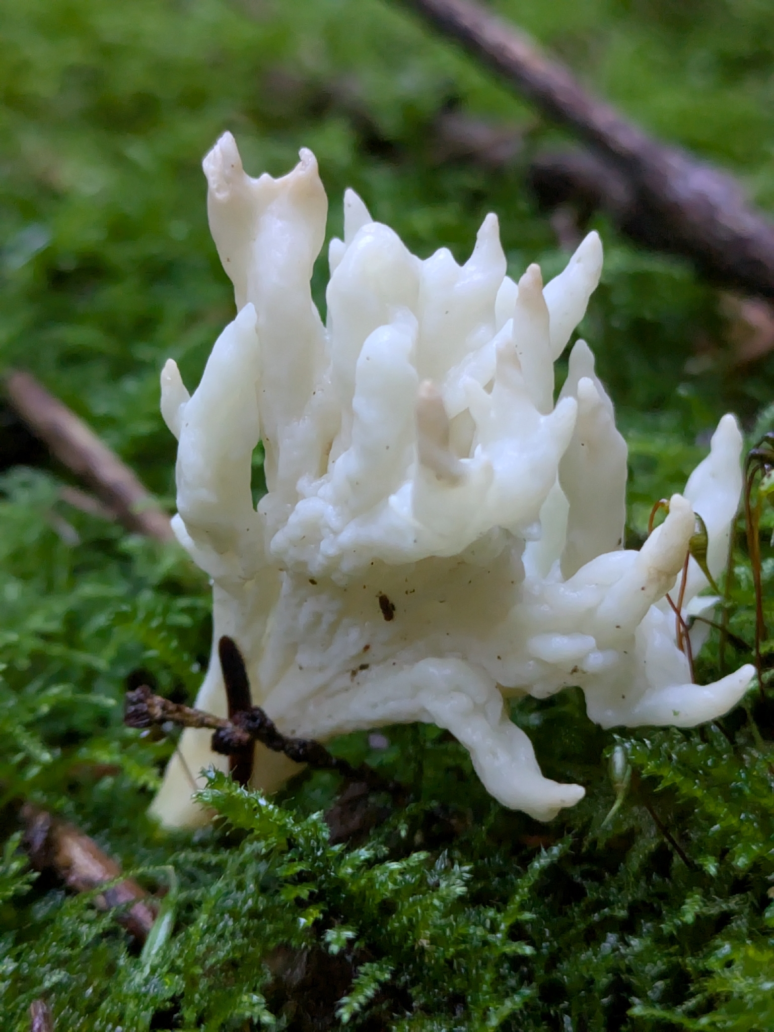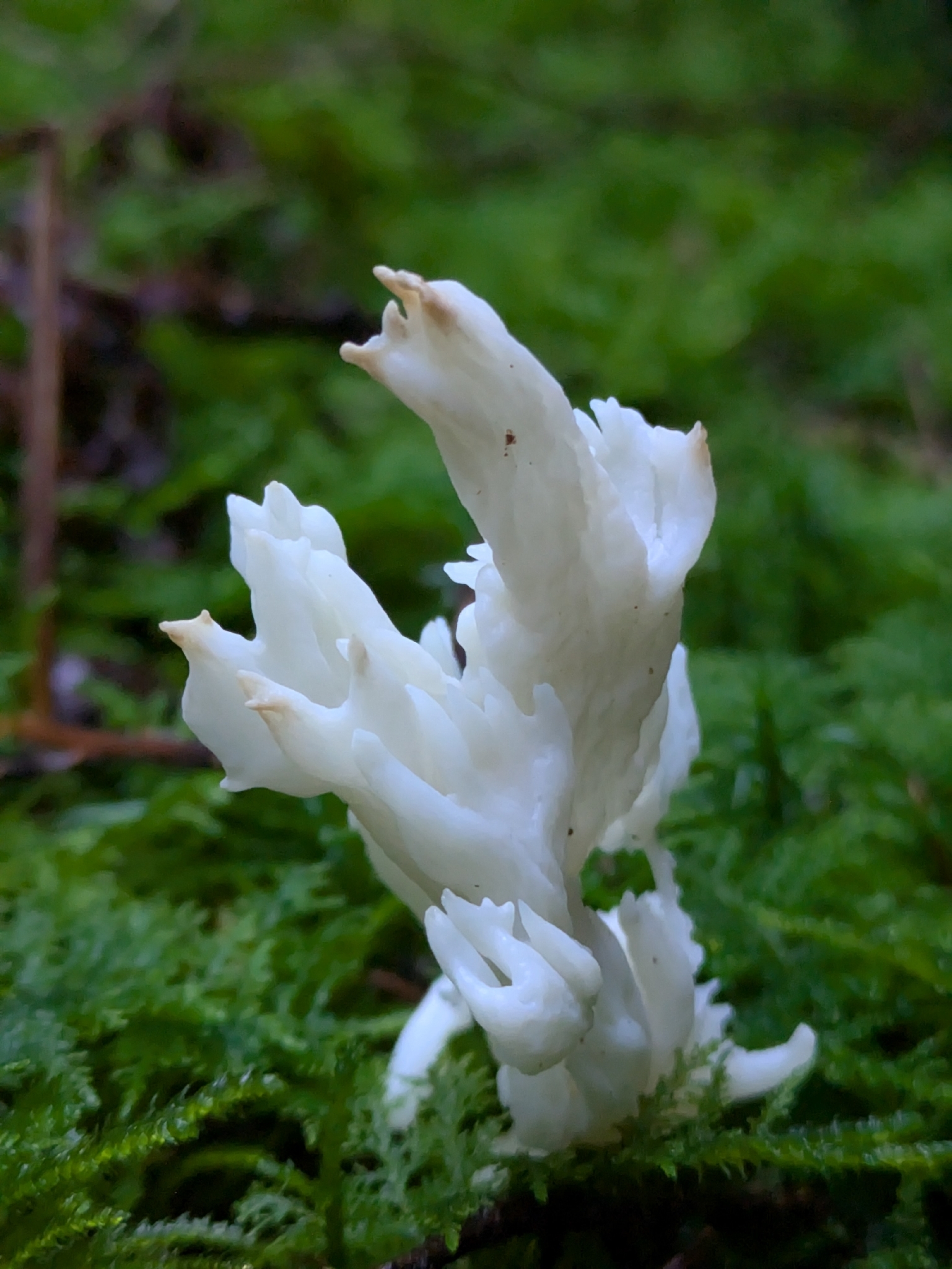 Fruchtkörper: Fruchtkörper bis 10 cm hoch, recht schmal und unverzweigt mit bis zu 3 Ästen, weiß, runzelig