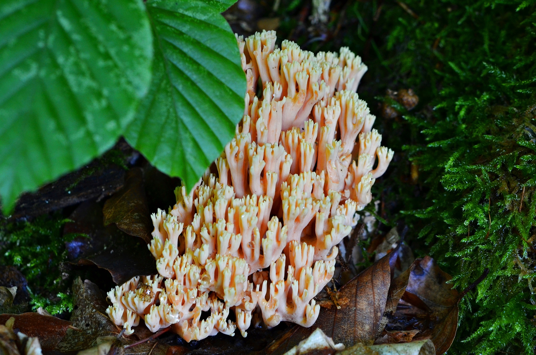 Fruchtkörper: Aus dem Strunk kommen fast parallel verlaufenden Äste, die sich nach oben immer weiter aufteilen. Jung lachsgelb, später orangerot bis ockergelb. Die Spitzen sind lange weisslich-gelb.