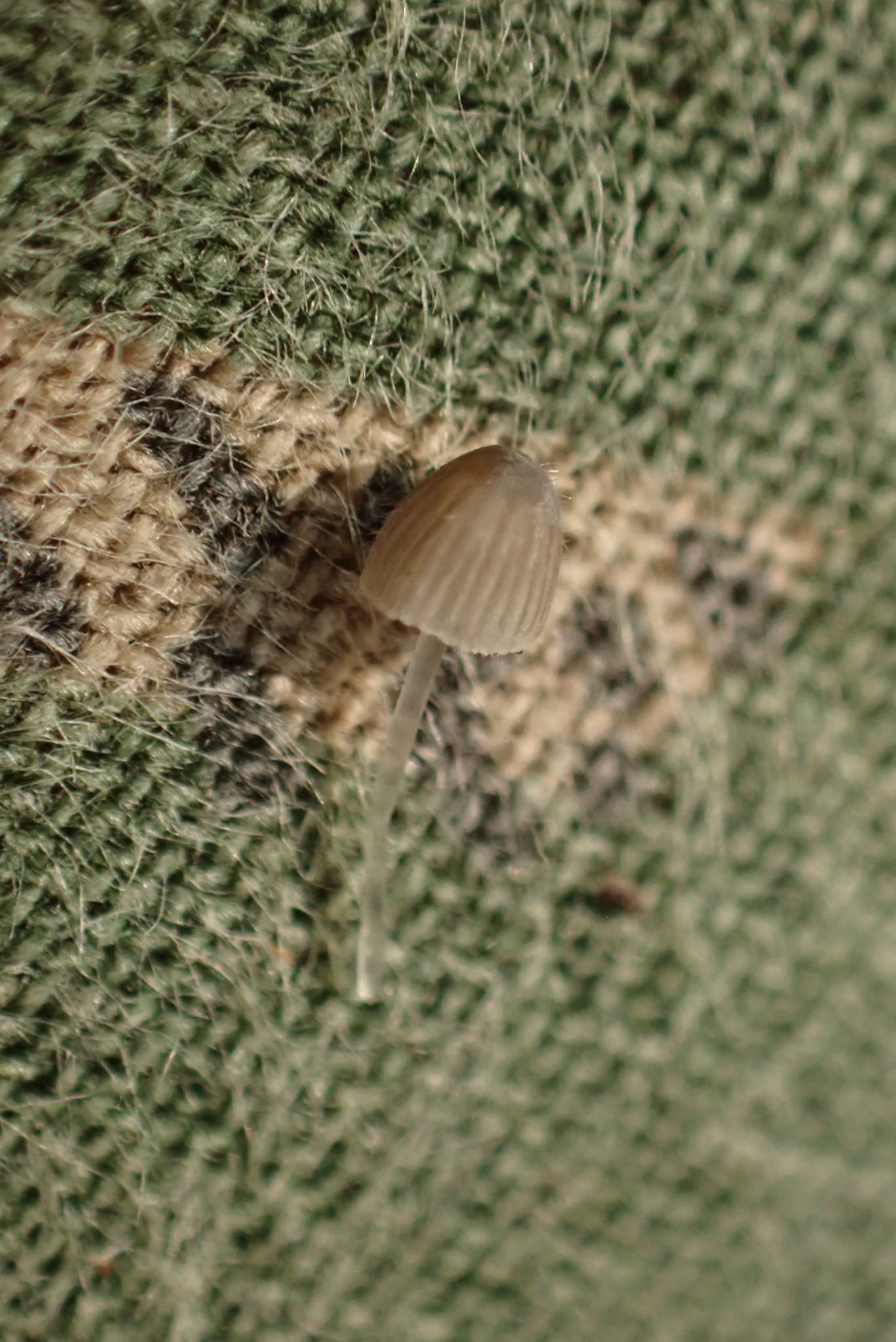 Hut: halbkugelig, konisch, manchmala fast glatt und Mitte eingedrücht, Hut weisslich feinfaserig bzw. haarig (ca. 200 µm lang), grau bis grau-braun