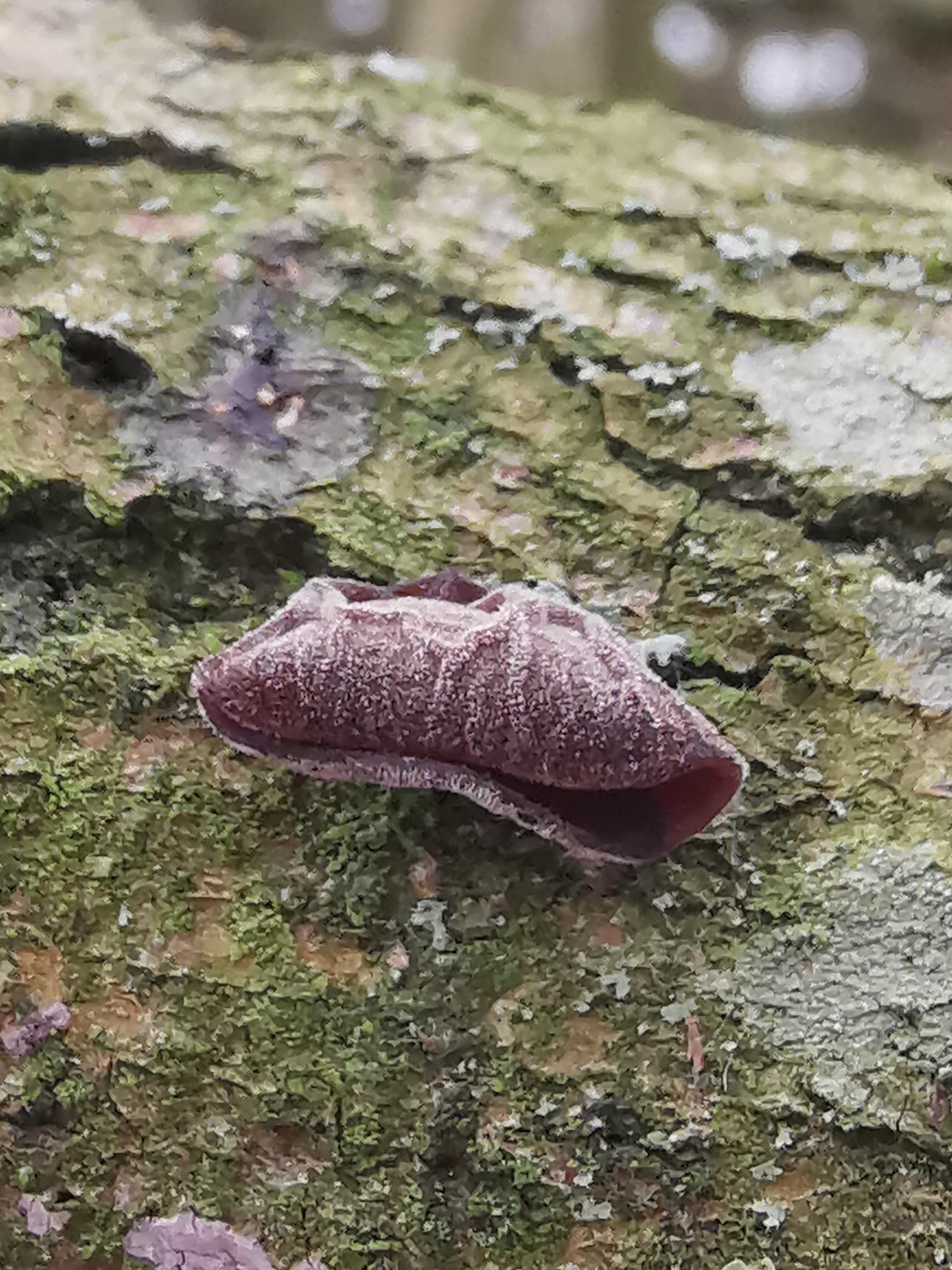 Fruchtkörper: Fruchtkörper becher-, schüssel- oder ohrenförmig, mit schmaler Basis aufsitzend, oft fast hutartig, aussen und innen vielfach gewunden, mit dem oberen Teile oft halbiert-abstehend oder gedreht, gallertartig-knorpelig, trocken hornartig, aber auch später angefeuchtet die alte Gestalt wieder annehmend, 1—8 cm breit und darüber, gruppenweise oder dachziegelig übereinanderstehend, aussen nicht gezont, graubraun, kurz striegelhaarig. Hynienialschicht aderig- faltig, violettgrau, trocken dunkelgrau.