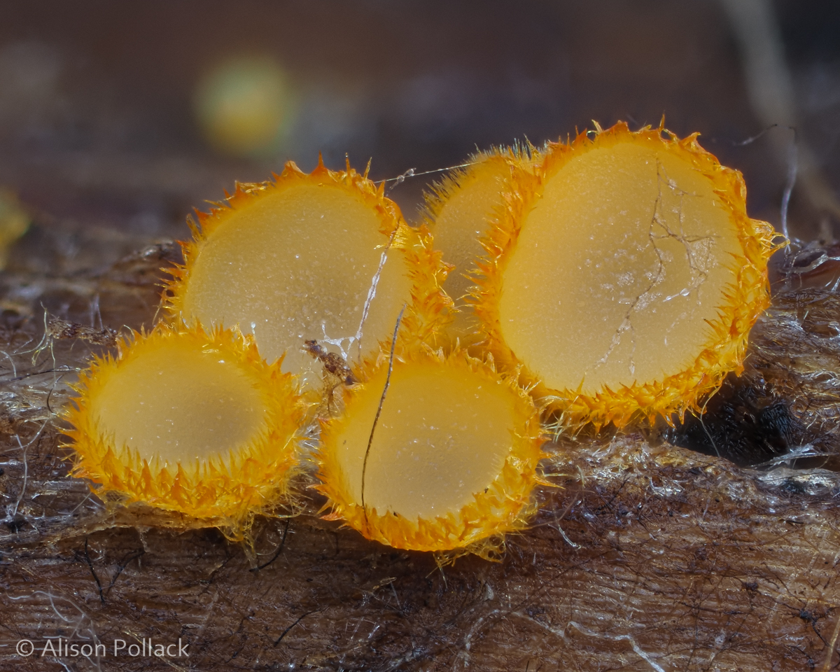 Fruchtkörper: Unterlage zart, weisslich, in der Nähe der Fruchtkörper goldgelb. Fruchtkörper gesellig, weitläufig stehend, sitzend, 1 — 1,5 mm breit, schüsseiförmig, trocken mit zusammengeneigtem Rande, aussen, besonders am Rande, mit goldgelben, am Scheitel rotgelben, gebogenen, filzigen, 2—3 µm breiten Haaren besetzt. Scheibe weisslich oder blass gelblich.