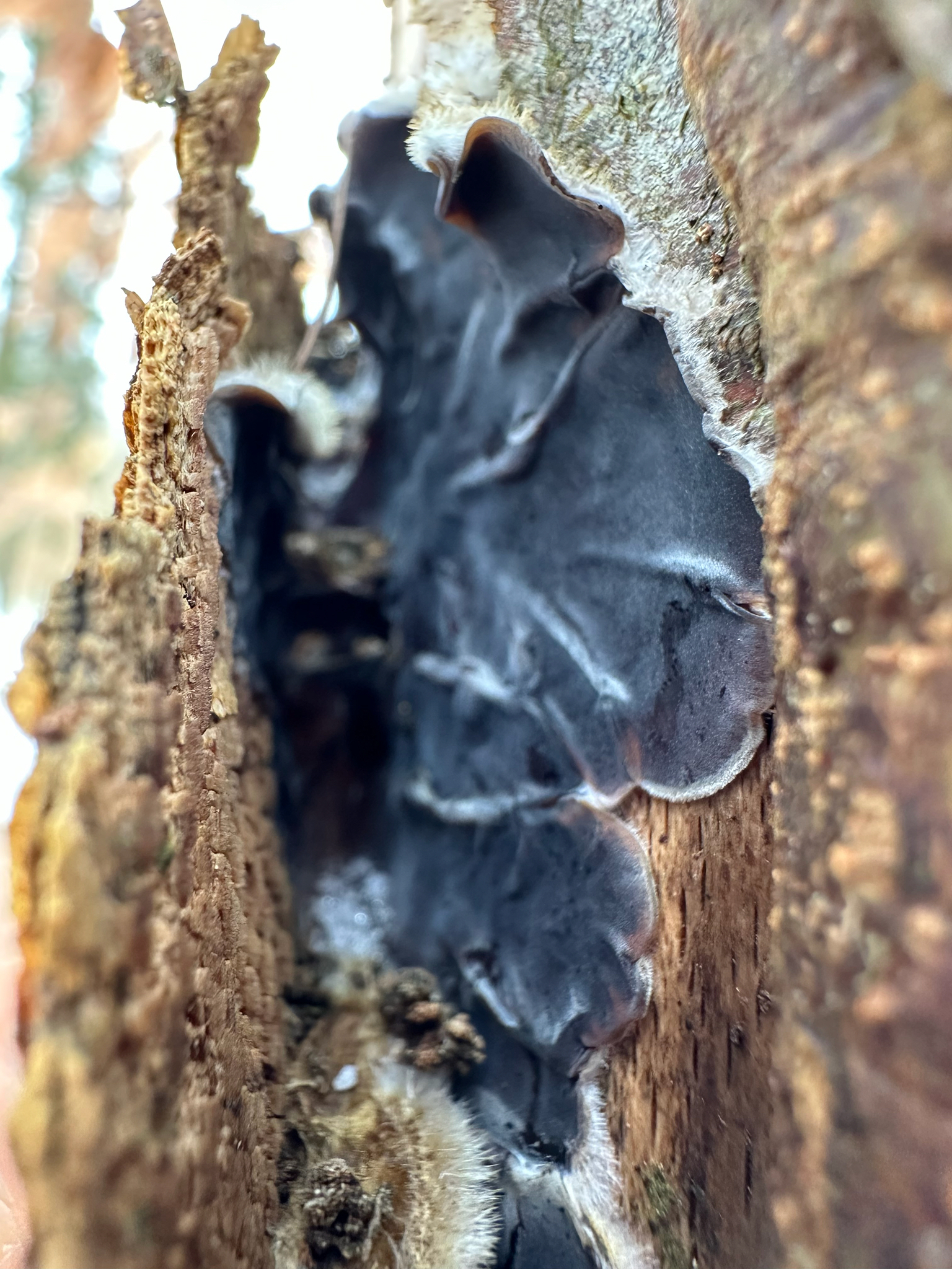 Inneres, Innenmasse: Hymenium die Innenseite überziehend, aderig-gefaltet, braun- violett, gallertartig.
