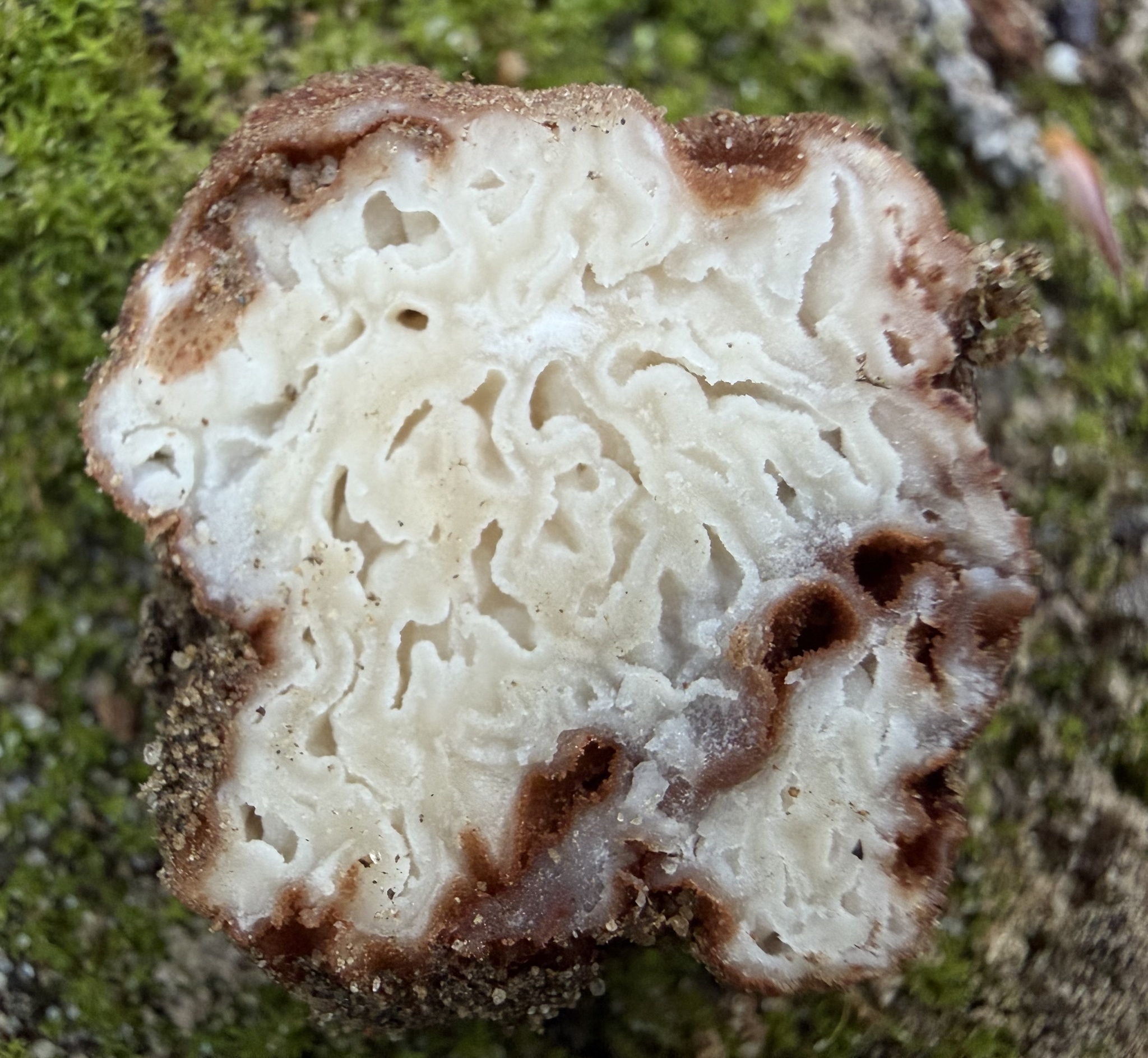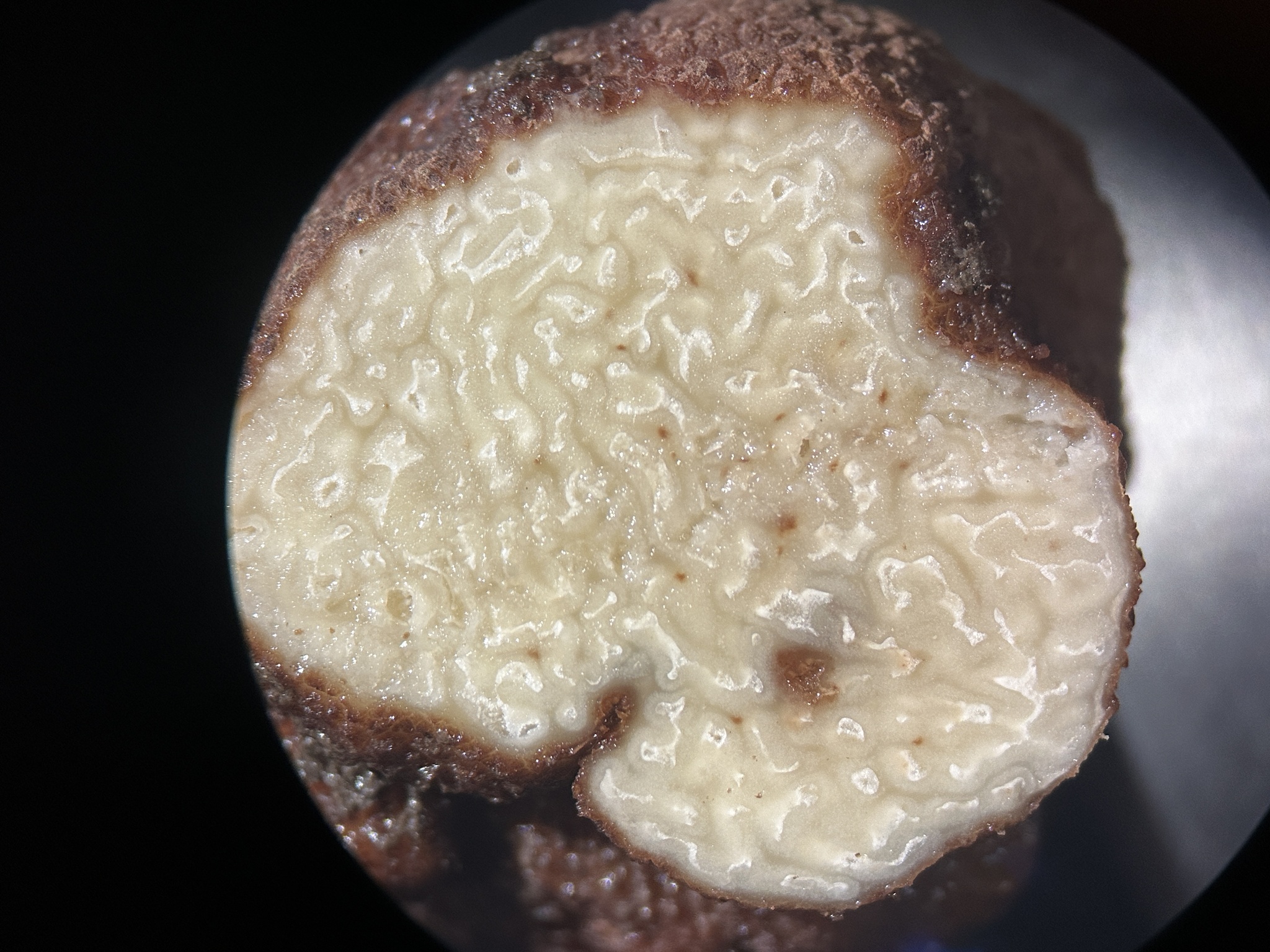 Fruchtkörper: Fruchtkörper knollenförmig, oft mit zahlreichen Falten oder Runzeln, ohne basalen Mycelschopf bis walnussgross und grösser, an der Oberfläche fein papillös oder fast glatt, rostfarbig, mit rings geschlossener Peridie, innen weisslich bis gelblich, von zahlreichen, unregelmässig gestalteten, hohlen Kammern durchsetzt.