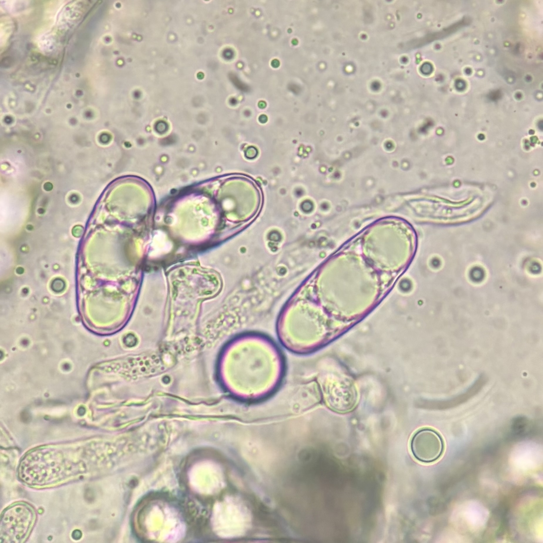 Sporen: Schläuche meist nicht über die Paraphysen vorragend, meist unregelmässig ellipsoidisch, zuweilen stark verlängert, oft langgestielt, 50 bis 80 µm lang, 20—40 µm breit, achtsporig. Sporen regellos gelagert, lang ellipsoidisch bis fast zylindrisch, mit abgerundeten Enden, 25—42 µm lang, 10 bis 18 µm breit; Membran ziemlich dünn, glatt, farblos. Paraphysen 4—5 µm breit.