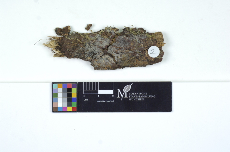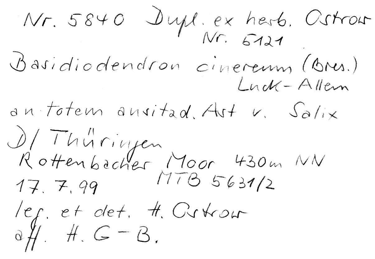 Fruchtkörper: Fruchtkörper weit ausgebreitet, dem Substrat dicht angeheftet, sehr zart mehlartig- krustig, blas» aschgrau.