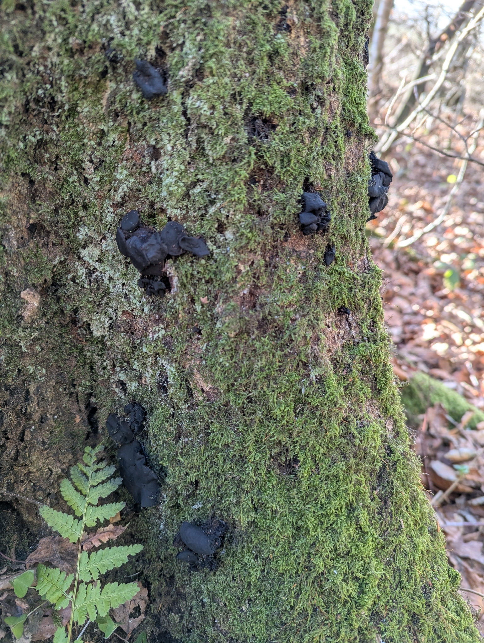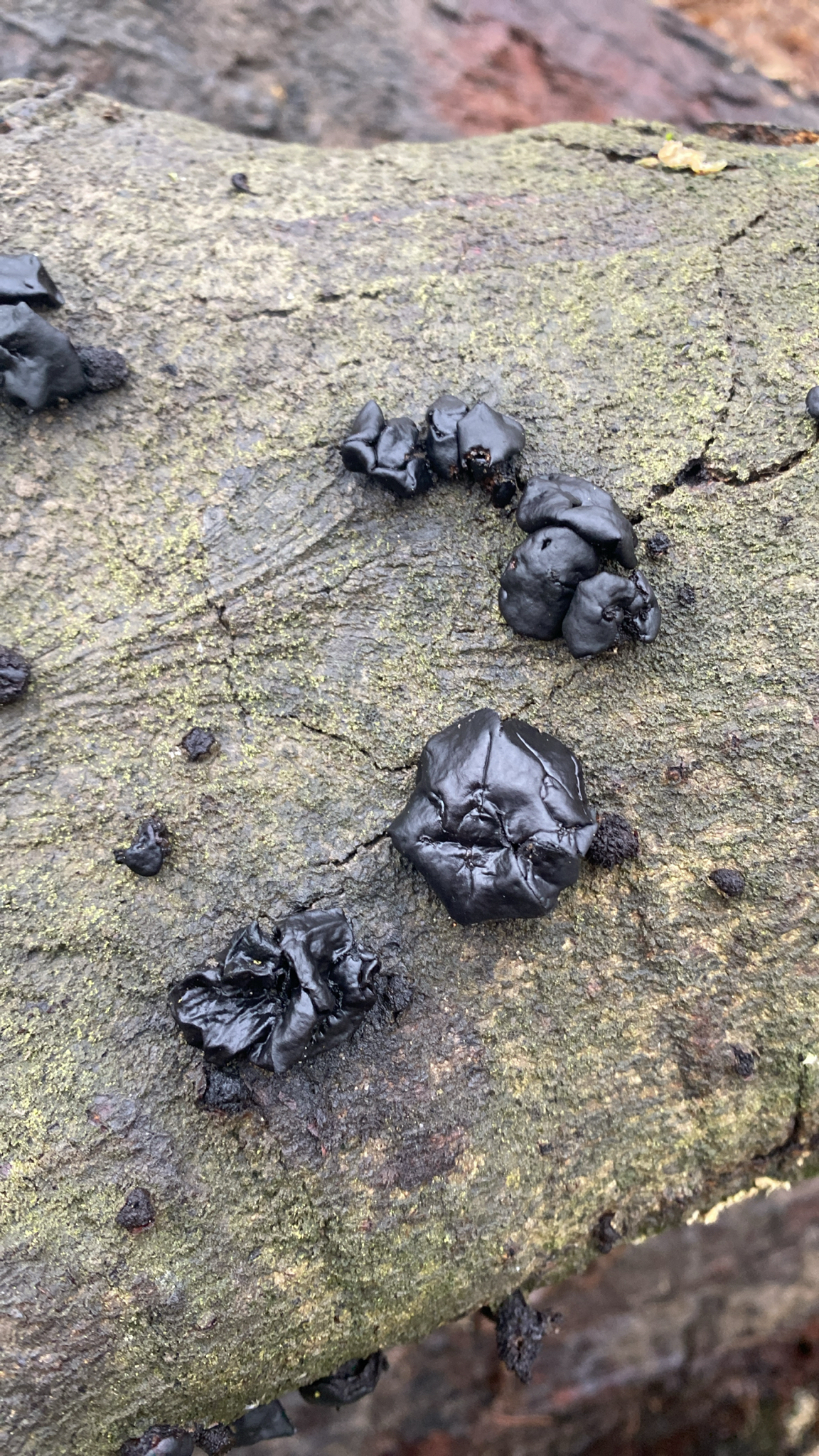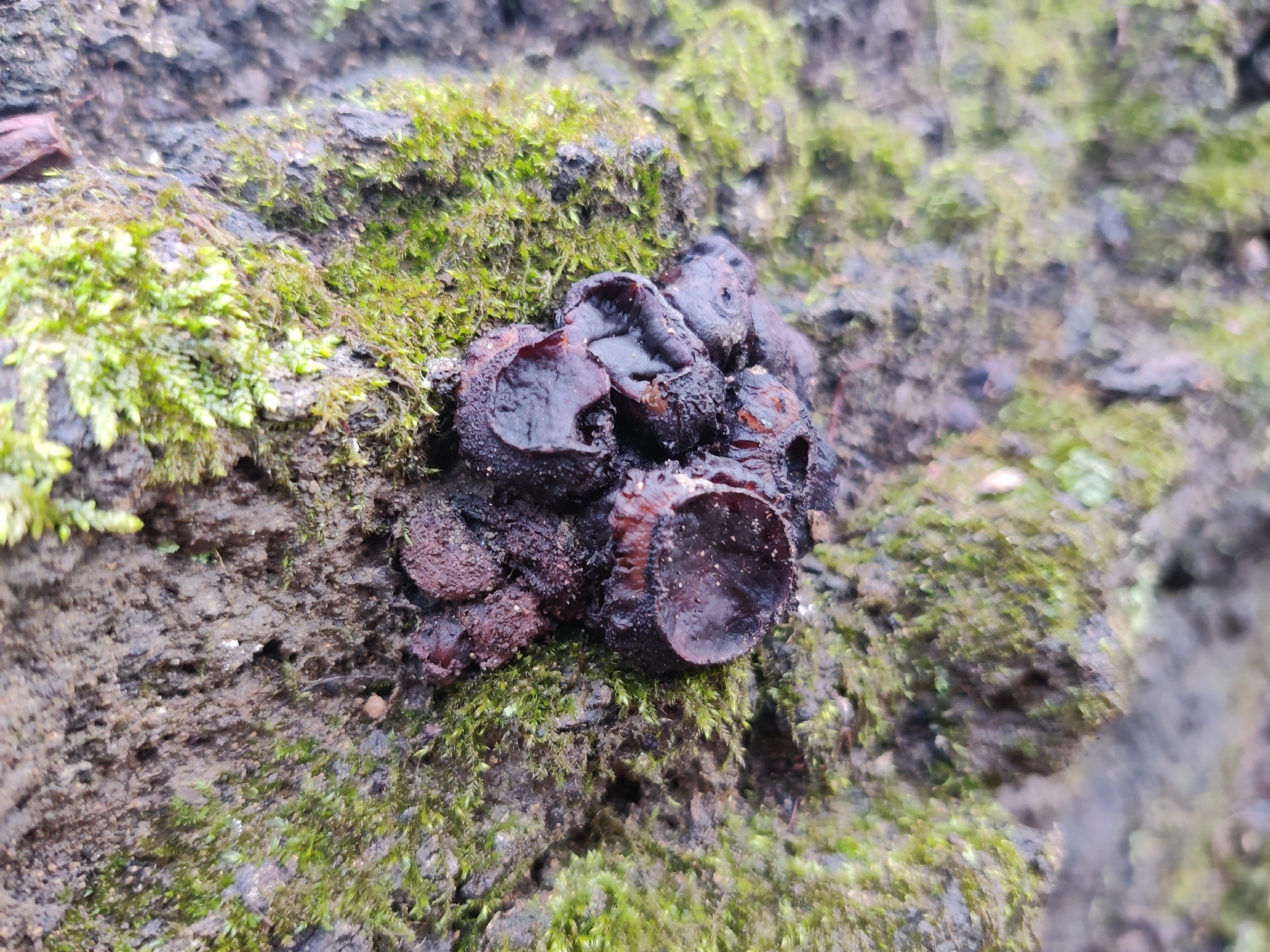 Fruchtkörper: Fruchtkörper gesellig und meist in Büscheln aus der Rinde vorbrechend, anfangs kugelig, später kreisel-, zuletzt tellerförmig, 1—4 cm breit, bis 2 cm hoch, aussen anfangs umbrabraun, runzelig und kleiig bestäubt, später mattschwarz. Scheibe glänzend schwarz.