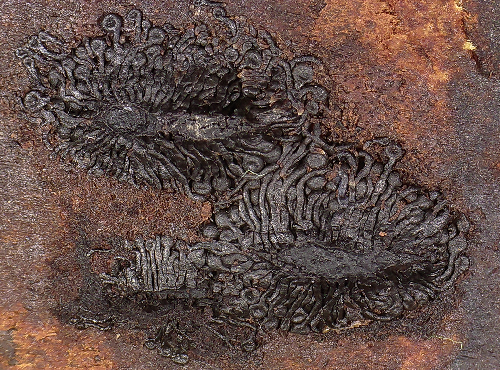 Fruchtkörper: Fruchtkörper in sehr grosser Zahl (an dicken Asten und Stämmen manchmal zu 100 und mehr) dicht aneinander lagernd, kreisförmige oder elliptische, 1—3 cm breite, ein oder mehrere cm lange Häufchen bildend, kugelig, schwarz, kahl, mit sehr langen (bis 5 mm), zusammengeneigten und übereinander lagernden zylindrischen Mündungen, oft bündelweise das Peridiuni durchbohrend.