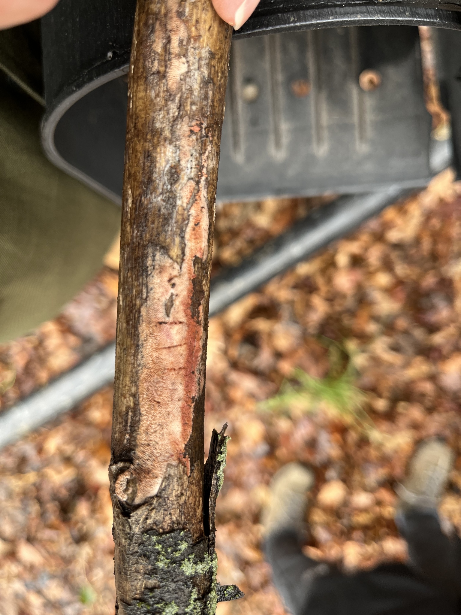 Fruchtkörper: Fruchtkörper ausgebreitet, 5—11 cm lang, dünn, angewachsen, weich und glatt, mit dünnem, nacktem Rande, weisslichfleischfarbig, durch Reiben dunkler werdend.
