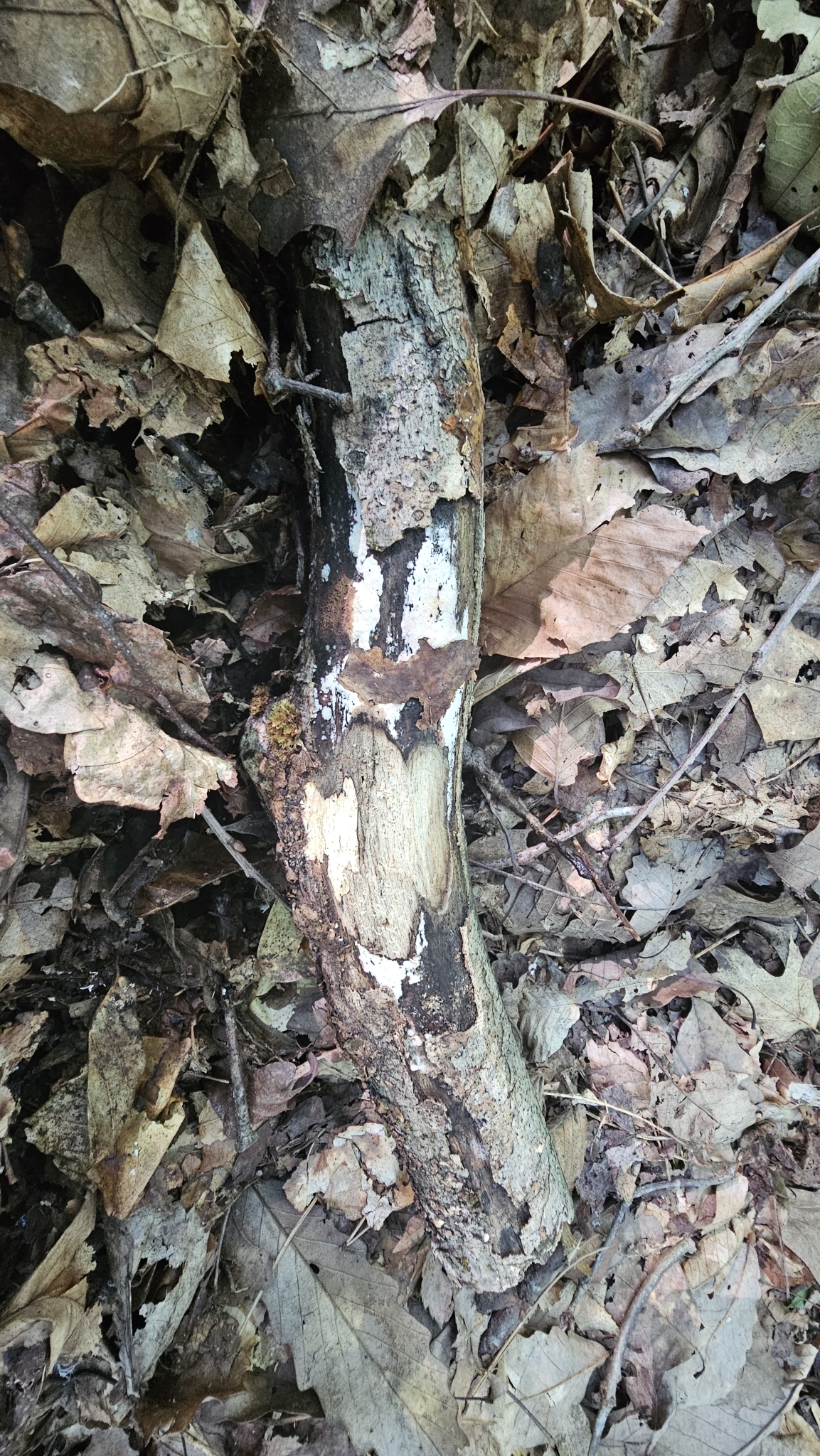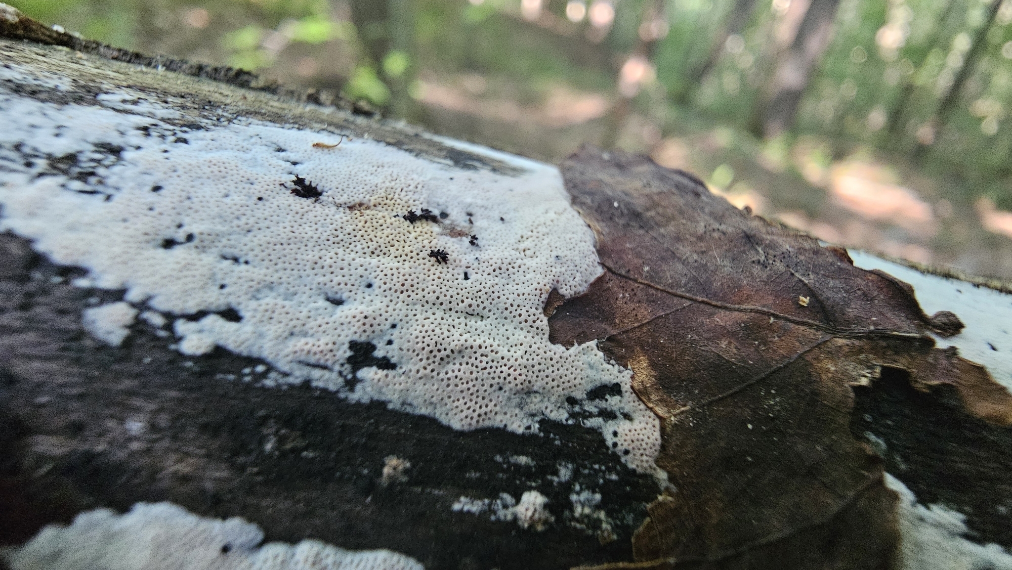 Fruchtkörper: Fruchtkörper weit ausgebreitet, krustenförmig angewachsen, dünn, anfangs weiss, später blass grünlich, mit pulverig- filzigem Rande.