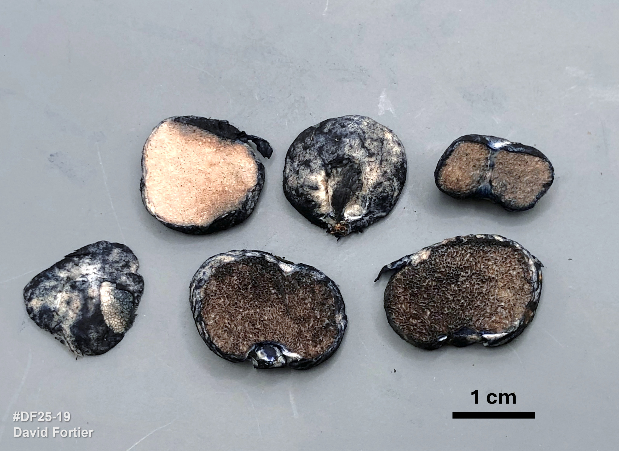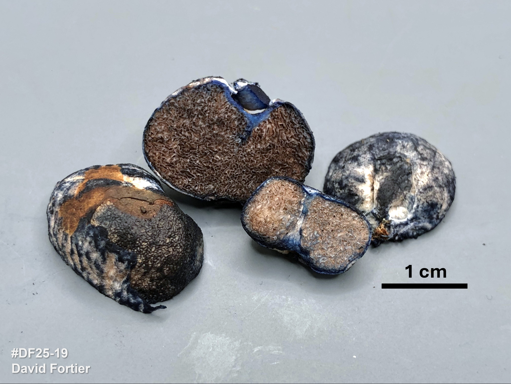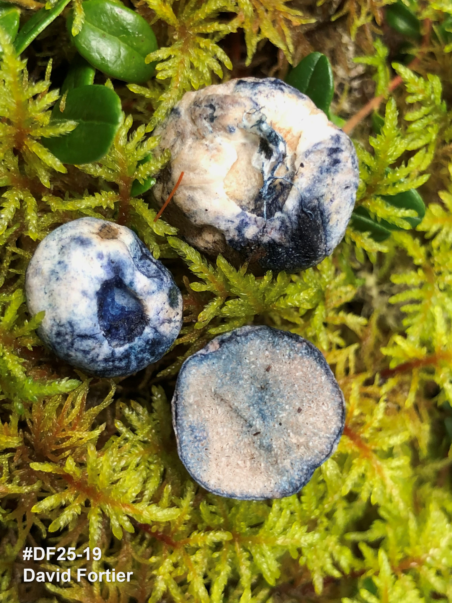 Sporokarpe annähernd kugelförmig, 5-26 x 8-40 mm, die Basis eingedellt und oft mit einer Stiel-Columella, die 2-3 mm dick ist, bis zu 5 mm über die Gleba hinausragt und oft zurückgebogen und an das untere Peridium angelegt ist. Peridium filzig, weiß oder bei gut gereiften Exemplaren olivfarben, färbt sich schnell tiefblau, wenn es freigelegt oder geschnitten wird, leicht ablösbar. Gleba mit labyrinthartigen Hohlräumen, nicht gelatinisiert, in der Jugend weiß und färbt sich blau, wenn sie freigelegt wird, besonders in der Nähe des Peridiums, im reifen Zustand dunkelbraun durch die Sporenmasse auf den Oberflächen der Hohlräume. Stiel-Columella variiert von durchgehend, 2-3 mm dick und ragt aus der Basis des Sporokarps hervor, bis hin zu einem kleinen basalen Polster, das Gewebe ist zunächst weiß, wird später jedoch oft gelb bis blass orangebraun in der Nähe und unterhalb der Basis und färbt sich schnell blau, wenn es freigelegt wird. Geruch angenehm, leicht harzig. Geschmack nicht ausgeprägt. Peridial-Epicutis aus locker verflochtenen bis anliegenden, hyalinen, dünnwandigen Hyphen, 7-9 µm im Durchmesser. Peridial-Subcutis aus mehreren Schichten mehr oder weniger isodiametrischer, hyaliner, dünnwandiger Zellen bis zu 30 µm im Durchmesser, oft in radial ausgerichteten Reihen. Trama aus hyalinen, subparallelen Hyphen, 3-5 µm im Durchmesser, die Wände dünn oder leicht gelatinös verdickt. Subhymenium aus isodiametrischen Zellen. Basidien 4-sporig, 32-38 x 15-20 µm. Zystidien fehlen. Klammerverbindungen fehlen. Sporen breit ellipsoid, 13-22 x 10-16 µm, ohne die Ornamentierung aus 6-14 geraden bis spiraligen, oft gegabelten, dunkelbraunen, längs verlaufenden Graten, 3-5 µm hoch, die seitlichen Ränder der Grate sind ausgefranst, die Grate treffen sich nicht an der Sporenapex, sterigmale Verbindung ca. 1 x 2 µm.
