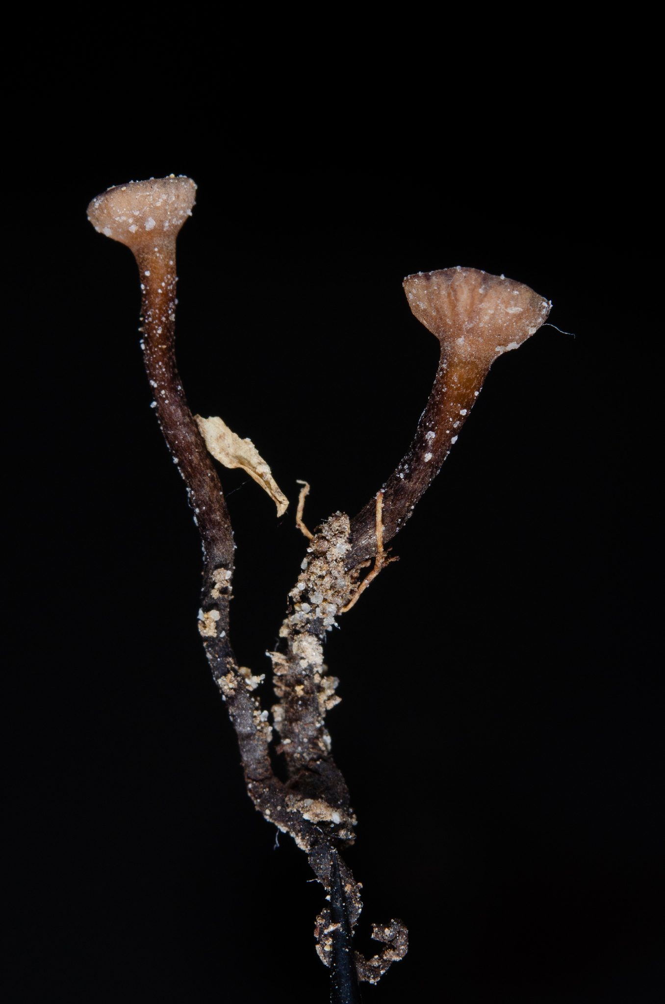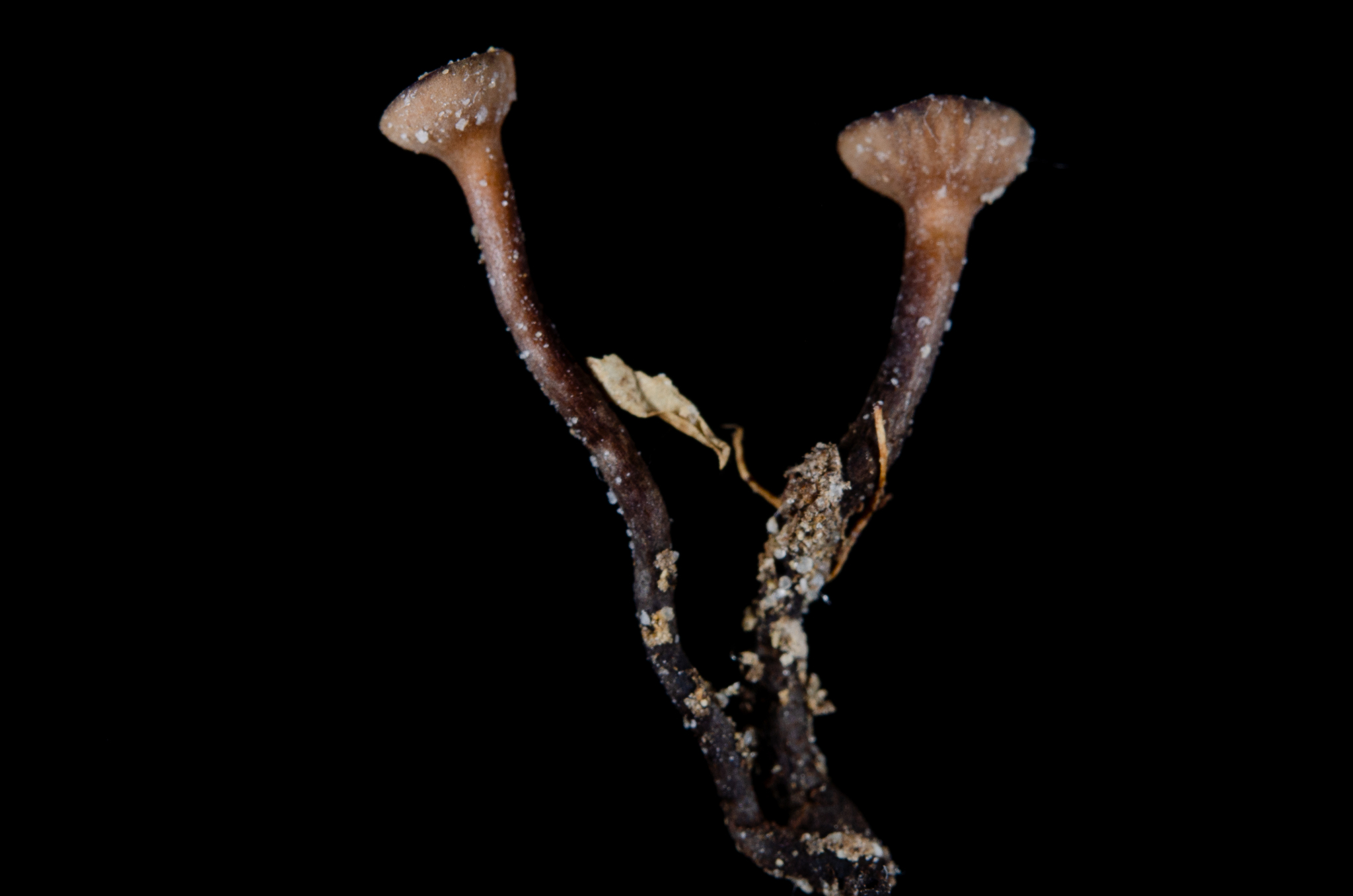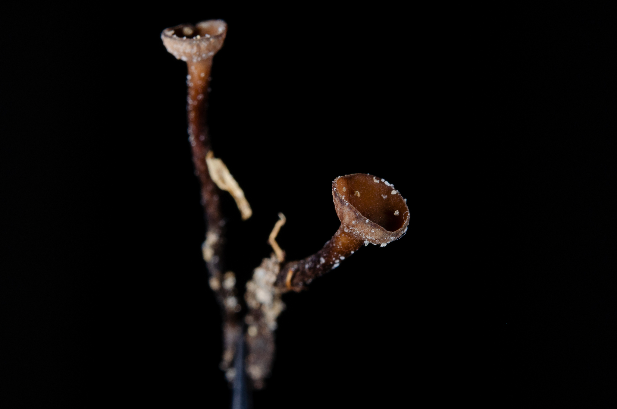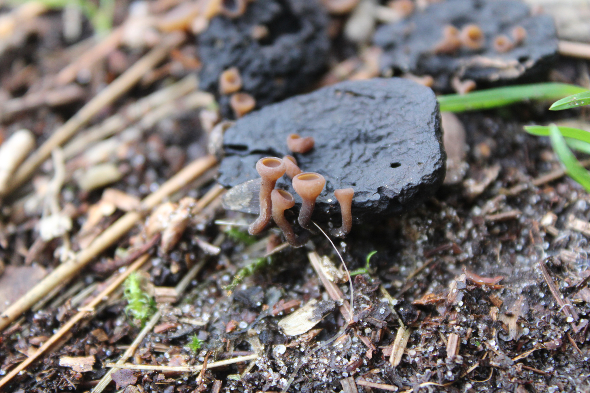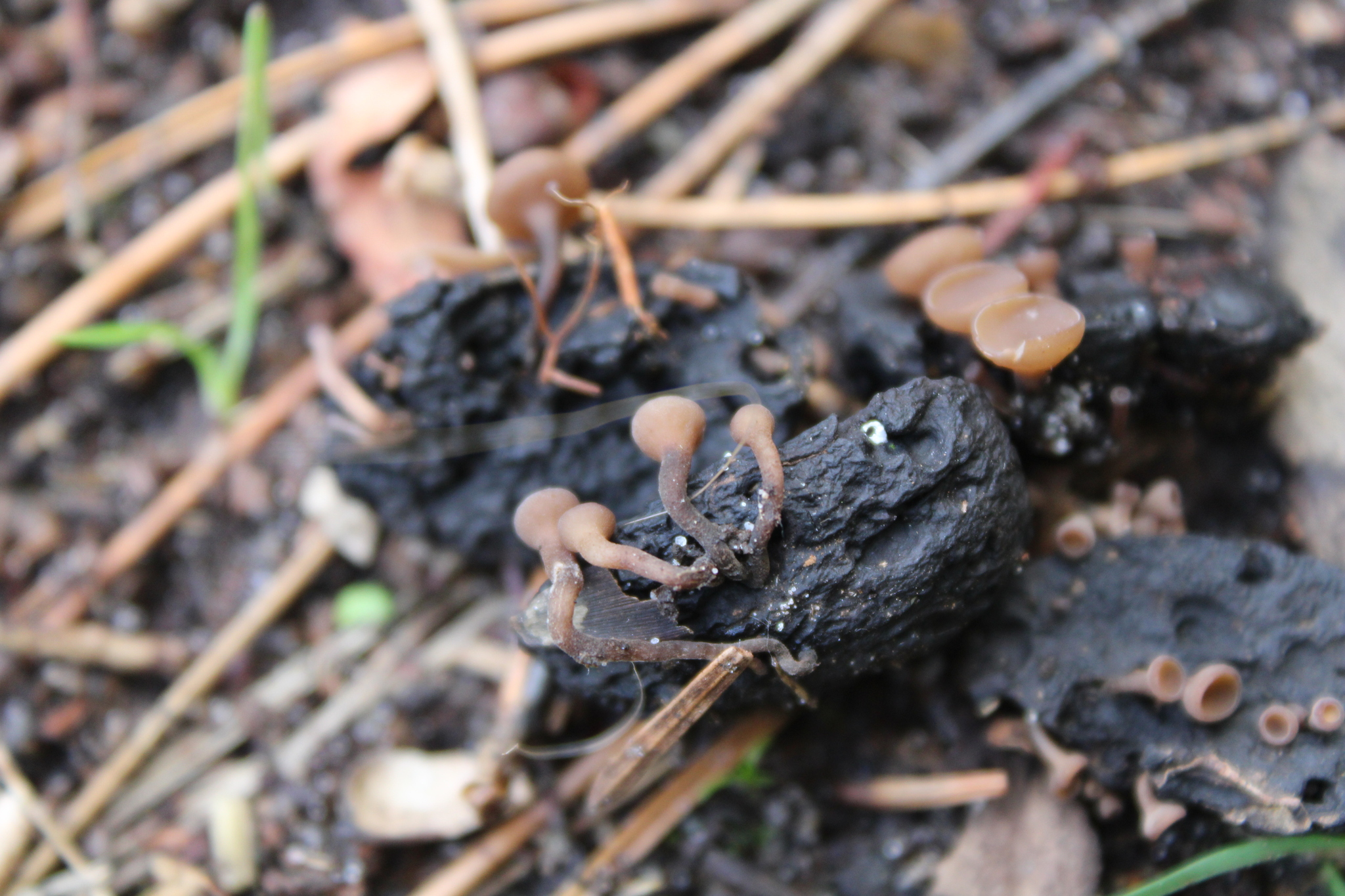 Fruchtkörper: Apothecien gesellig, auf verbreitet schwarz verfärbten Kotyledonen sitzend, durch das Pericarpium hervorbrechend, zuerst kugelig geschlossen, kelchförmig, rundlich sich öffnend und die krug-, dann trichter-, zuletzt schüsseiförmige, zart berandete, zimmetbraune Fruchtscheibe entblössend, in einen 0,3—3 cm langen, 1—1,5 mm breiten, nach unten schwärzlichen Stiel verschmälert, 2—7 mm breit, aussen etwas dunkler olivenbraun, anfänglich rauh, später glatt, trocken am Rand eingerollt und verbogen, aussen etwas flaumig, oft weisslich bestäubt und der Stiel etwas gefurcht, wachsartig fest.