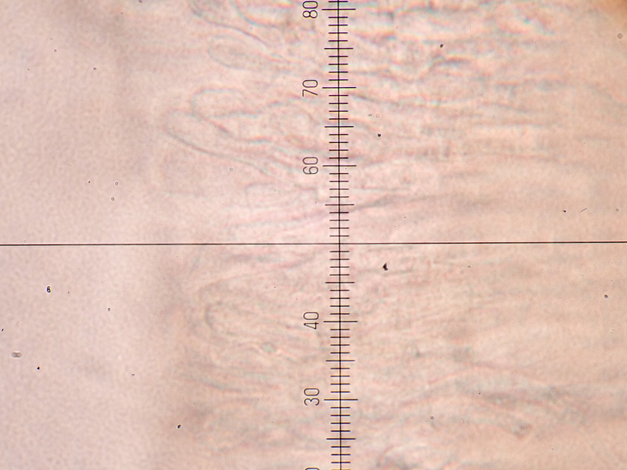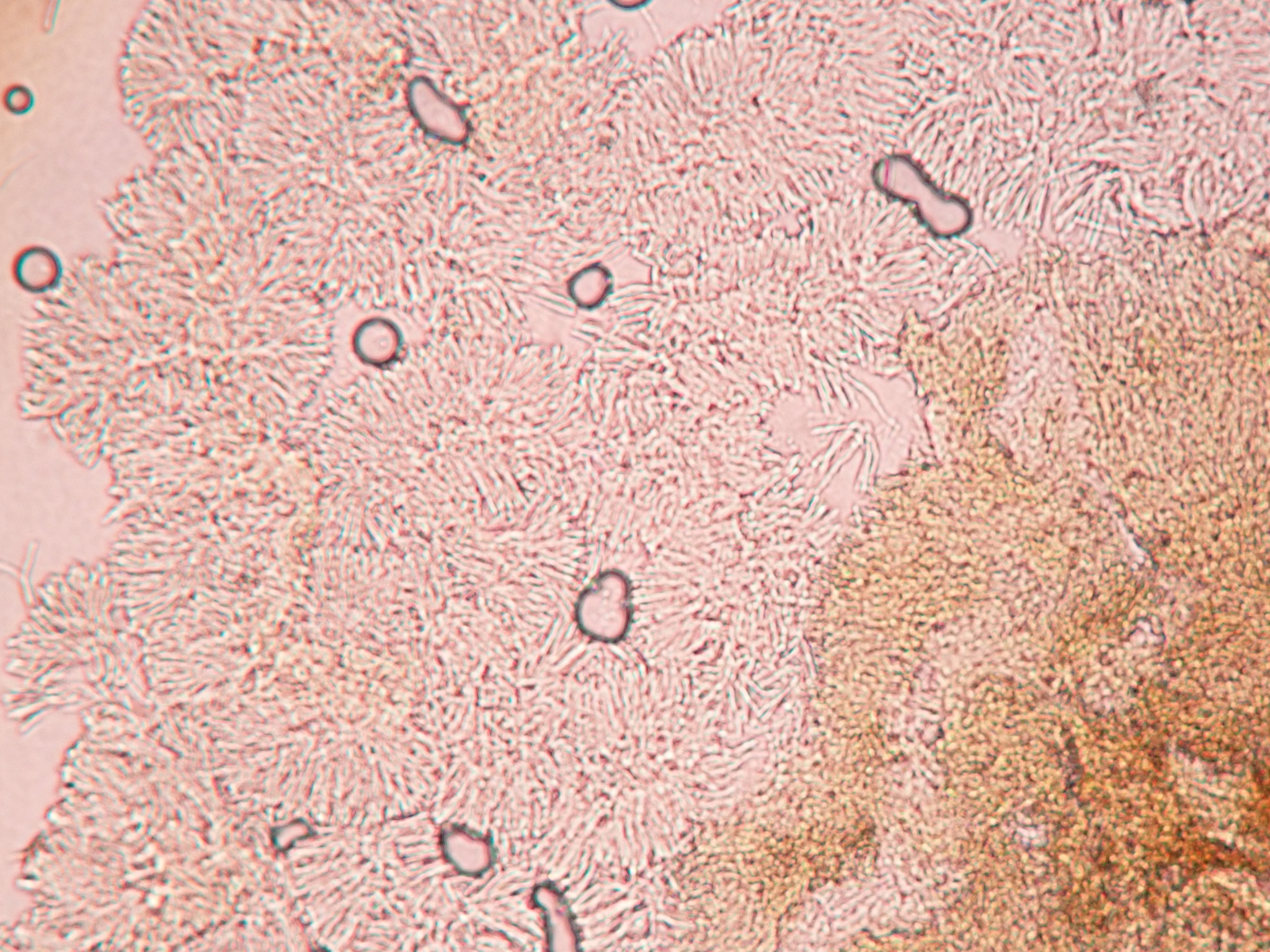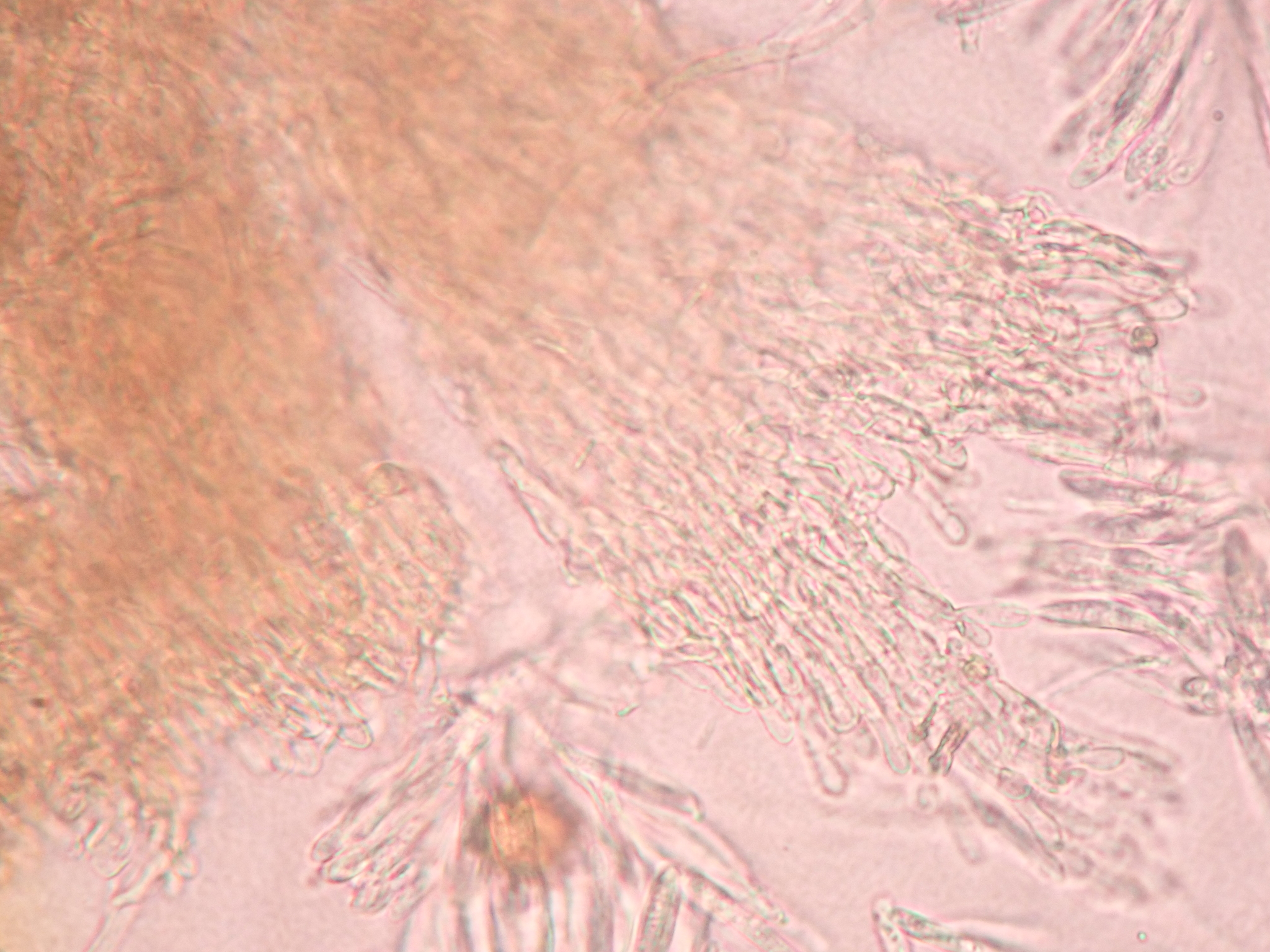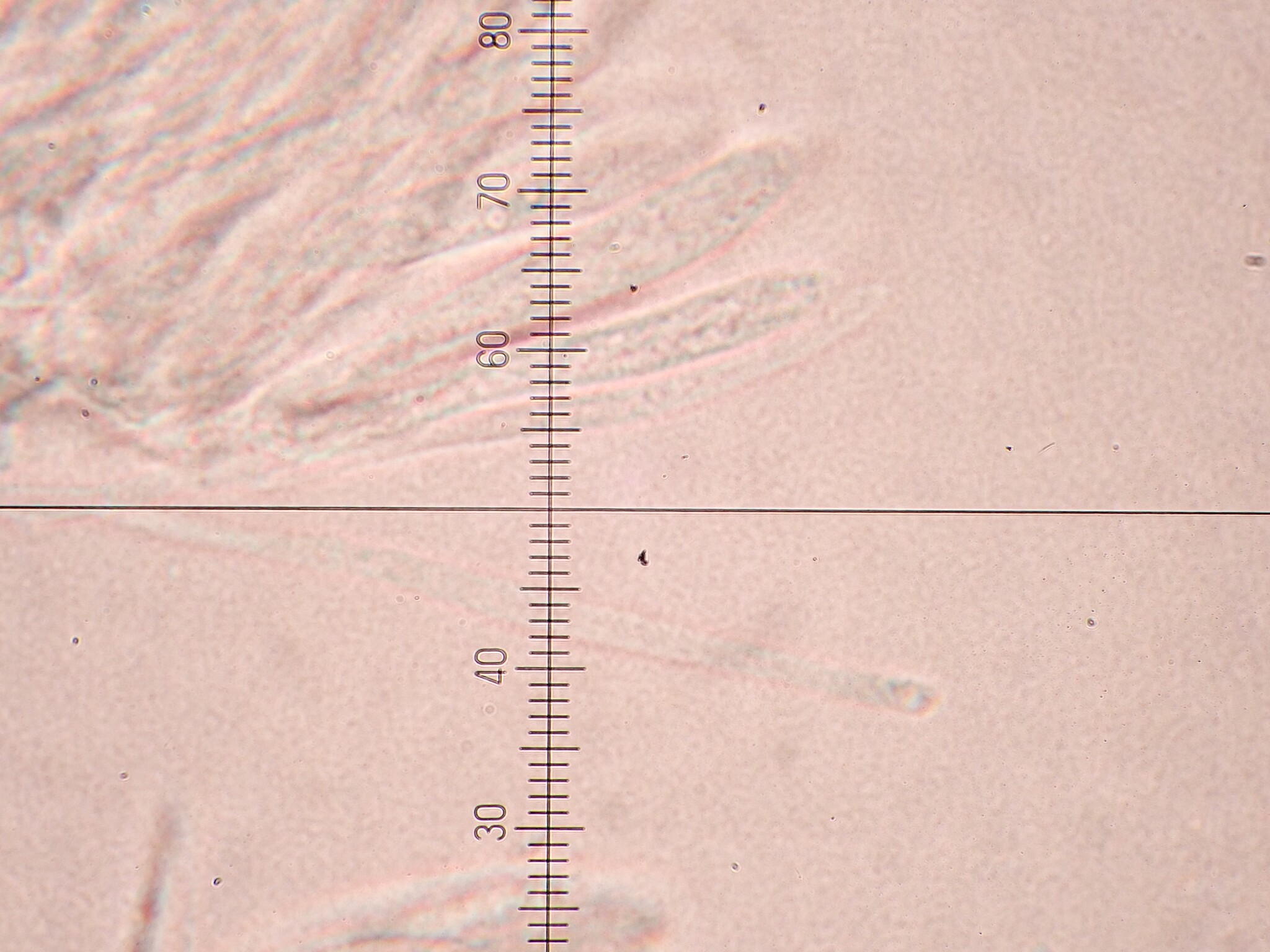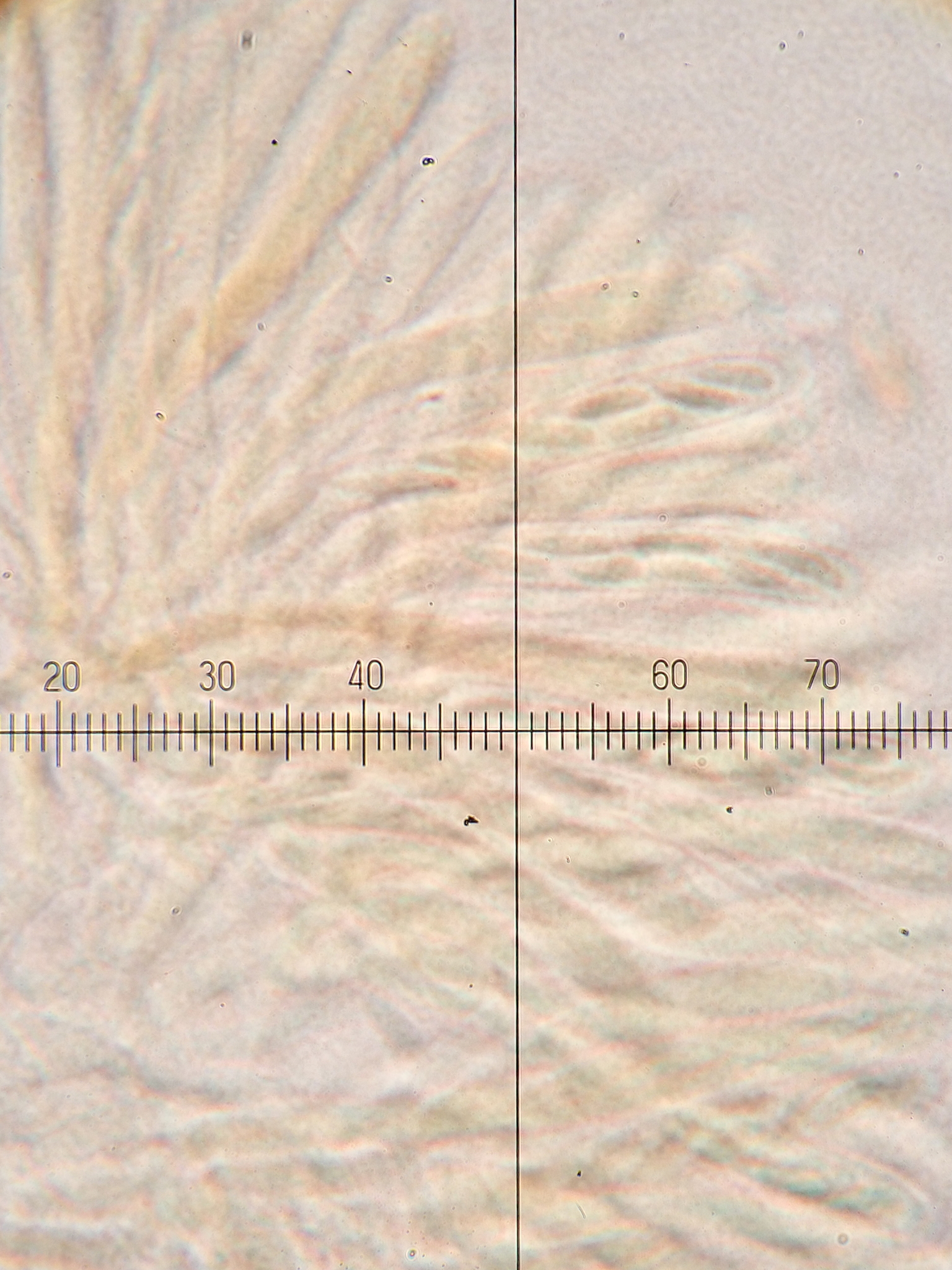 Sporen: Schläuche keulenförmig, oben abgerundet, 25—40 µm lang, 4—5 µm breit, achtsporig. Sporen zweireihig, ellipsoidisch oder eiförmig, 4—7 µm lang, 1,5—2,5 µm breit. Paraphysen fadenförmig, 2 µm breit.