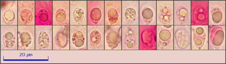 Sporen: 7-10 µm lang, 4-5,5 µm breit mit undeutlichen Schnallen an der Basidenbasis.
